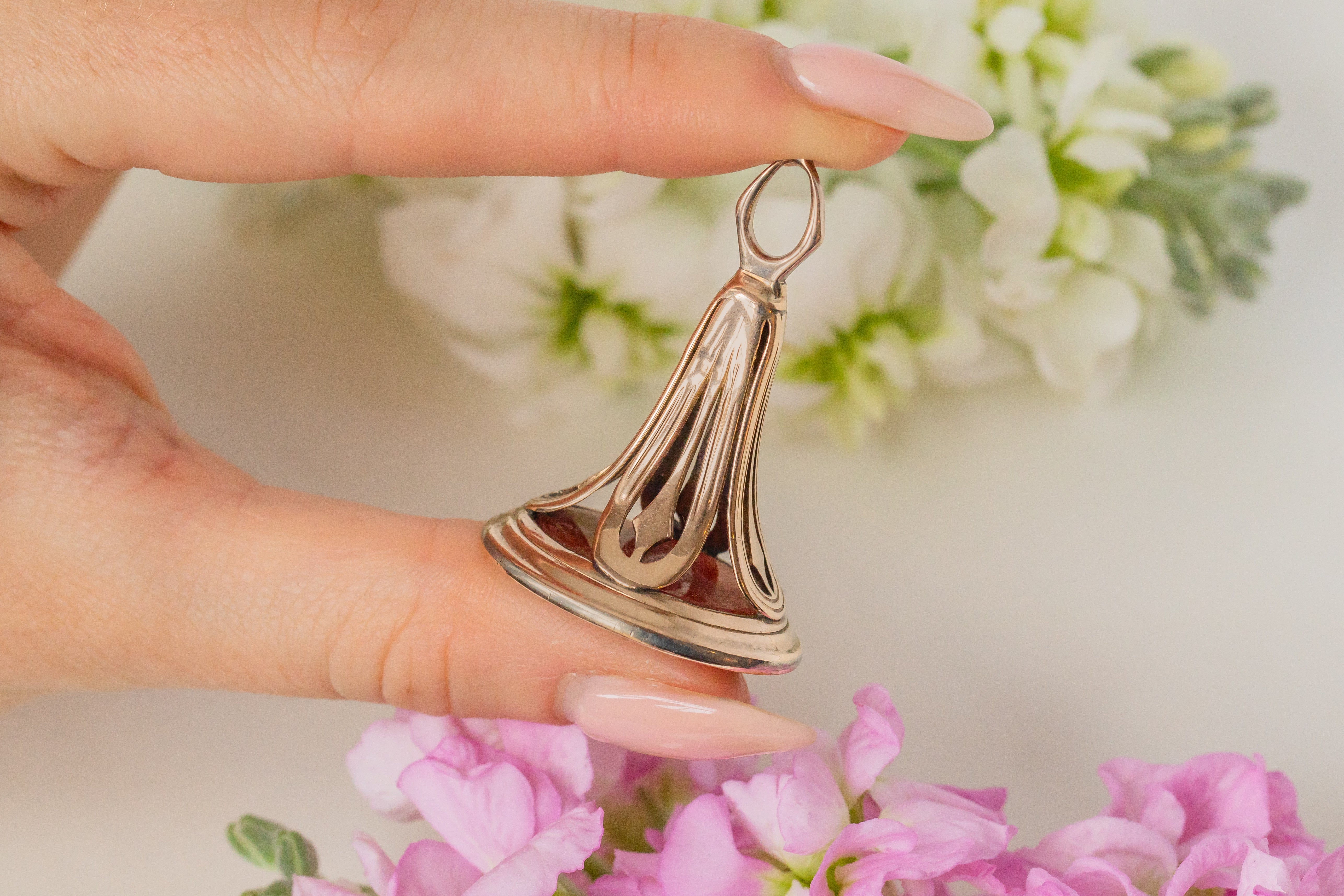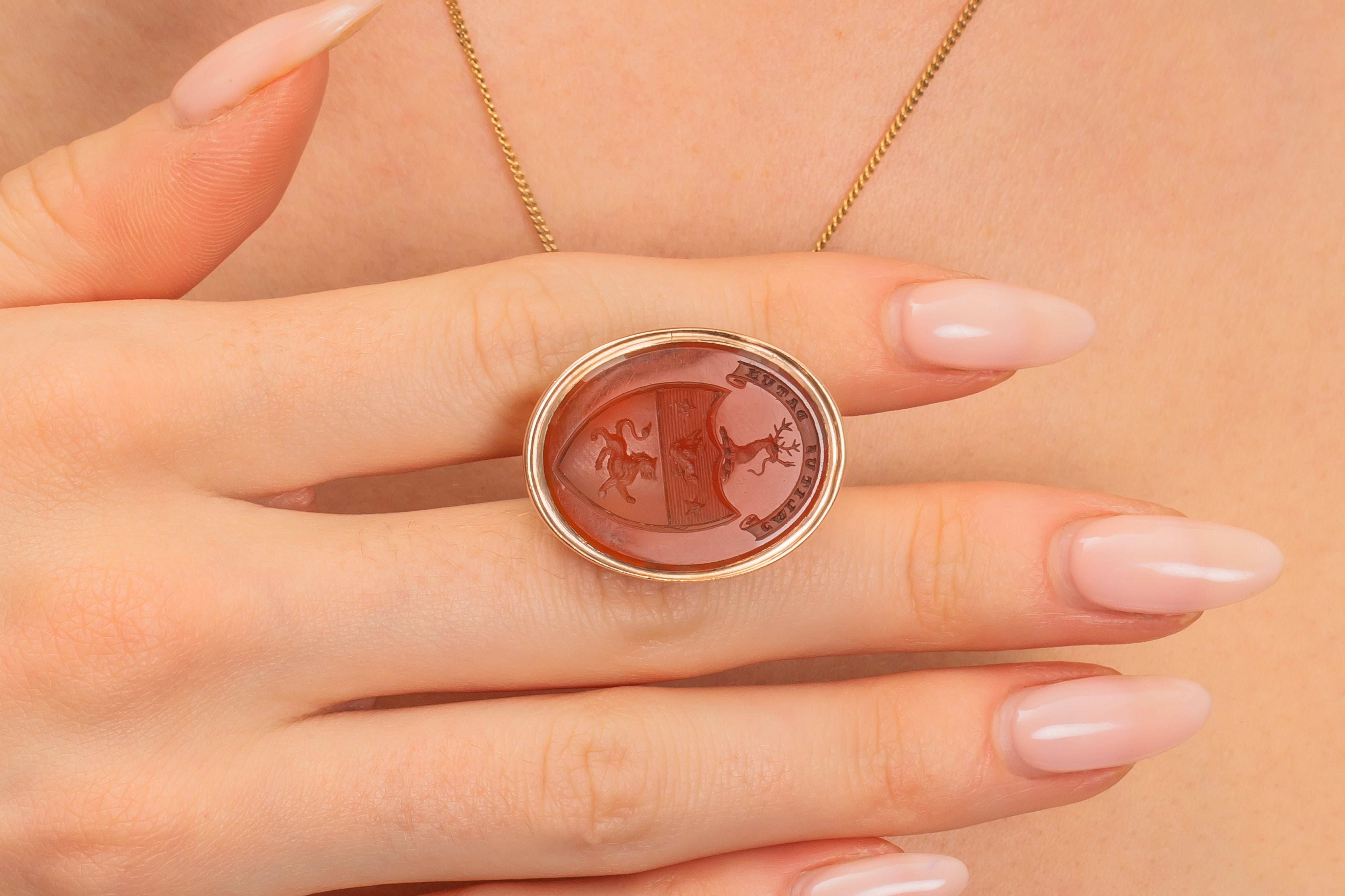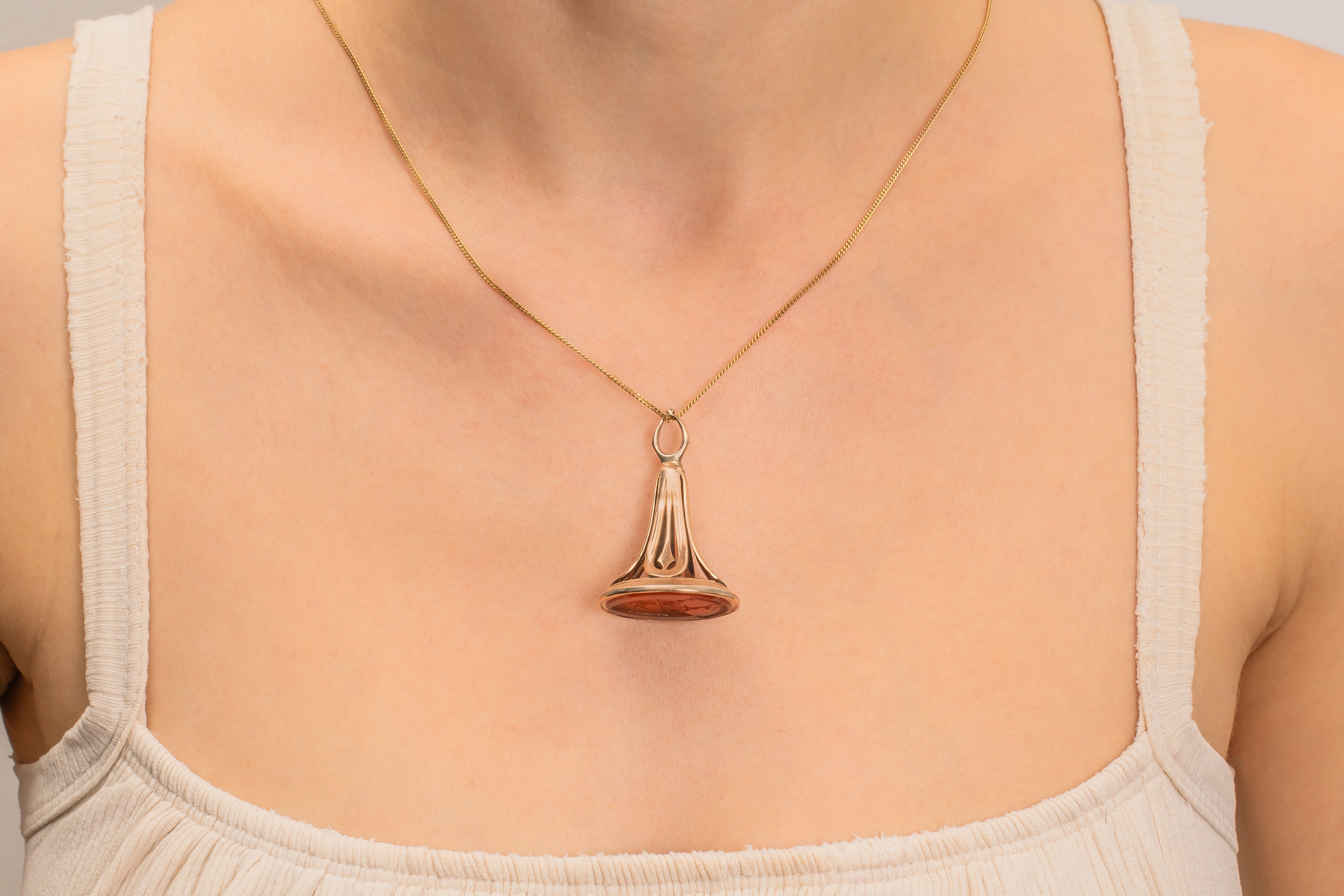VERY GOOD TO EXCELLENT. This Georgian 9ct Gold Carnelian intaglio pendant is in superb condition. The meticulously carved crest has stood the test of time, free of both chips and scratches. The piece has lasted very well through time, and the loop at the top leaves her open to being strung onto a Gold chain of your choosing! There are some remnants of the original antique wax within the intaglio, however this is nothing to worry about and truthfully, not noticeable when worn, plus, it is a clear illustration that this piece has been loved and worn for over 200 years!