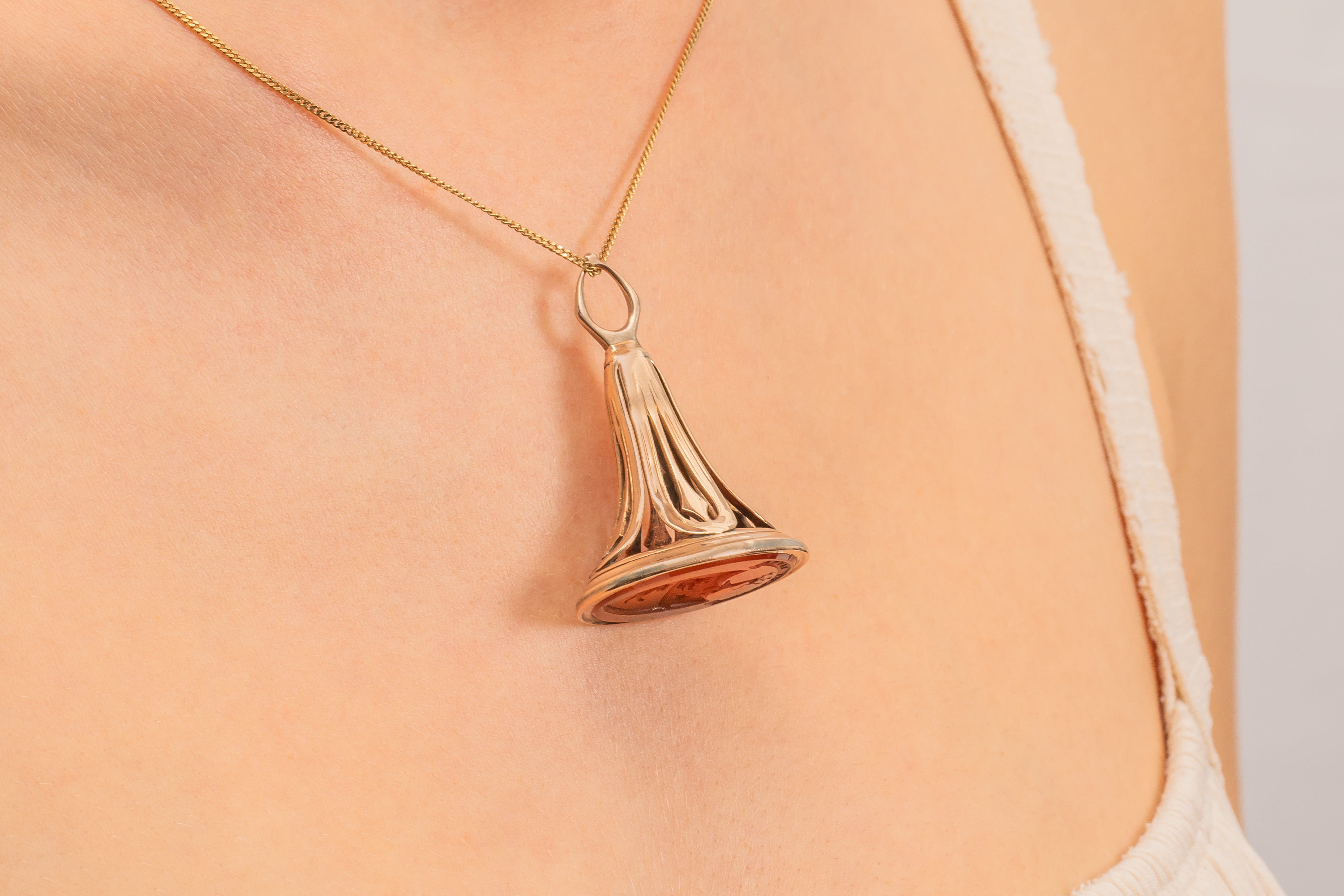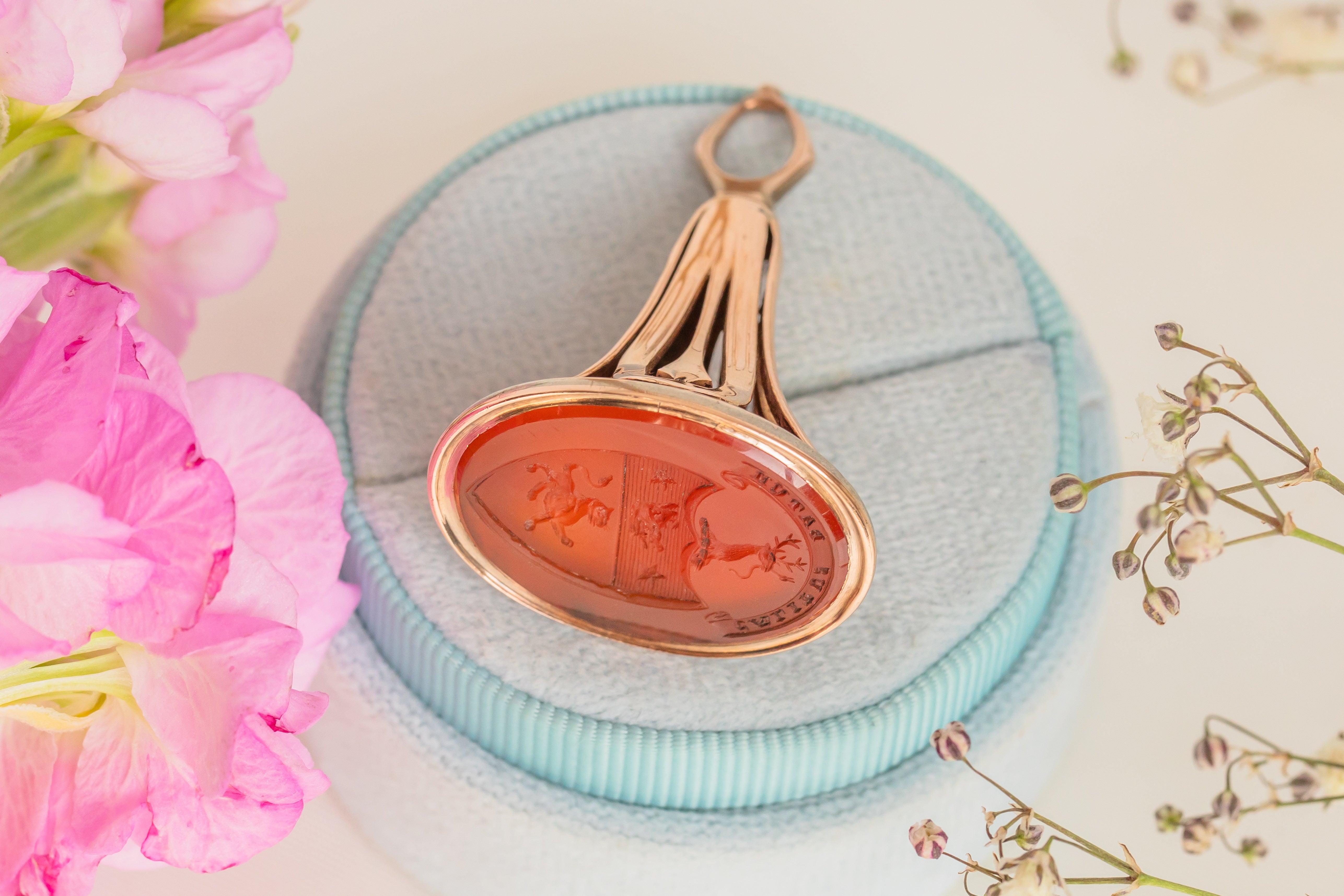 This Georgian 9ct Gold Carnelian intaglio pendant is an exceptionally beautiful piece steeped in history. Complete with a clear-cut shield crest with a lion, deer, snake and cupid intaglio, you can marvel at this incredible fob for hours on end.
