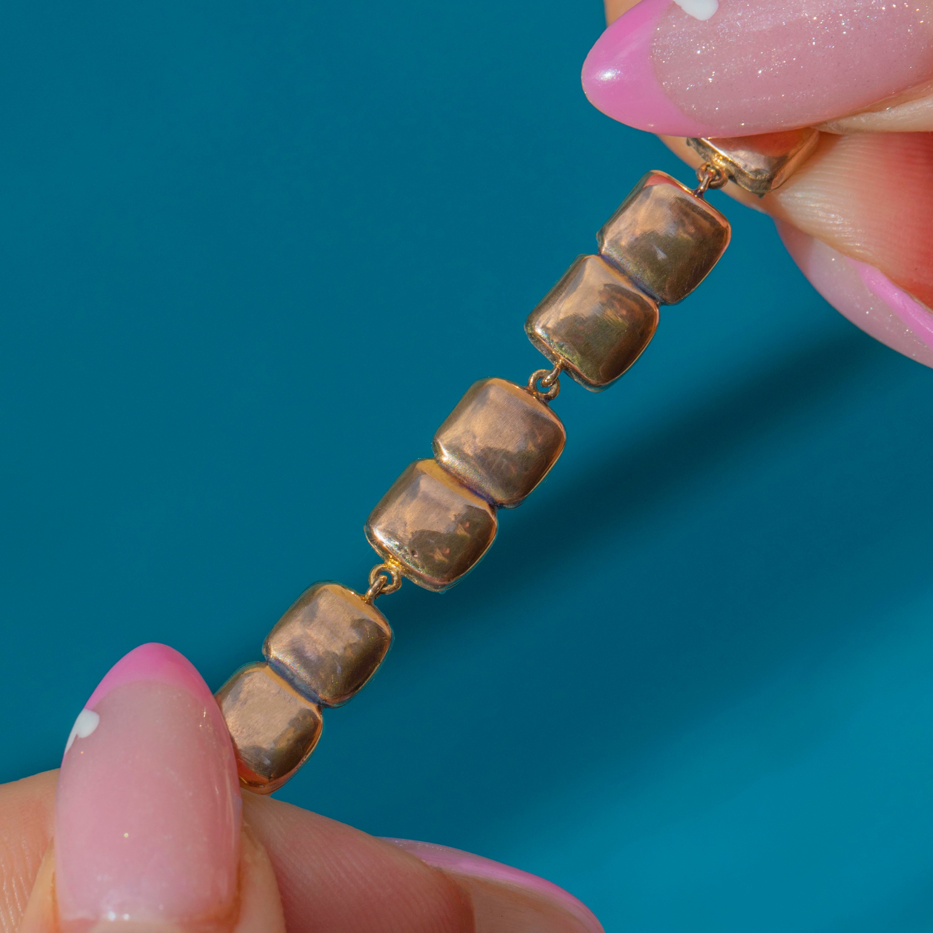 A beautiful Georgian bracelet crafted in 15ct Gold, set with a continuous row of foiled flat-cut Garnets. The stones glow with a rich, velvety red tone and subtle inner light, a hallmark of Georgian craftsmanship. Each Garnet is individually hand-set in traditional piecrust settings with closed-backs providing comfortable wear.