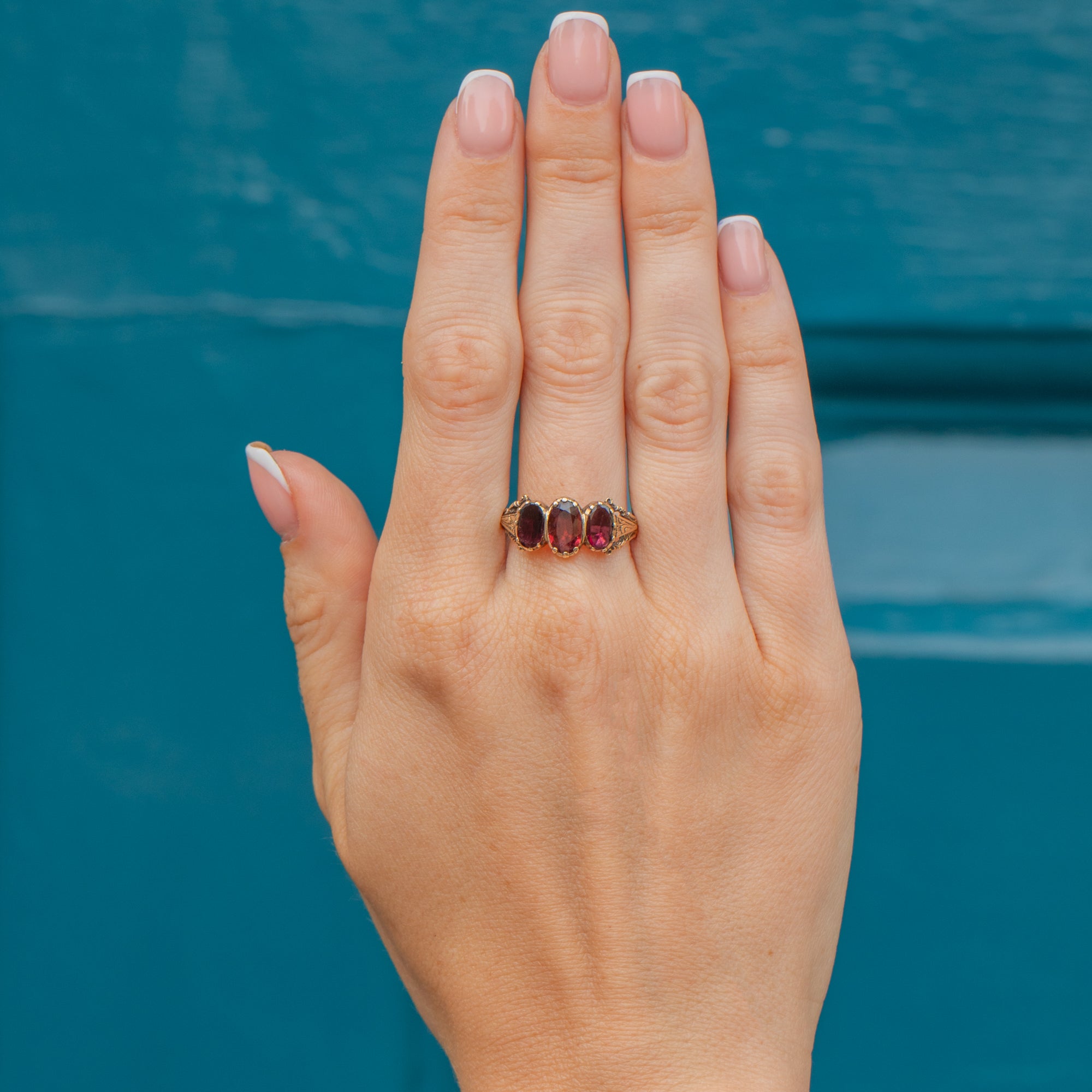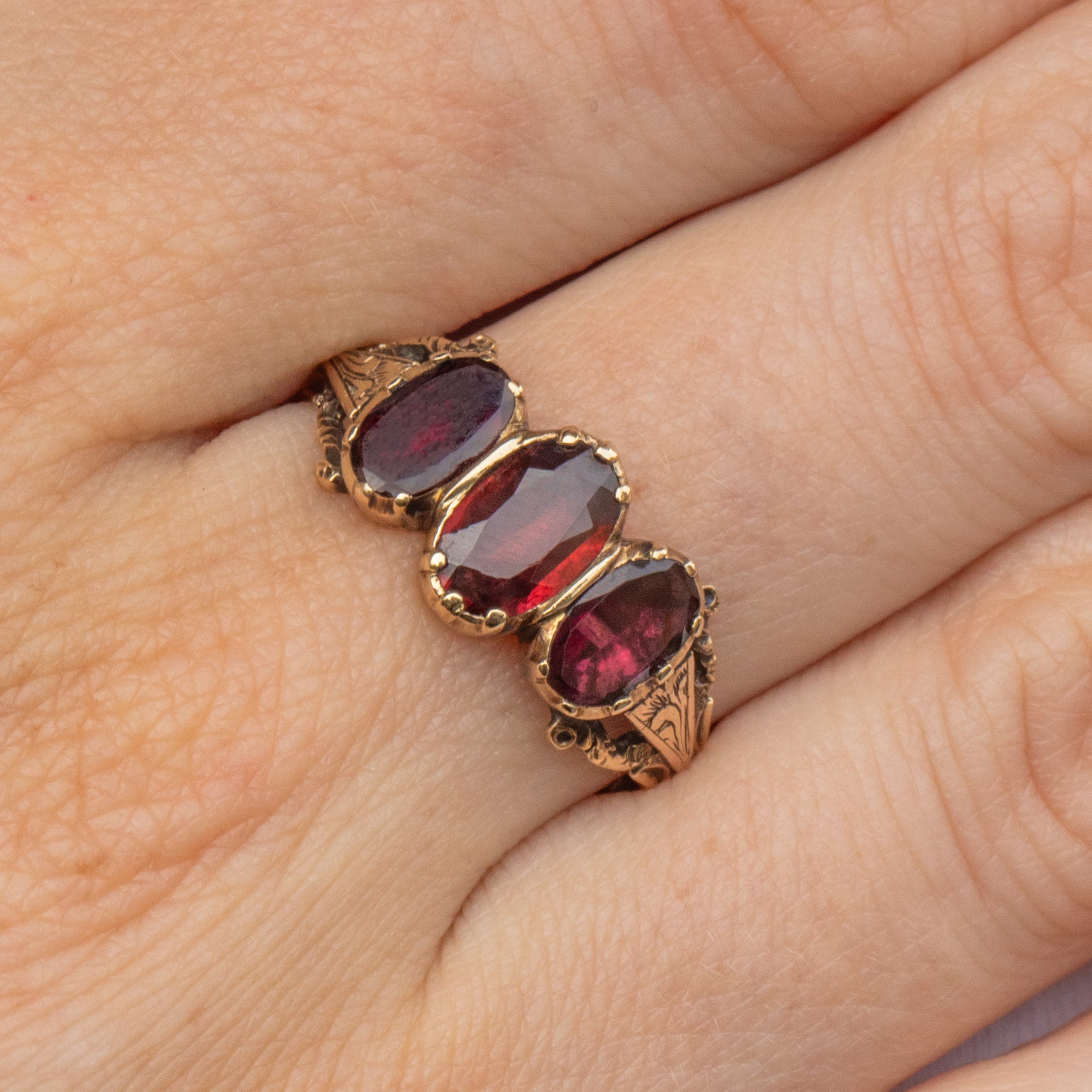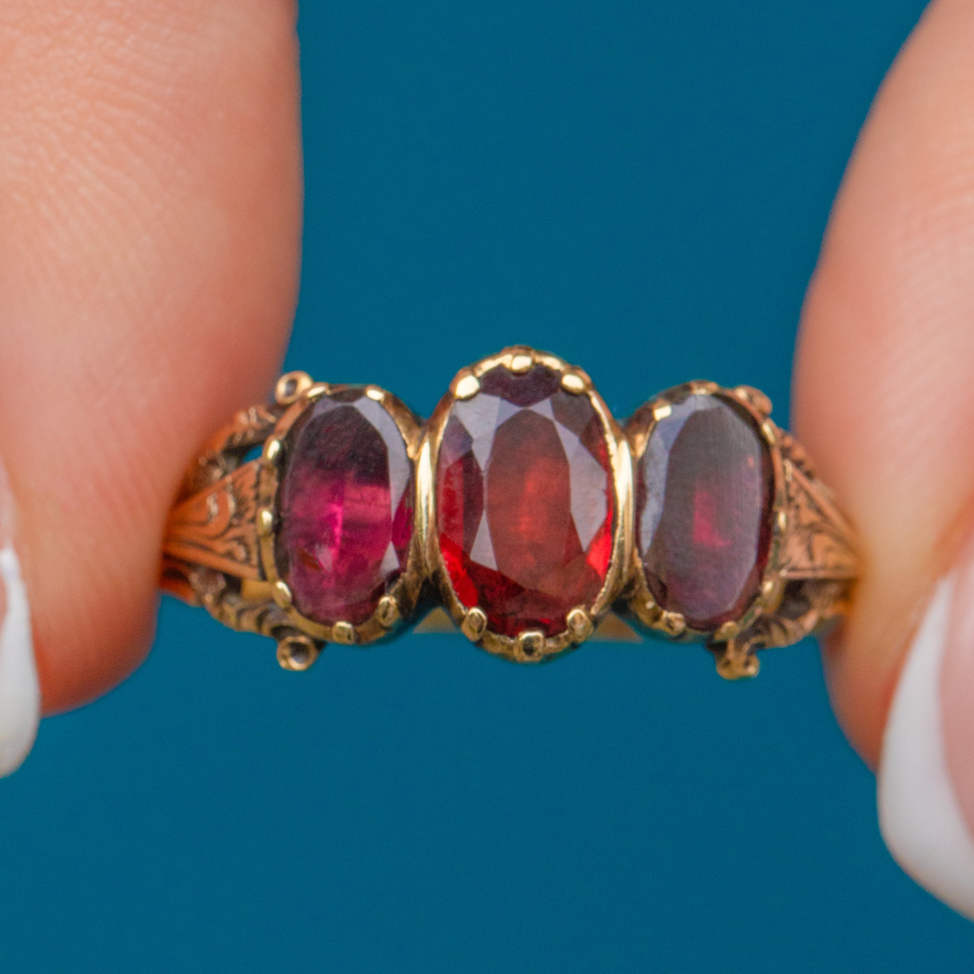 This delectable Georgian 15ct Gold Flat-Cut Garnet ring was made for adoration! Three deep-red wine Garnets are poised centre stage, with flickers of light beaming from their flat-cut facets.