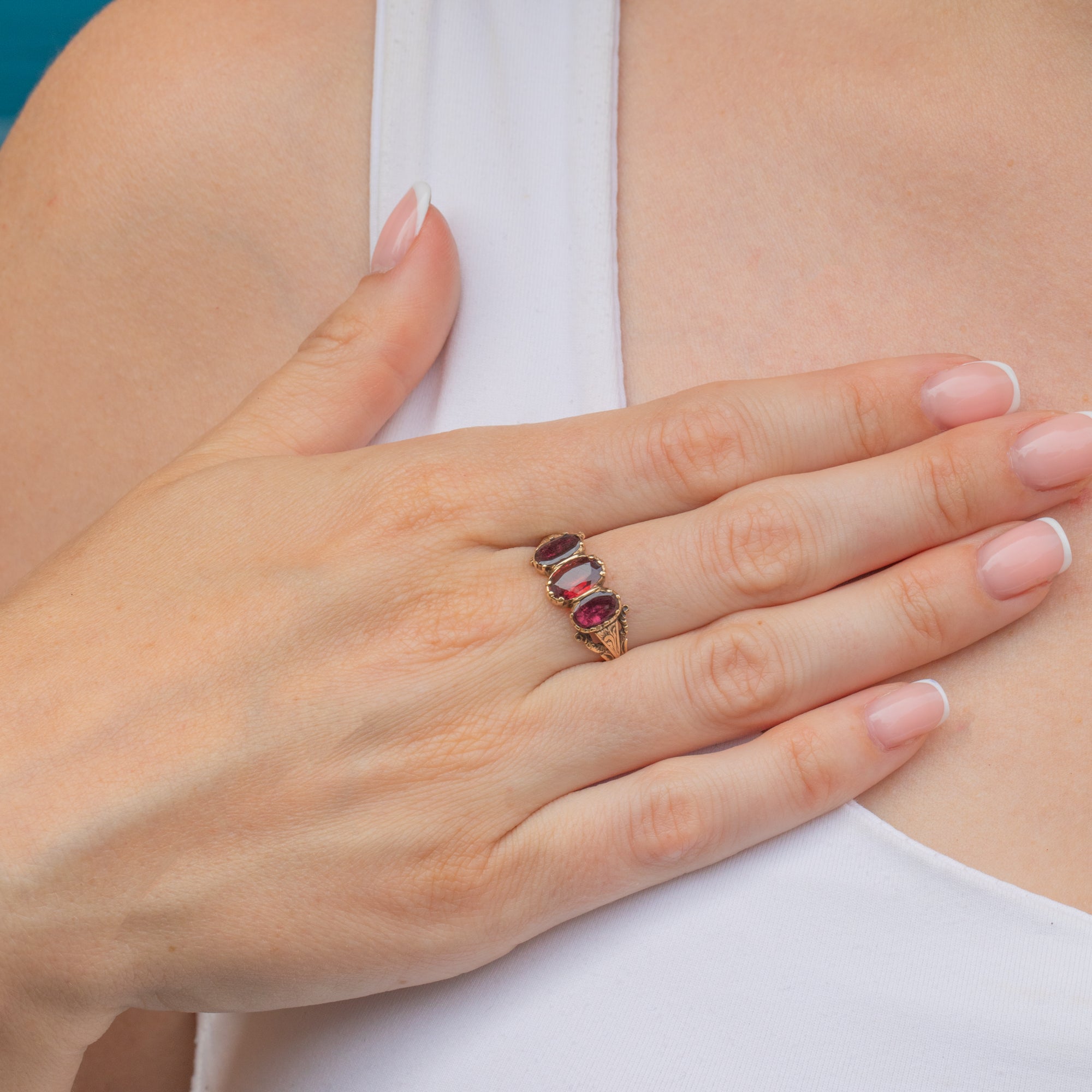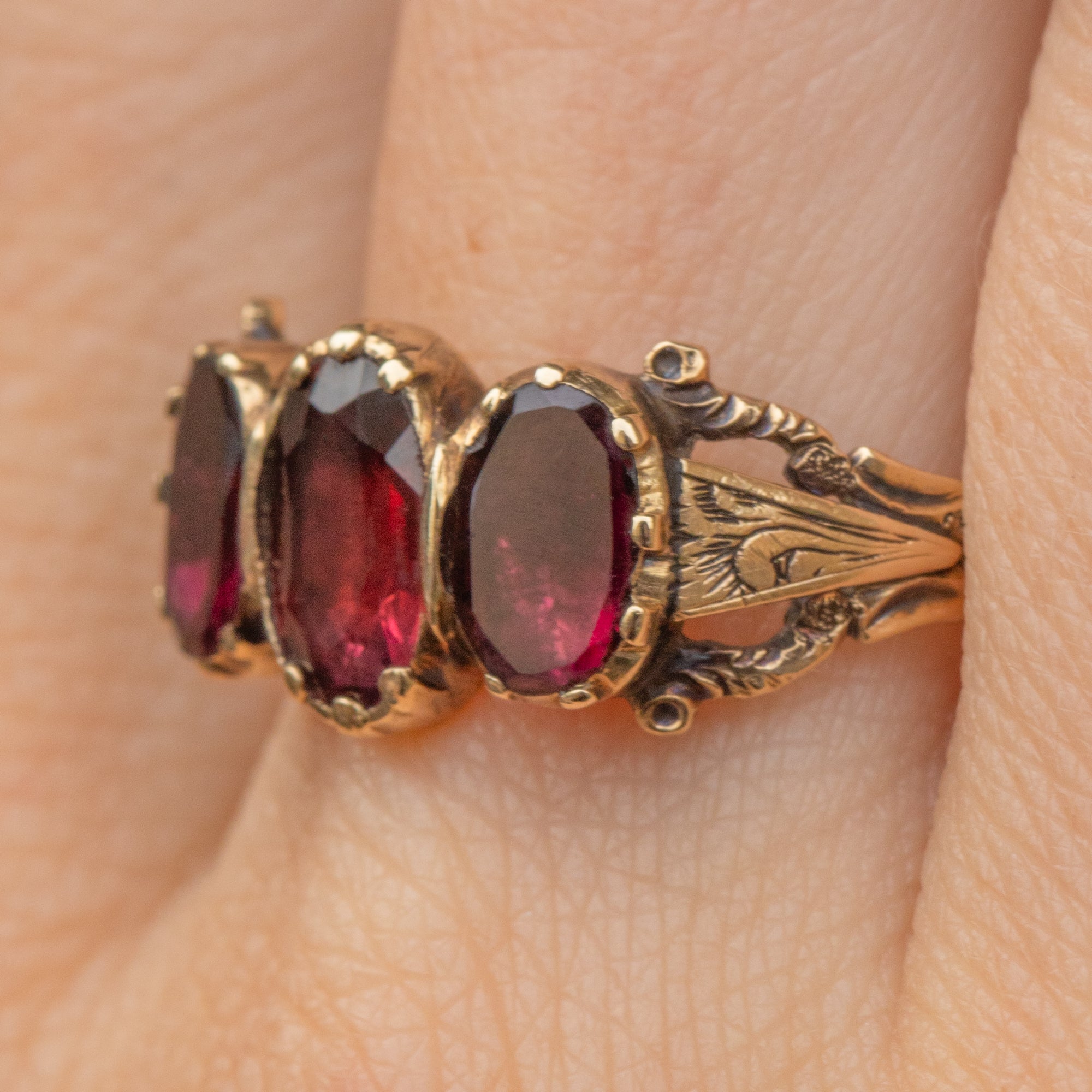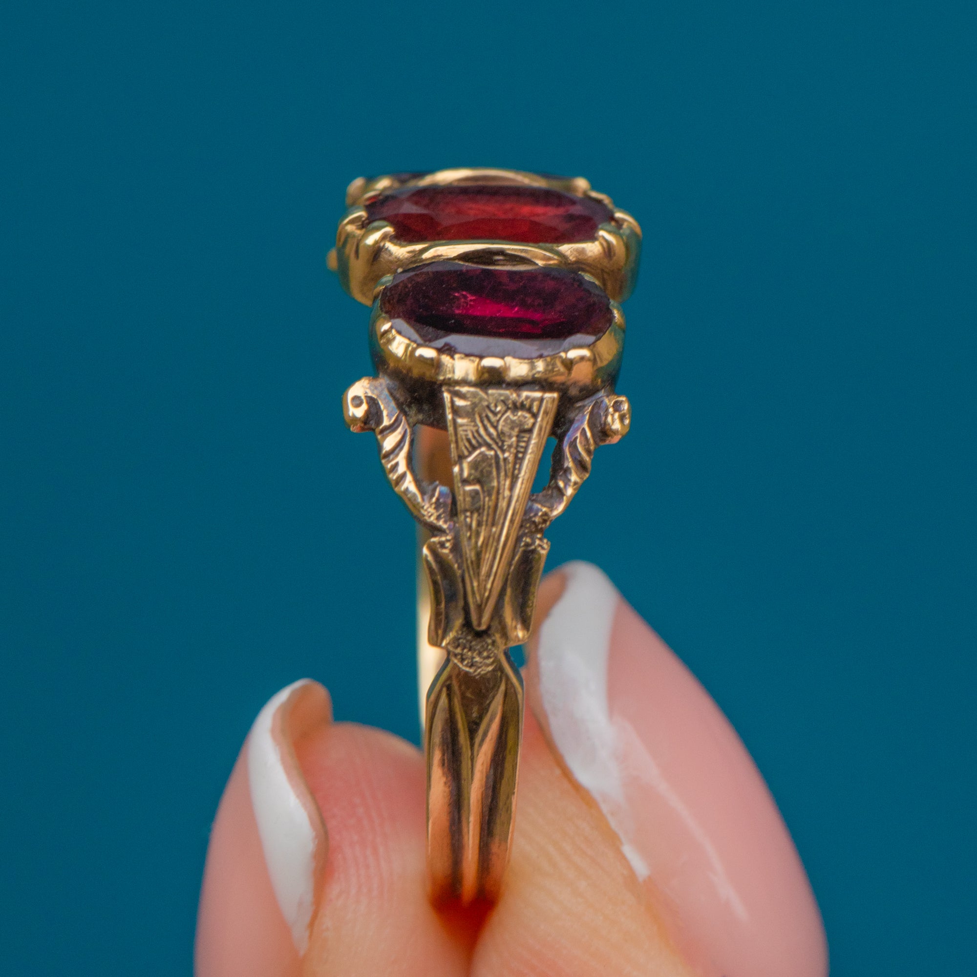 This delectable Georgian 15ct Gold Flat-Cut Garnet ring was made for adoration! Three deep-red wine Garnets are poised centre stage, with flickers of light beaming from their flat-cut facets.