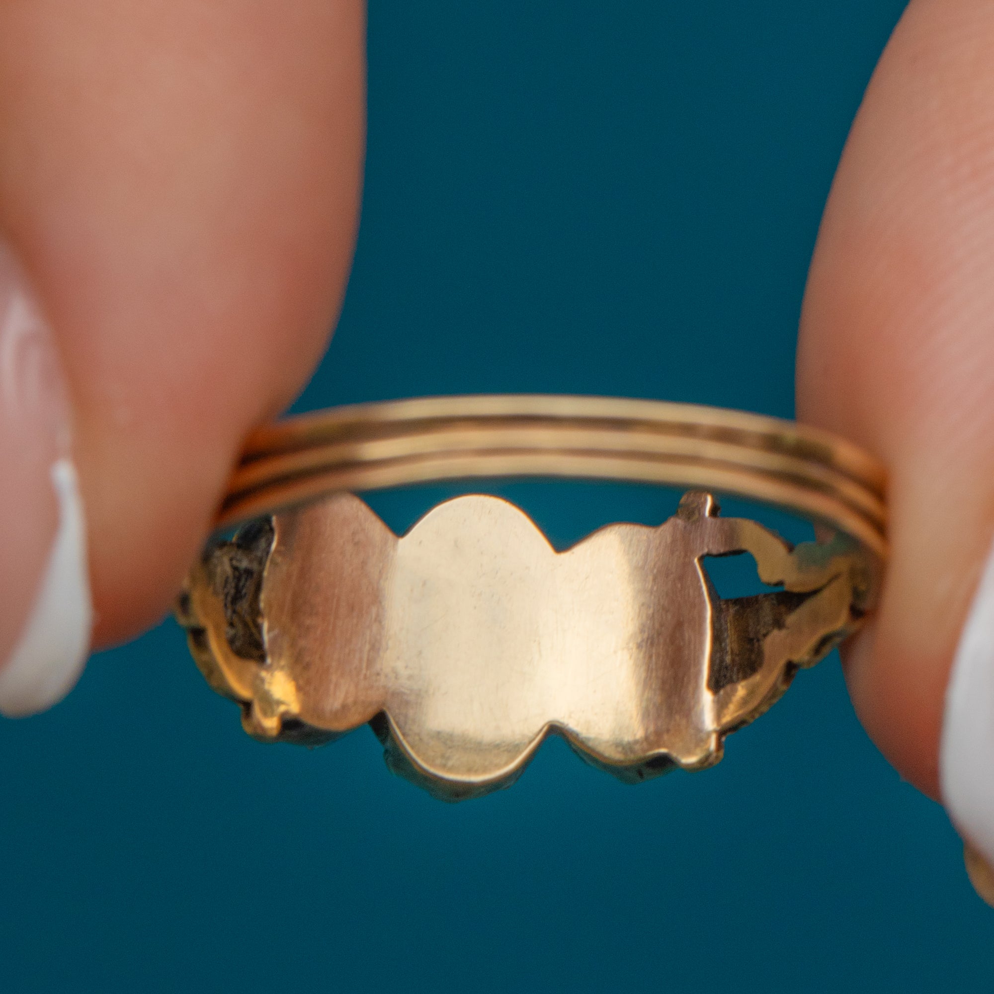 EXCELLENT This Georgian 15ct Gold Flat-Cut Garnet Ring is in wonderful condition. Her berry red Garnets are beautifully faceted in flat-cut style and have retained their cranberry tones over the years. They are expertly set in their 15ct Gold setting, which allows for confident, secure wear. The ring band has no visible signs of resizing, and sits comfortably on the finger.