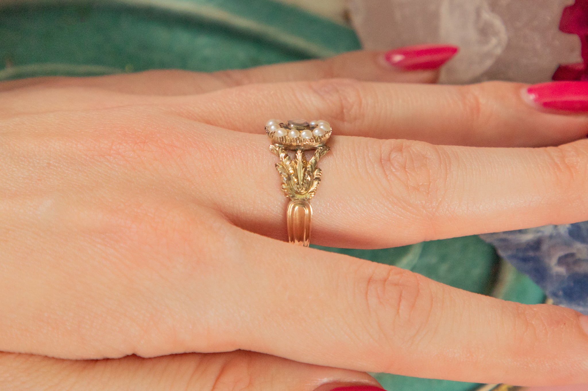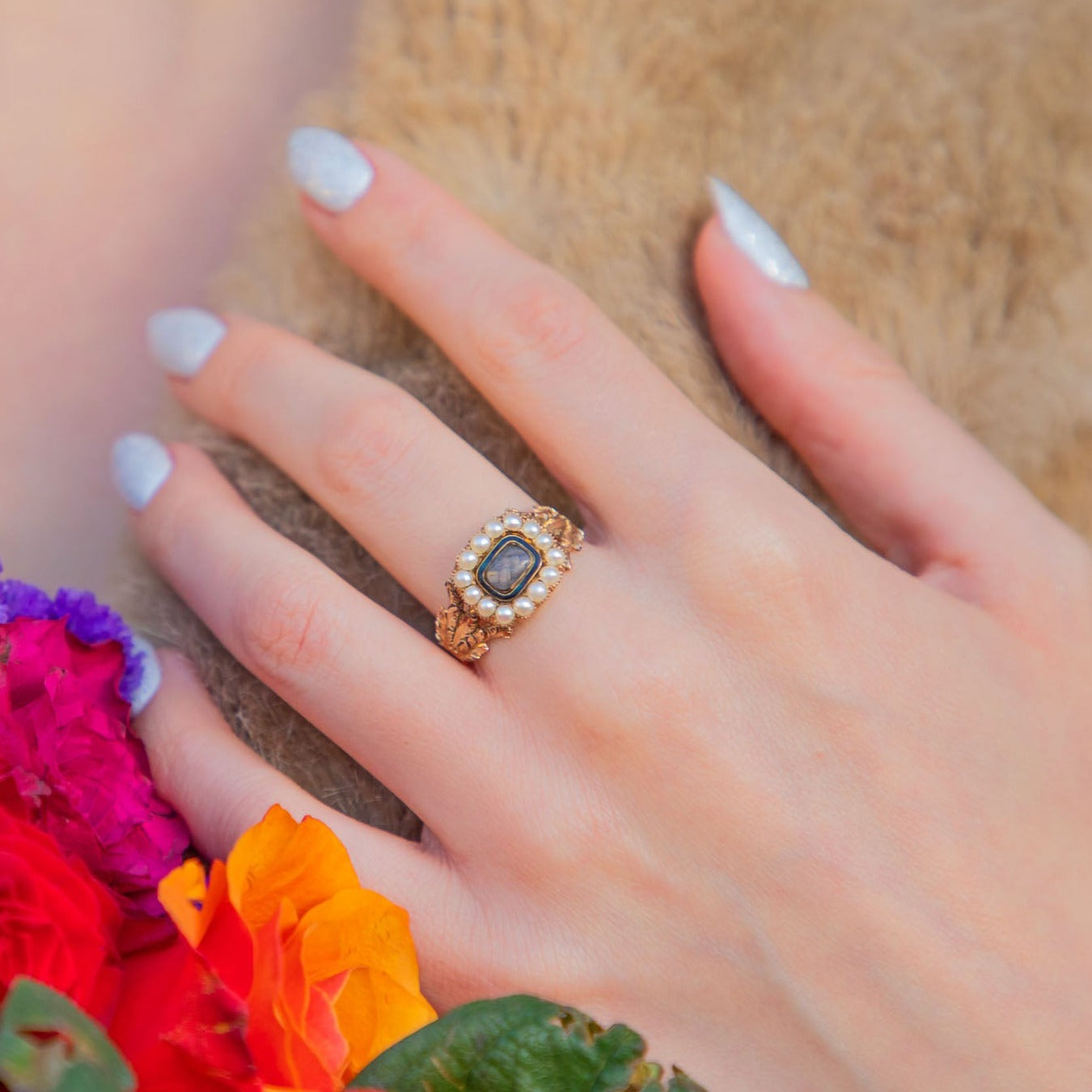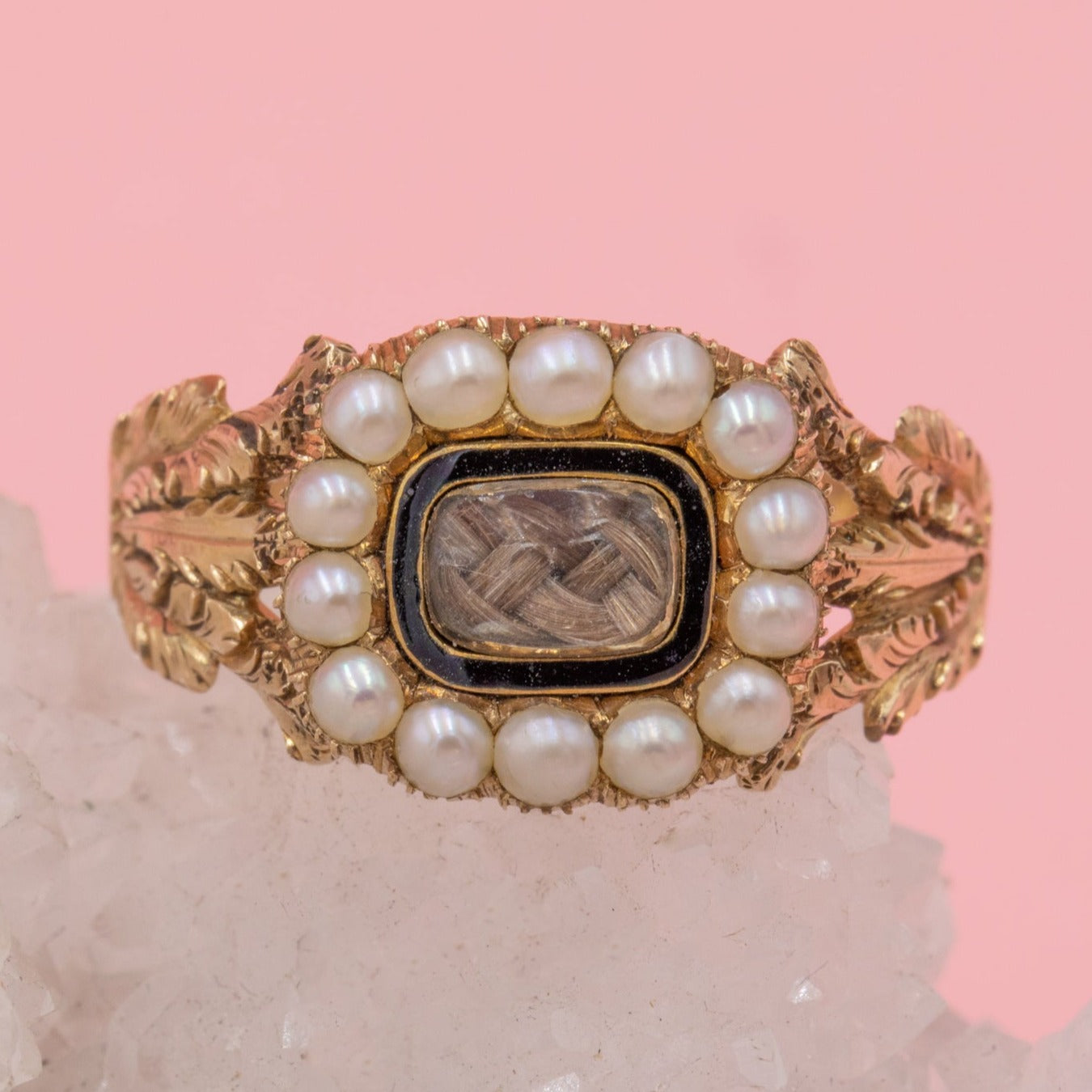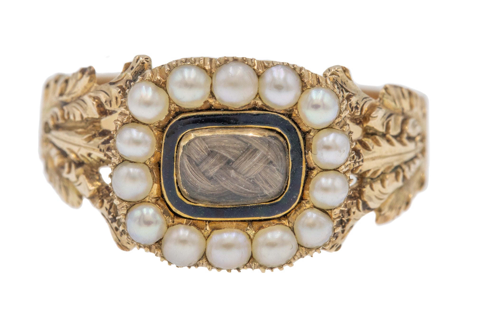 This Georgian 15ct Gold Pearl black Enamel cluster ring is a collector's dream! Composed of an ornately designed solid 15ct Gold shank, she features a cluster of creamy pearls haloing braided hair work.