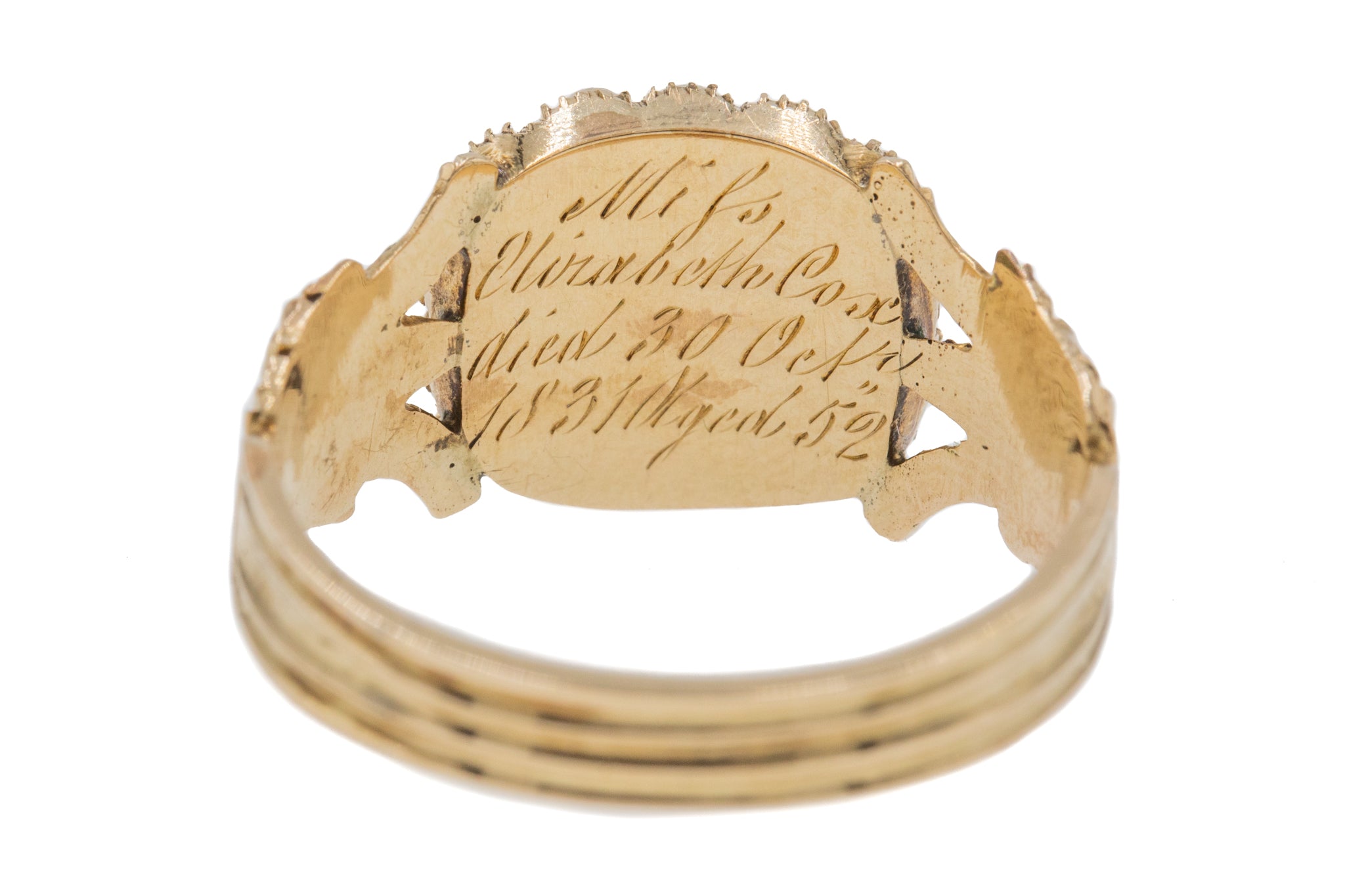 HALLMARKS: Test as 15ct Gold throughout. Inscribed inside band, "Miss Elizabeth Cox Died 30th Oct 1831 aged 52".