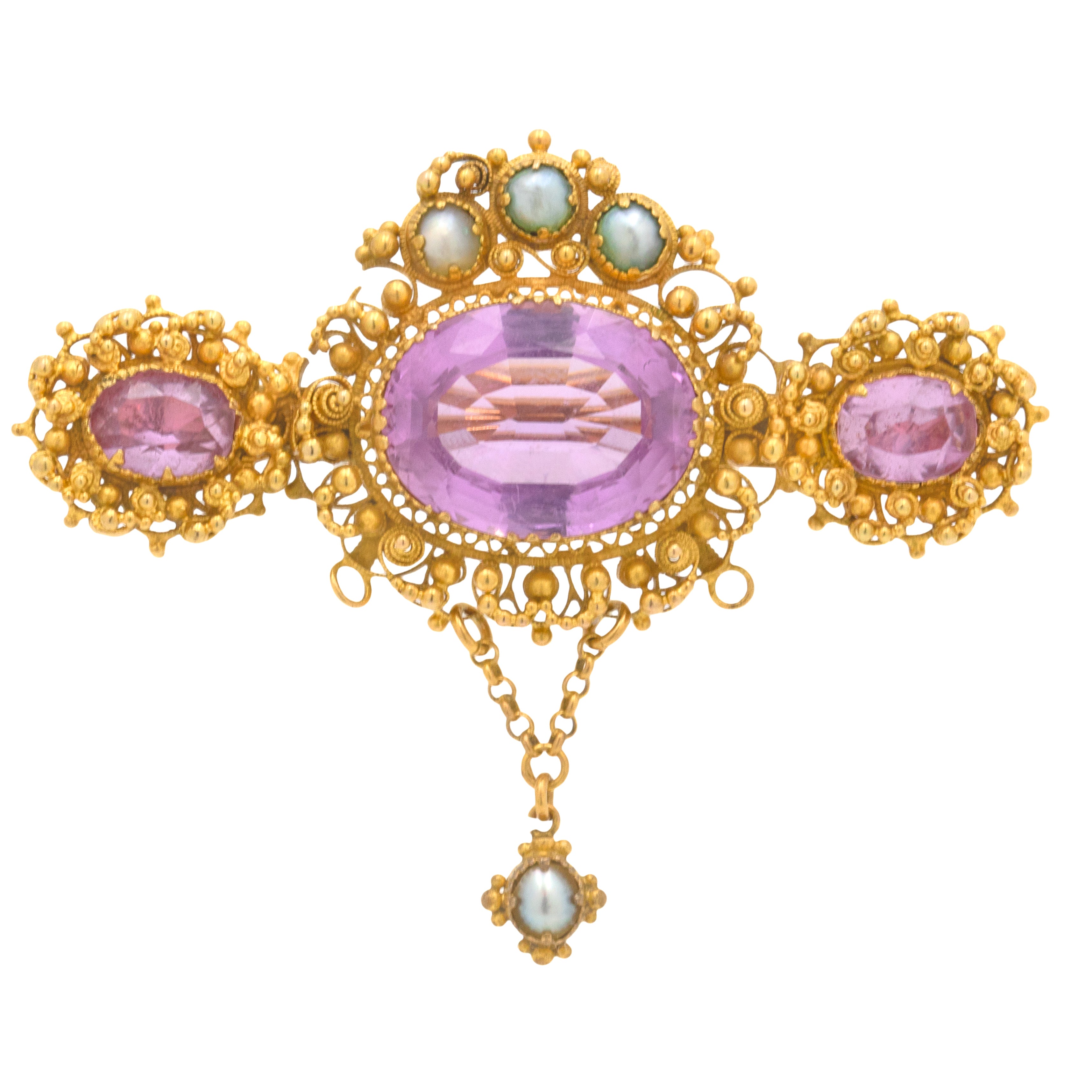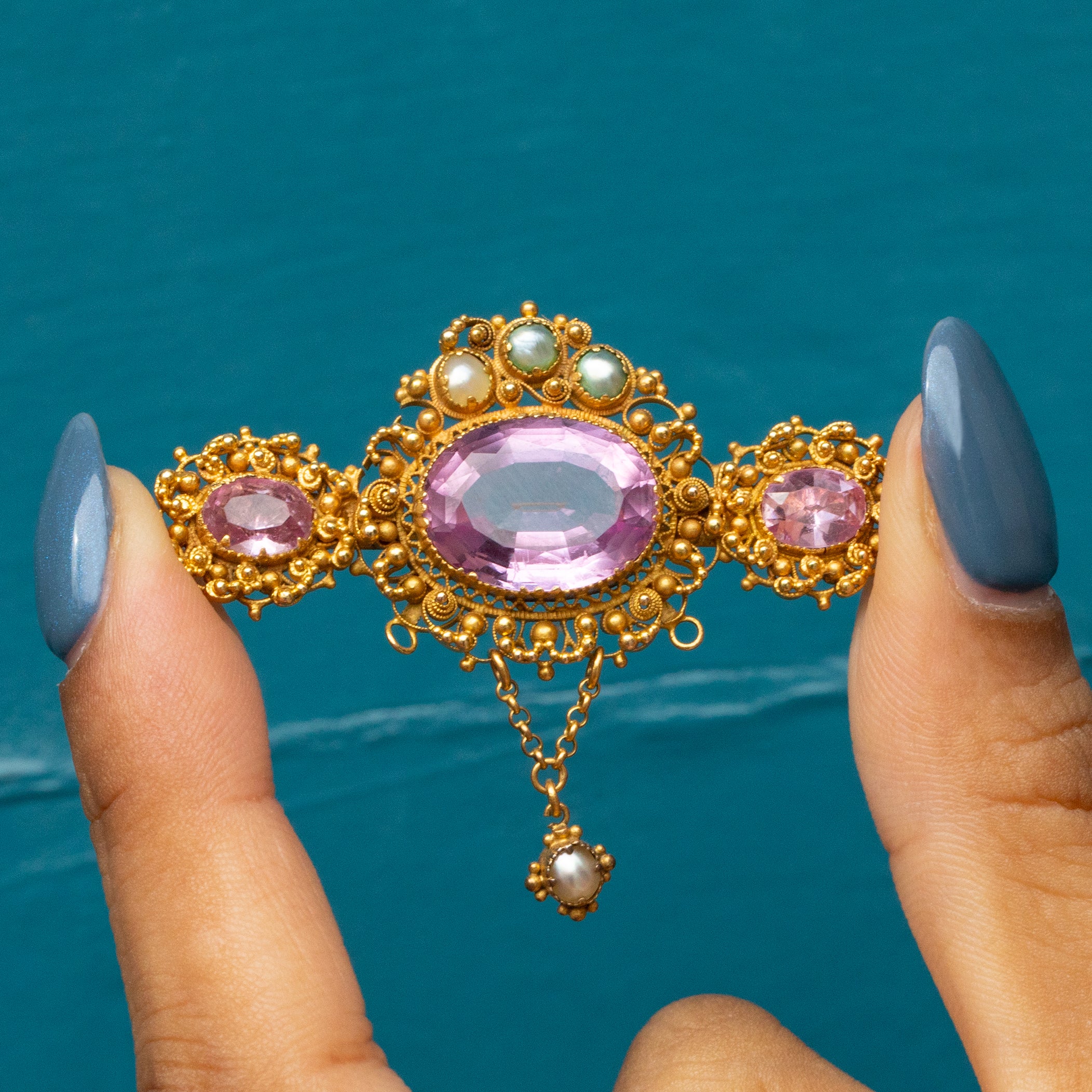 Georgian 18ct Gold Cannetille Pink Topaz Pearl Brooch, 7.80ct