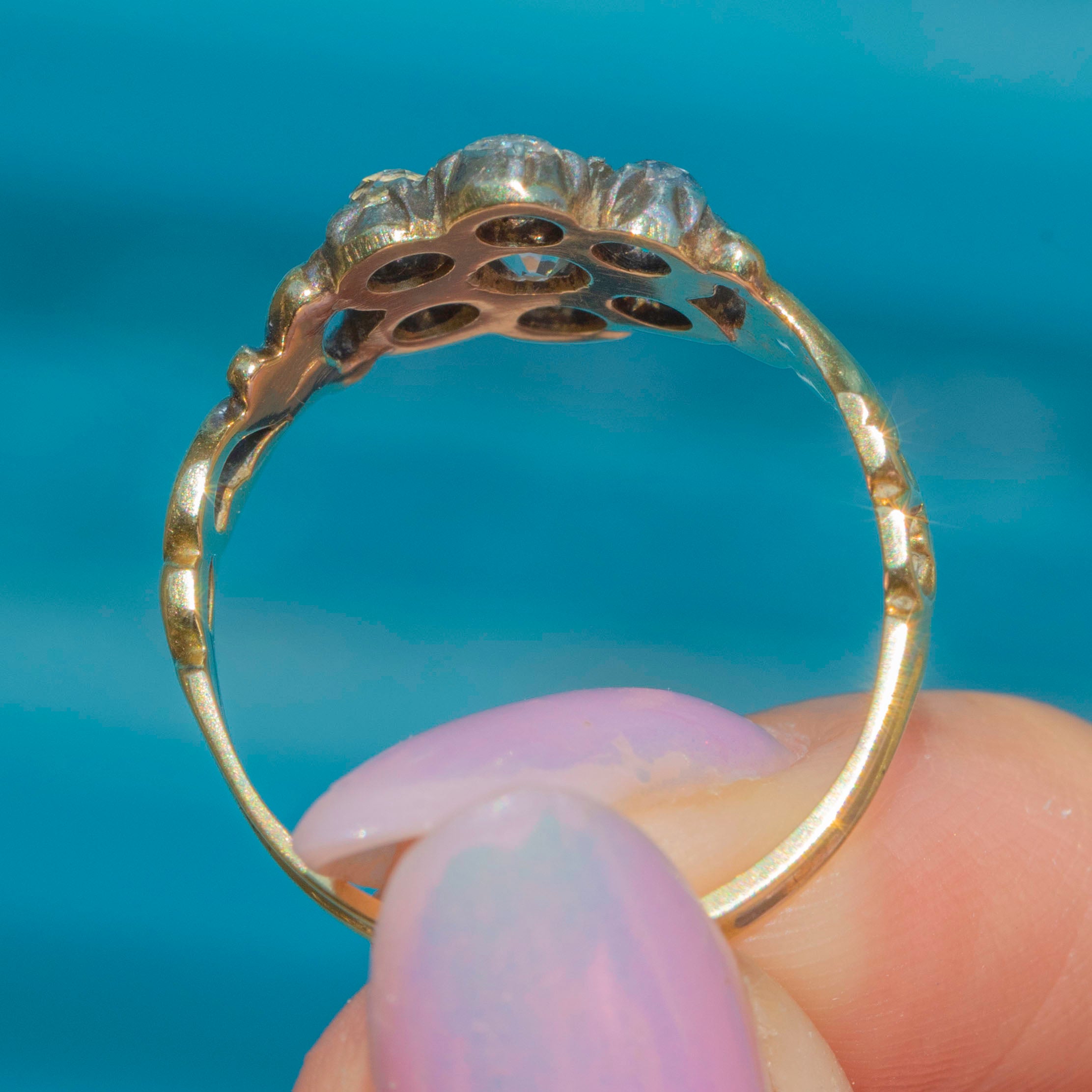 EXCELLENT: This Georgian ring is in excellent antique condition, especially when considering its impressive age. The Diamonds are bright and securely set, with no visible fleabites or abrasions. The Silver piecrust settings have accrued a light patina, adding to the ring's antique charm. The 18ct Gold is buttery and the detailed shoulders have remained defined, with a smooth Gold band providing comfortable and secure wear.