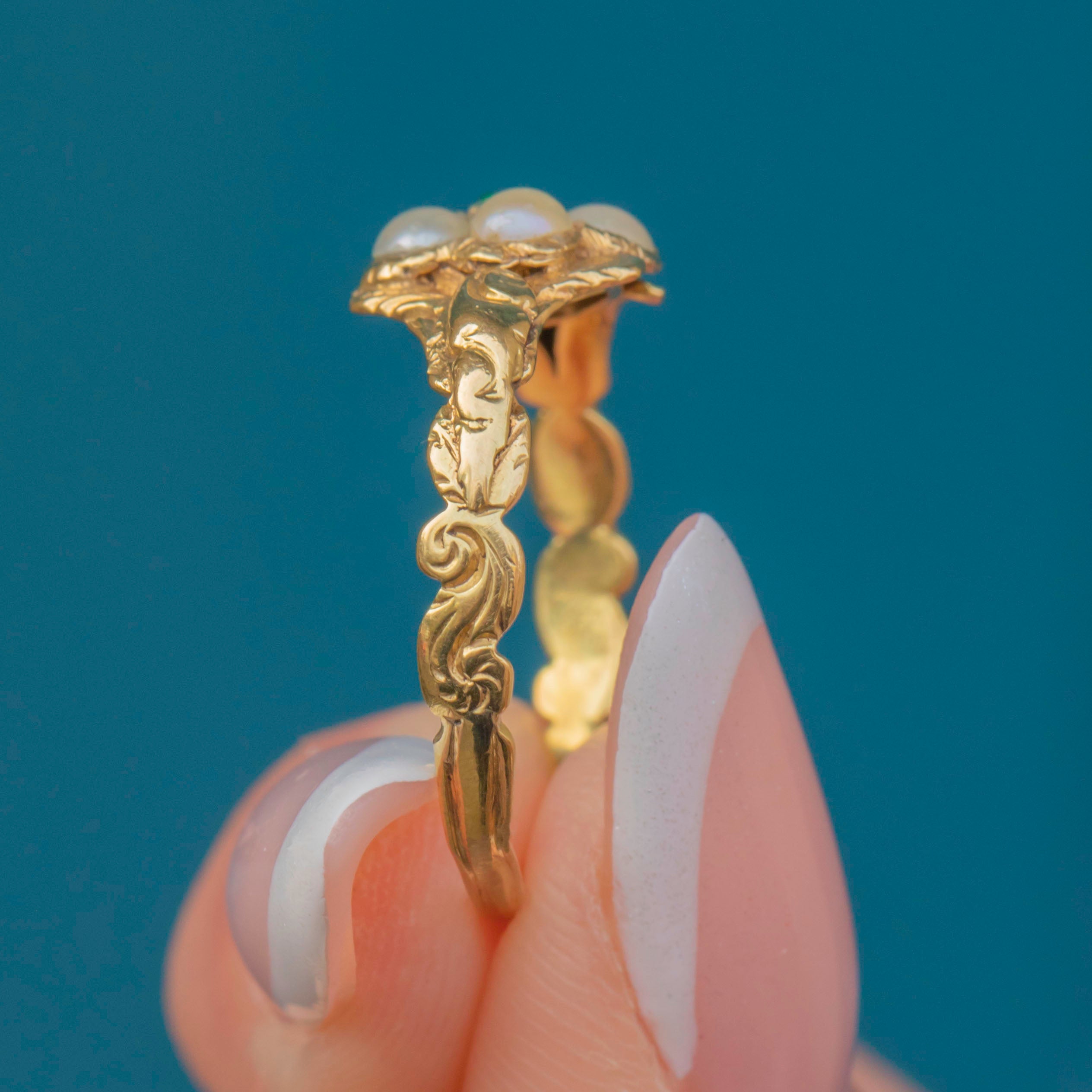 GOOD: This Georgian 18ct Gold Emerald Pearl daisy ring is presented in good condition. You can forgive that she has a little wear and tear to her, considering she is over 200 years old! Her Pearls have all retained their original lustre, are well colour-matched, and have little to no wear to their surface. Her Emerald, although gloriously green and well secured, has a minor chip on her surface. This is only noticeable under close inspection with the use of a jeweller's loupe. Her Gold is wonderfully saturated and rich, accentuated by her engravings, which have marginally worn with time but still add a pop of eccentricity to this piece. There is some visible wear to the Gold on the back of the ring, this is not visible during wear however, meaning you can wear this ring straight from your pink Lillicoco box and impress the world!