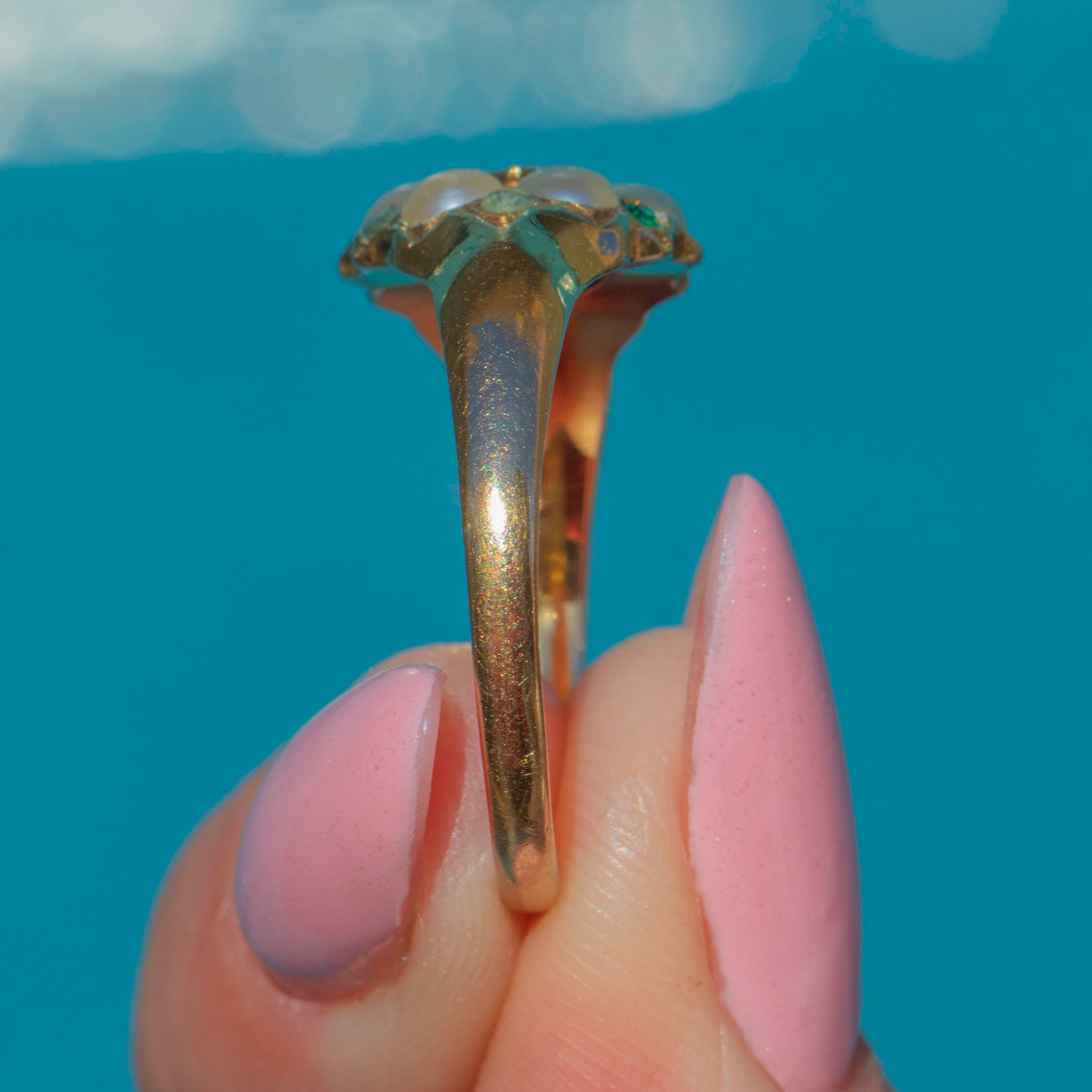 Comprised of six plump Pearls intertwined with seven radiant sage Emeralds, this Georgian cluster ring dazzles from every angle. Her buttery 18ct star settings give her an added celestial charm, with the glossy warmth of her Gold complementing the soft pastel gemstones.