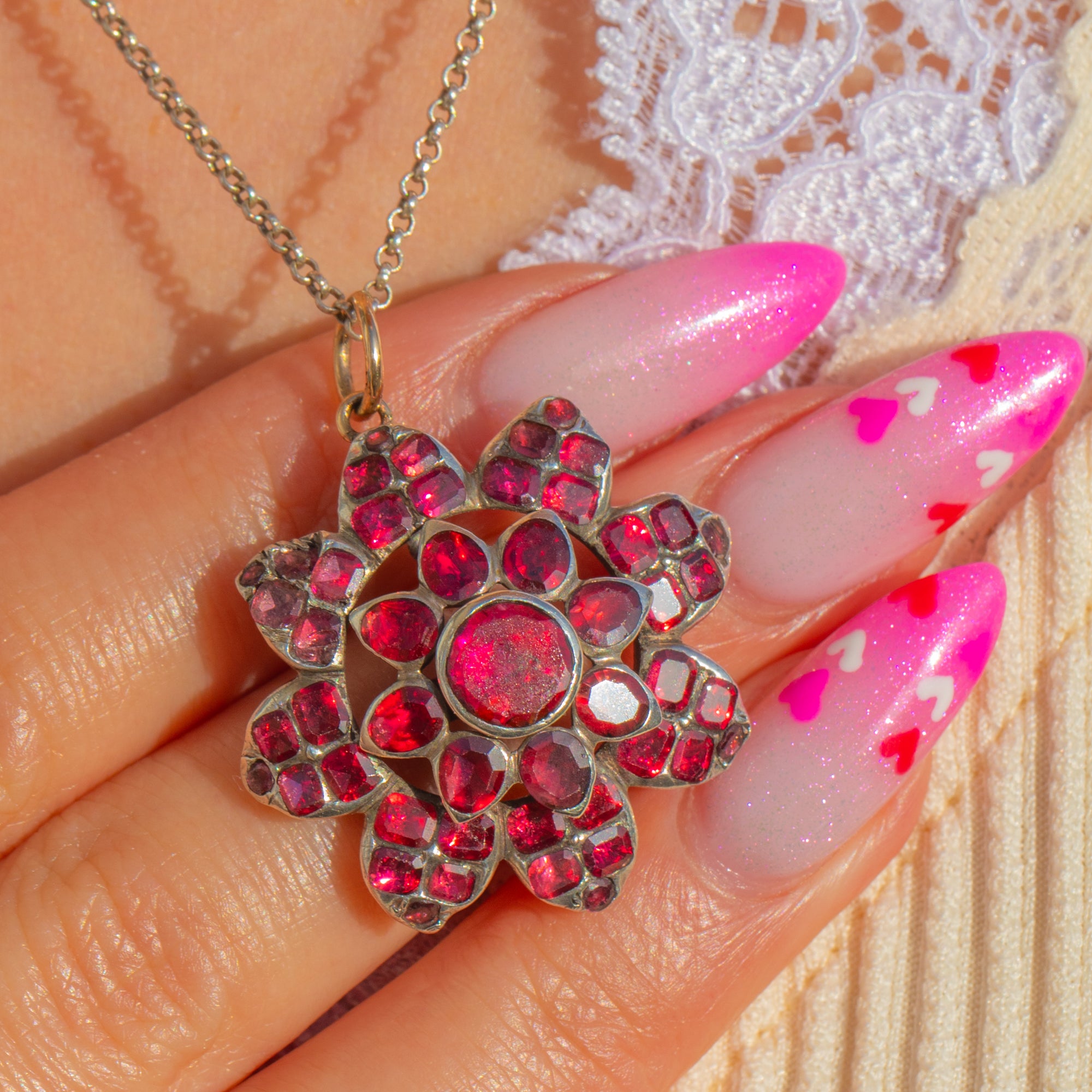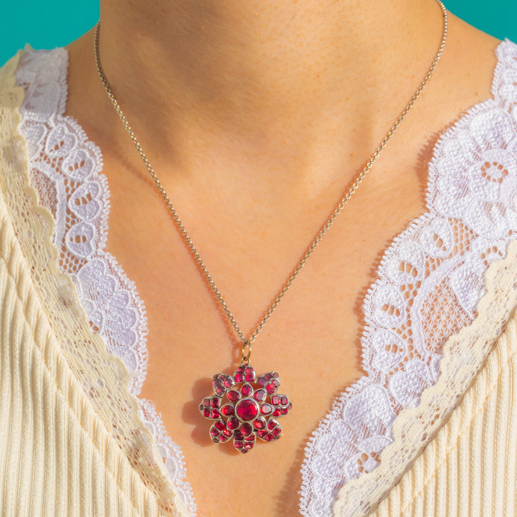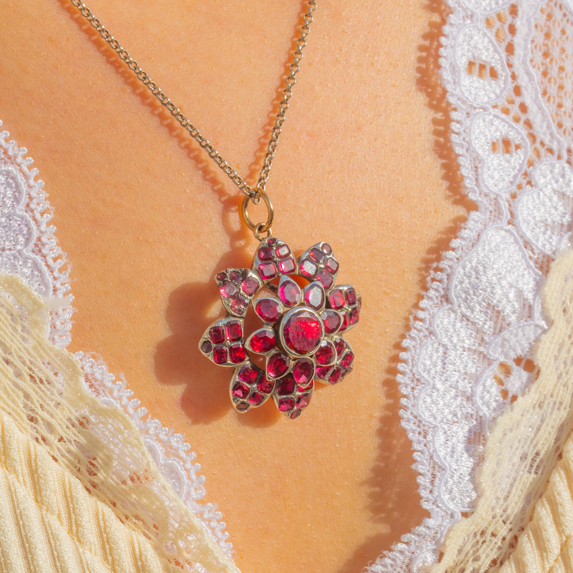 A sumptuous Georgian flower pendant alive with the rich wine-red glow of Flat Cut Garnets. Arranged in a radiant rosette, the stones graduate towards a domed centre, each nestled in hand-worked closed-back collet settings that create a deep, romantic shimmer. The ornate, layered openwork gives air and dimension to the cluster, while an 18ct Gold jump ring adds a refined note to the Silver mount.