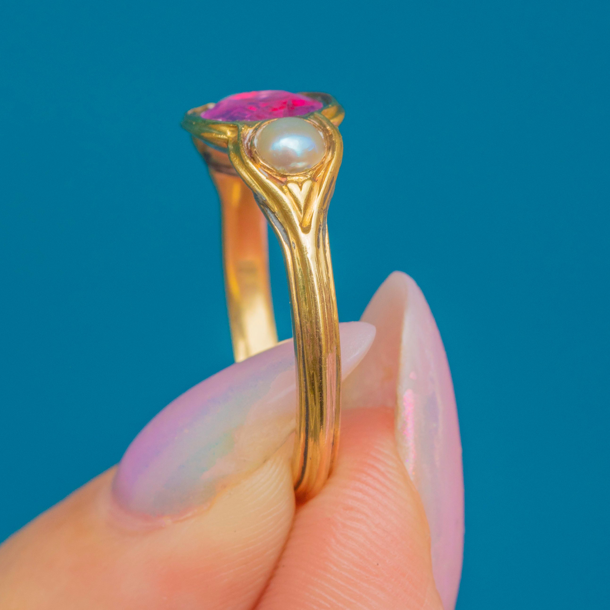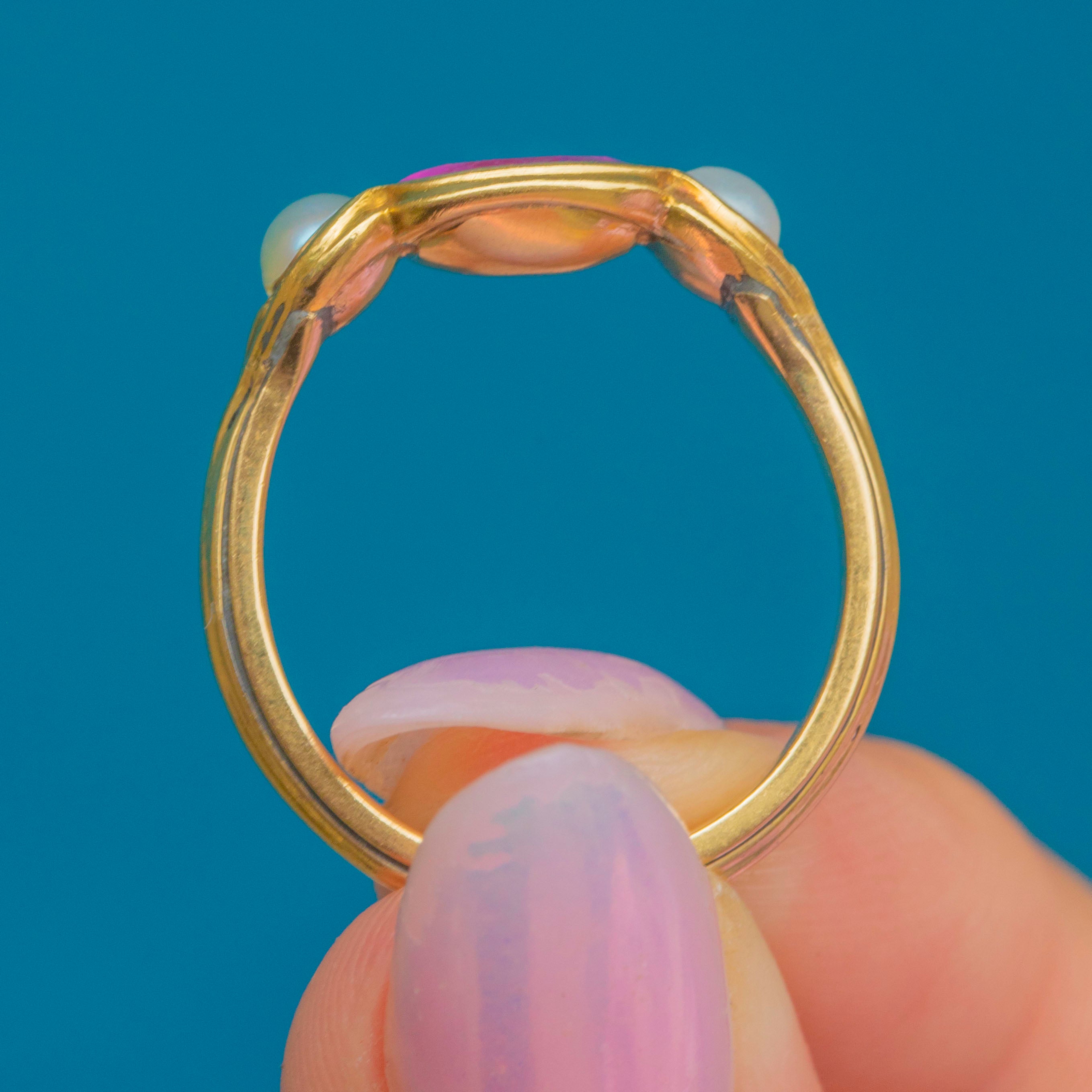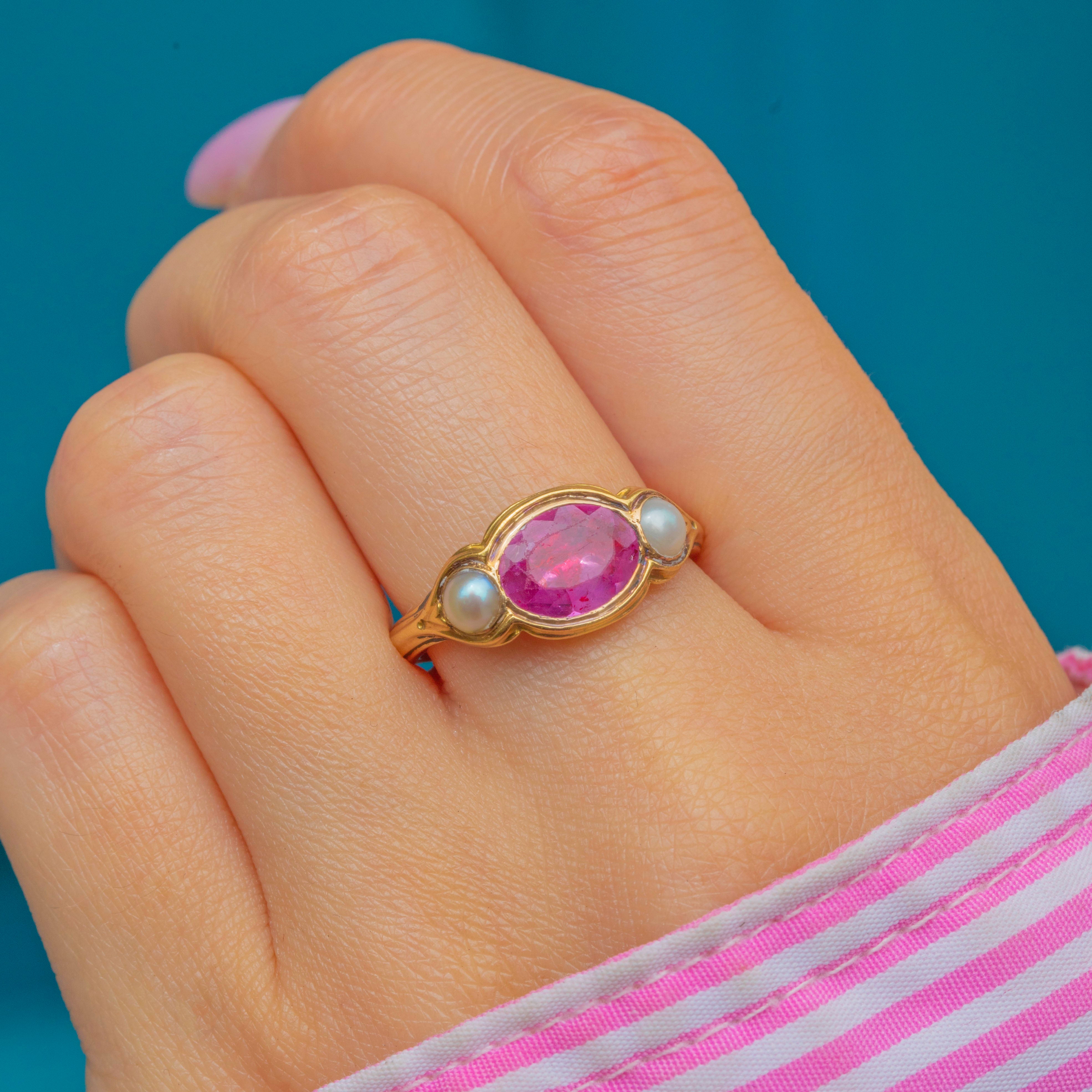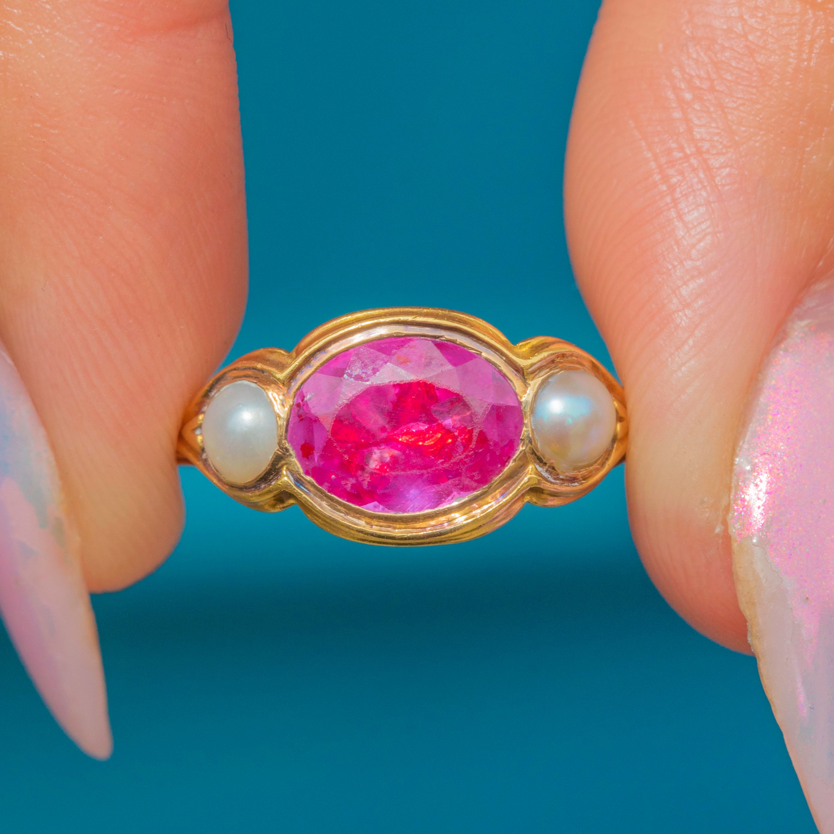 The Ruby is flanked by lustrous Pearls, creating a striking trilogy that spreads the width of the finger, and each one is framed by curvaceous settings for a smooth finish. Created circa 1820, this Georgian Ruby ring has been wonderfully preserved and is guaranteed to enchant for generations to come!