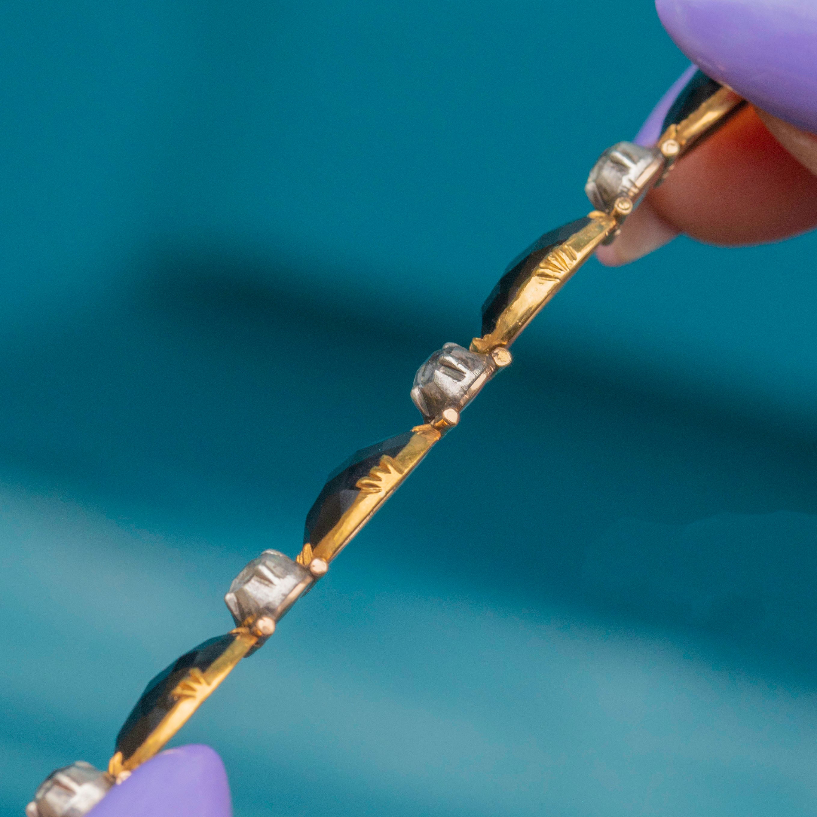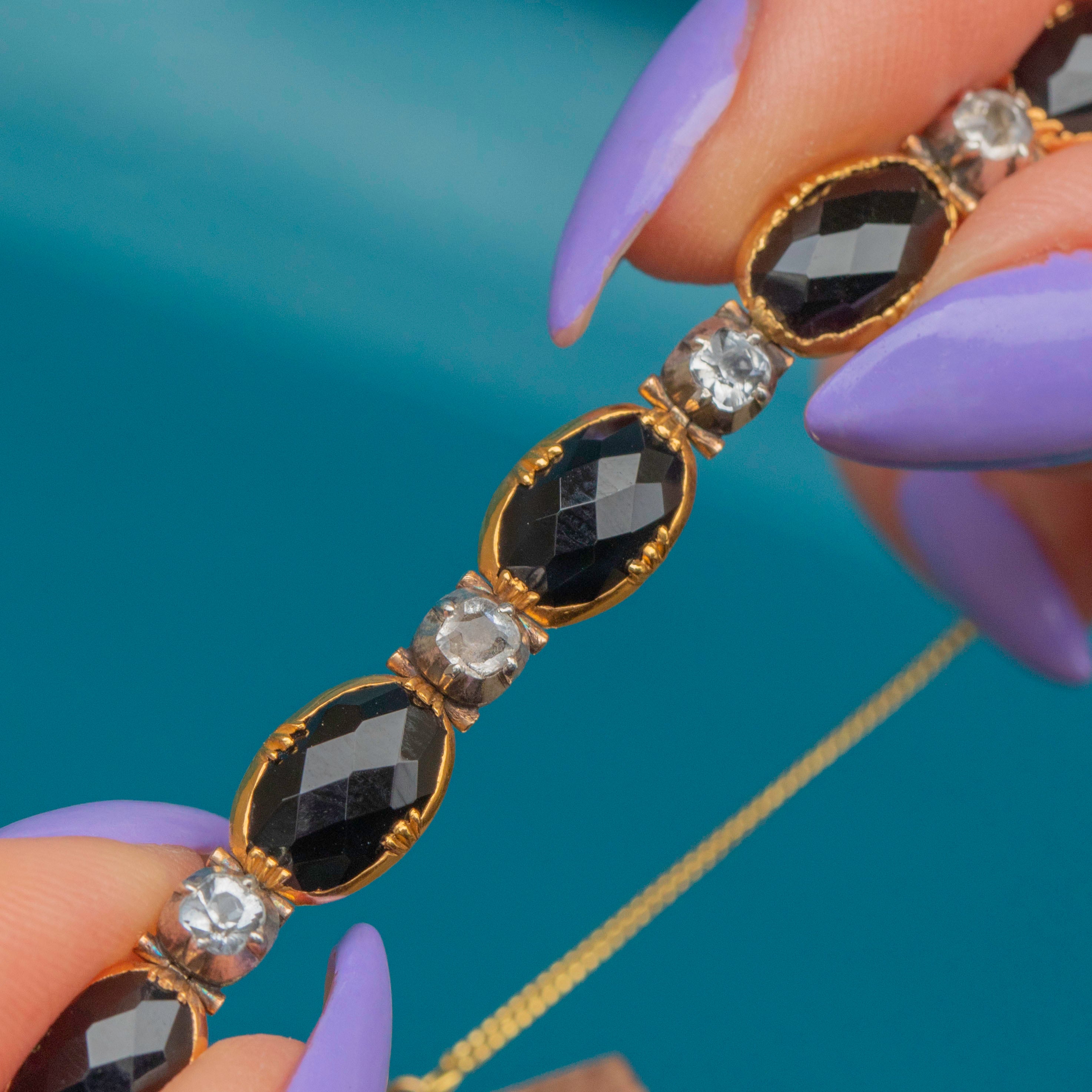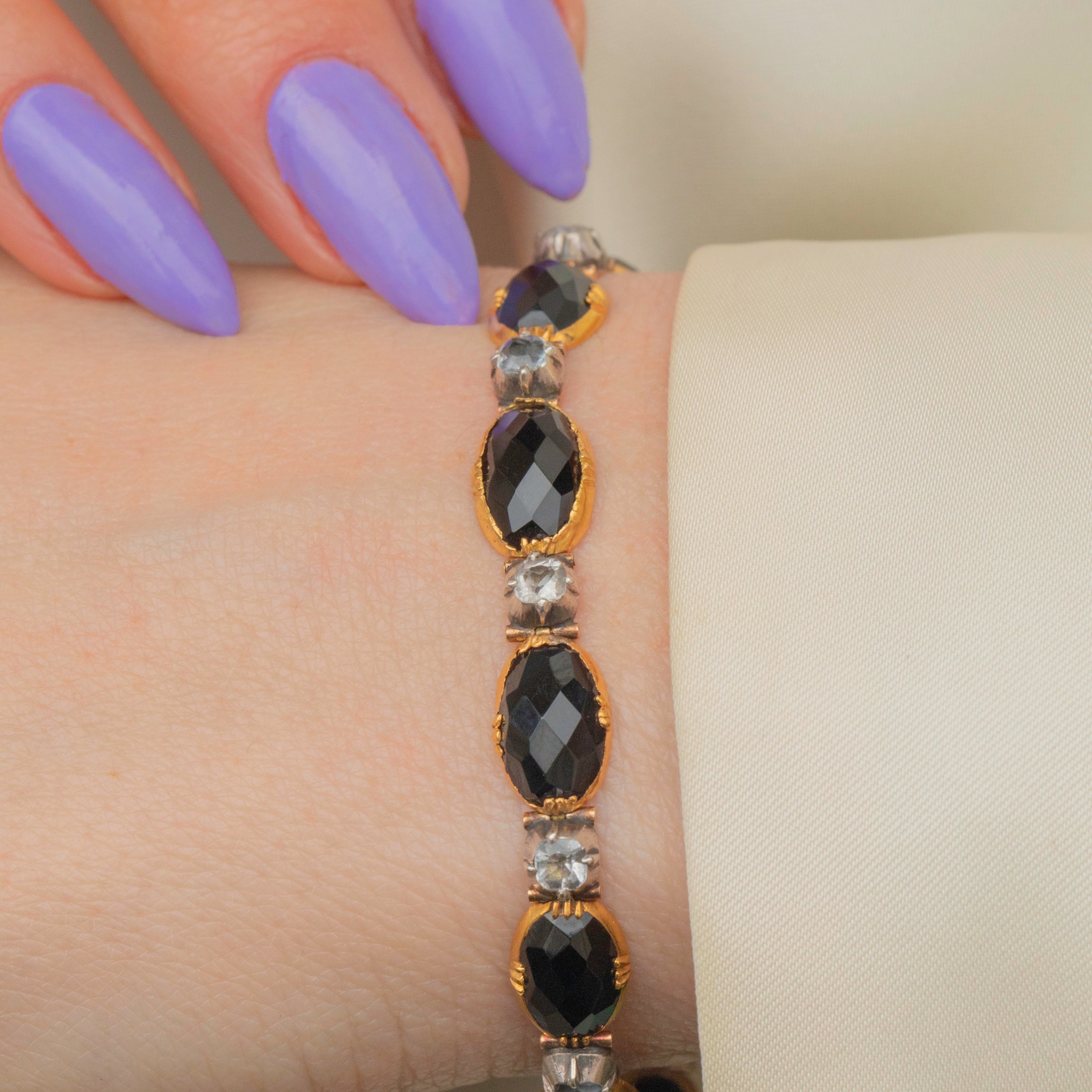 The craftsmanship is truly exquisite, with each Paste set in classically Georgian Silver piecrust settings and the Jet displayed within decorative 18ct Gold bezels. Each link is connected with a hinge that promises secure wear and many more years of enjoyment!