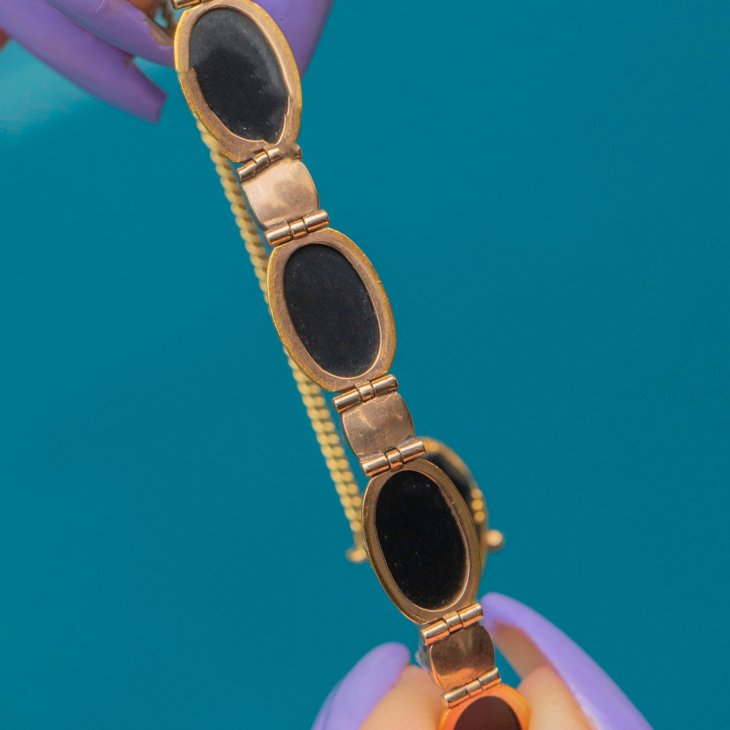 GOOD-VERY GOOD: This Georgian 18ct Gold French Jet bracelet is in great condition, especially when considering its grand age. The gemstones are all original to the piece and securely set. Some of the Jet stones have minor chips, noticeable under close inspection, but these don't affect the integrity of the stones and won't be noticeable while the bracelet is worn. The links are securely connected, with only minor age-related surface wear throughout. Complete with a safety chain, you can wear this exquisite piece of history with absolute confidence!