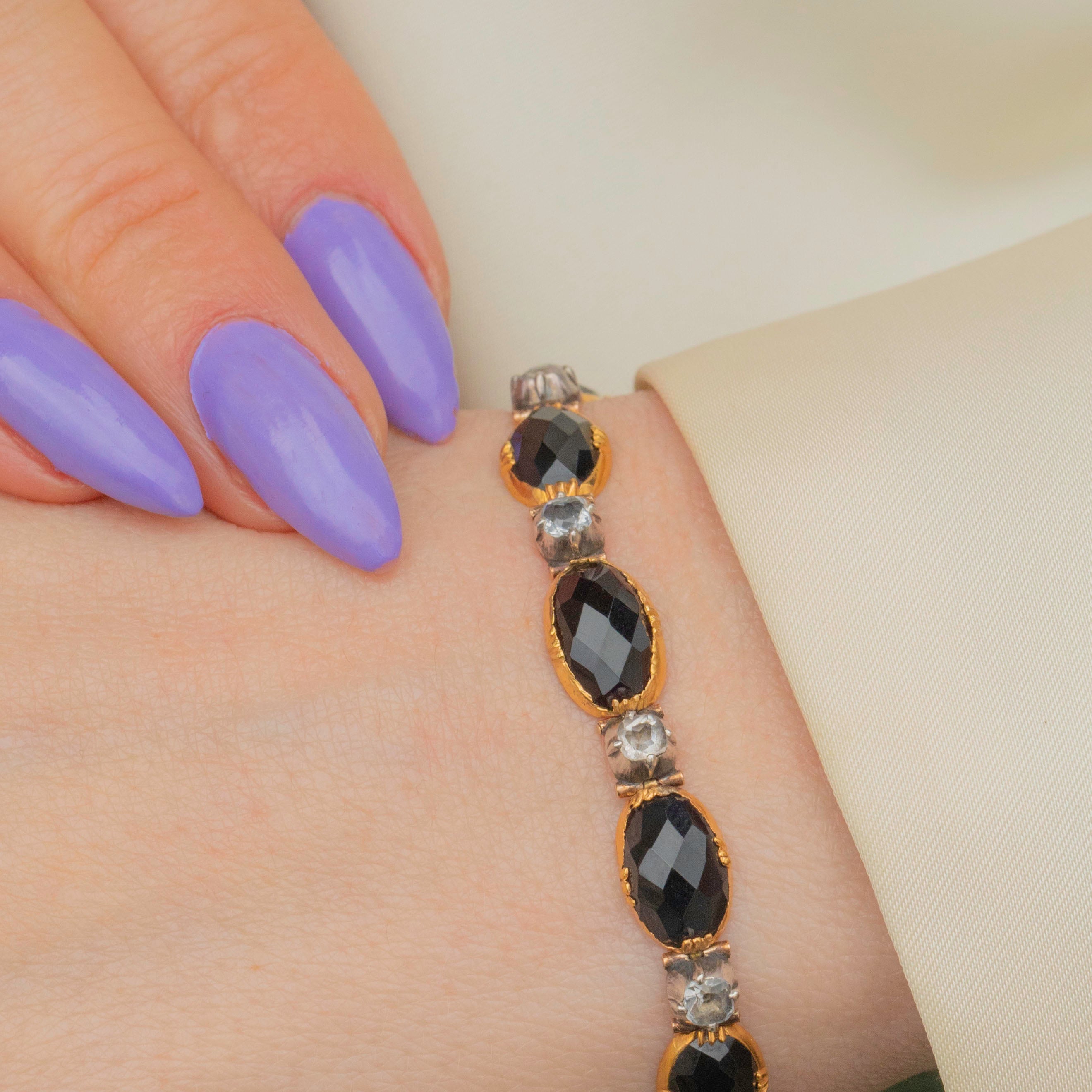 This Georgian 18ct Gold French Jet bracelet will look resplendent adorning your wrist! The combination of alternating ink-black Jet and bright white Paste makes for an elegant pairing, their crisp-cut facets catching the light magnificently.