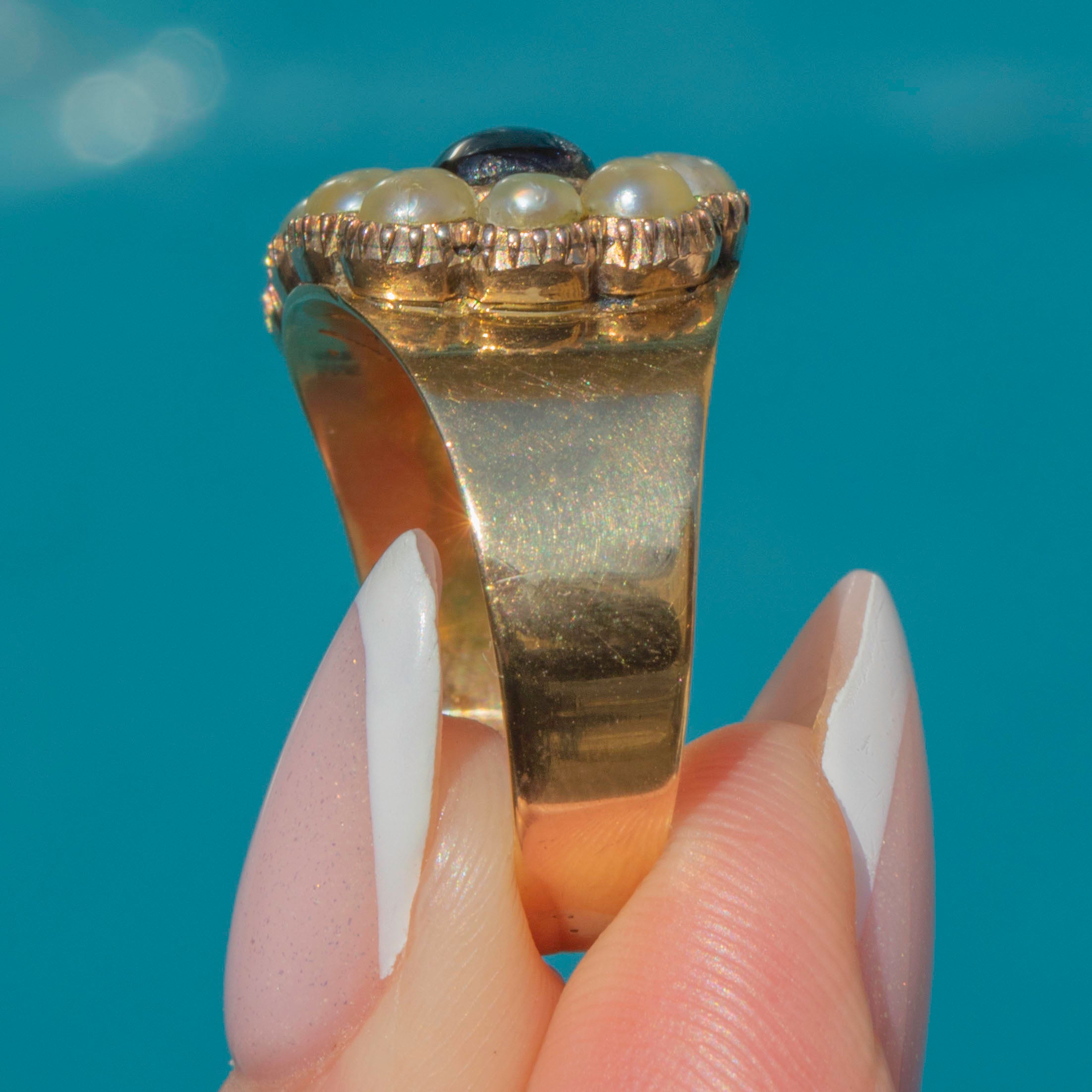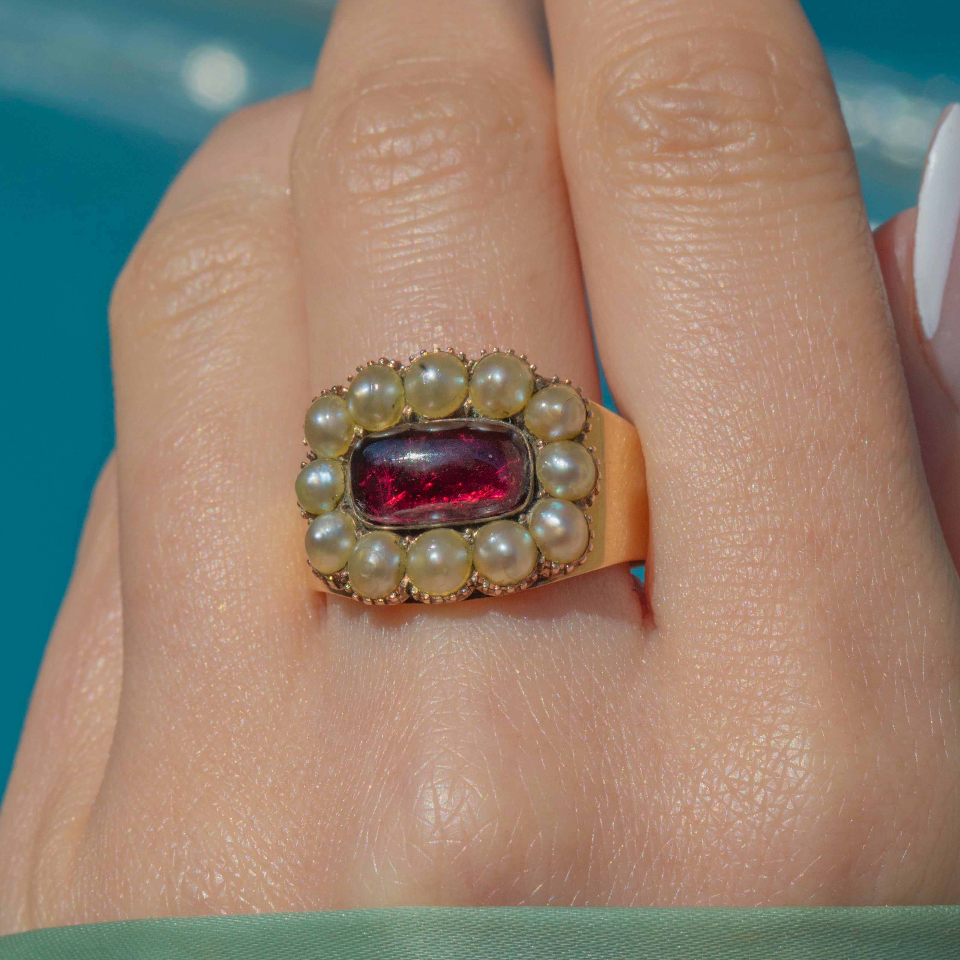 VERY GOOD: This Georgian 18ct Gold Garnet & Pearl cluster ring is in very good condition. The Gold is bright and smooth, with only minor surface wear, and feels comfortable on the finger. The Garnet has a mild scratch on its surface and some of the Pearls show signs of surface wear, but considering this ring is over two centuries old, this can easily be forgiven. The gems are all securely set and the wide band feels robust, allowing you to wear this antique Garnet & Pearl cluster ring with absolute confidence!