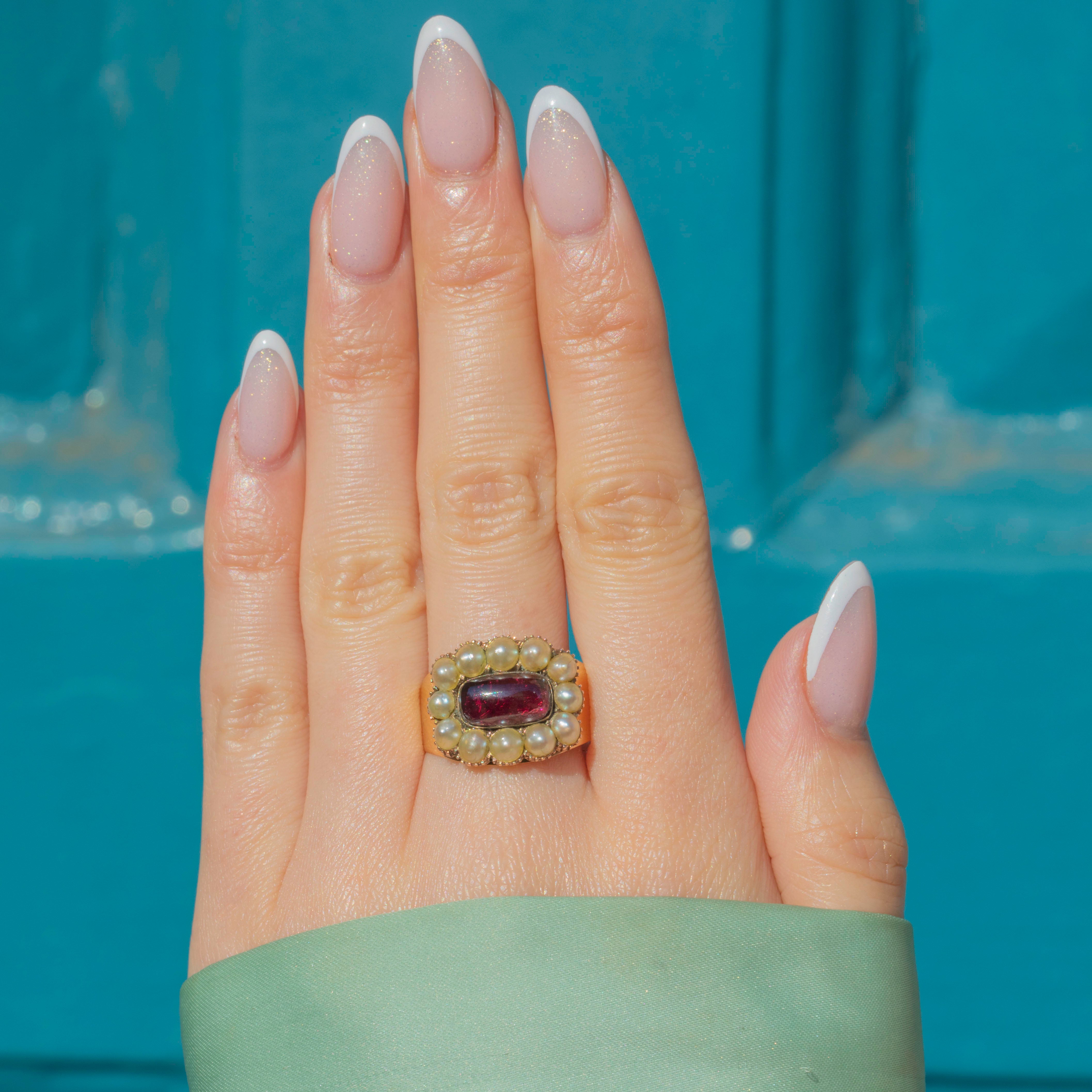 The impressive gemstone cluster will instantly grab your attention, with its large crimson 1.60ct Garnet cabochon and plump silvery Pearls making quite the statement. The Pearls are embraced by classically Georgian piecrust settings that add a lovely decorative finish.