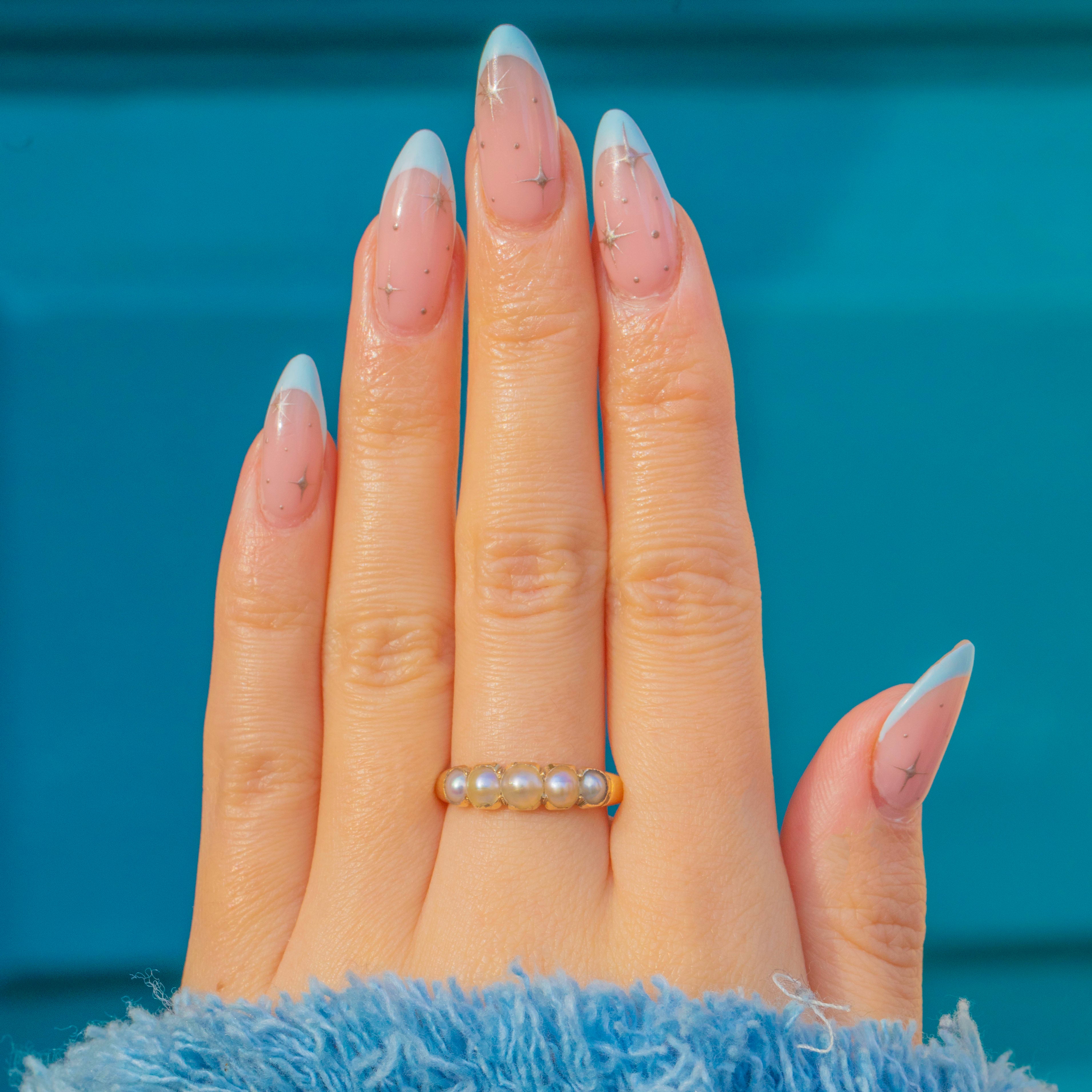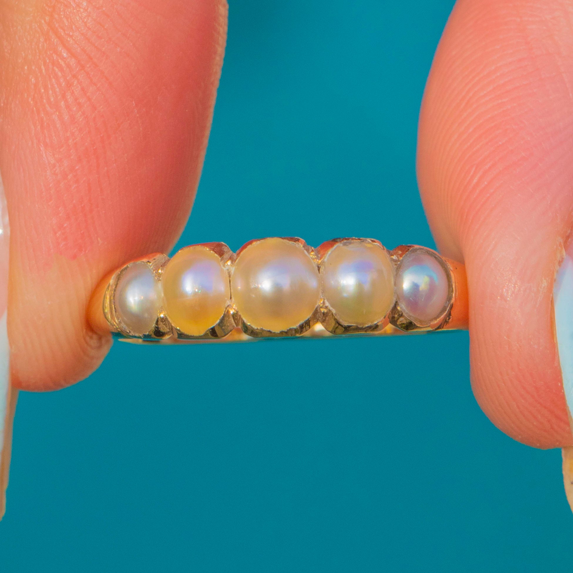 A lyrical Georgian five-stone half hoop, crafted in rich 18ct Gold and set with Natural Pearls that graduate softly across the finger. Each domed Pearl nestles in scalloped settings, creating a romantic, low-profile line of glow and gentle shimmer.