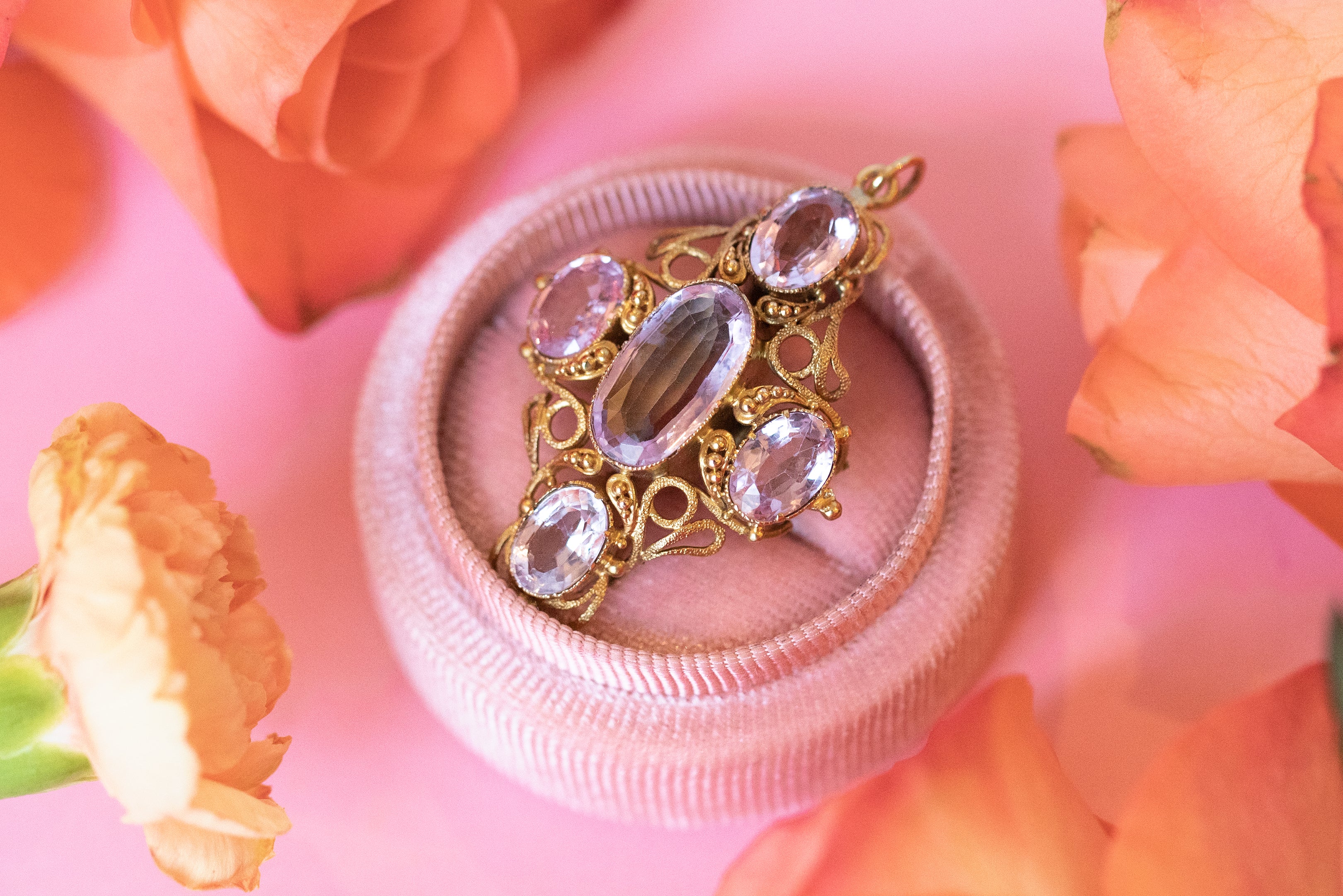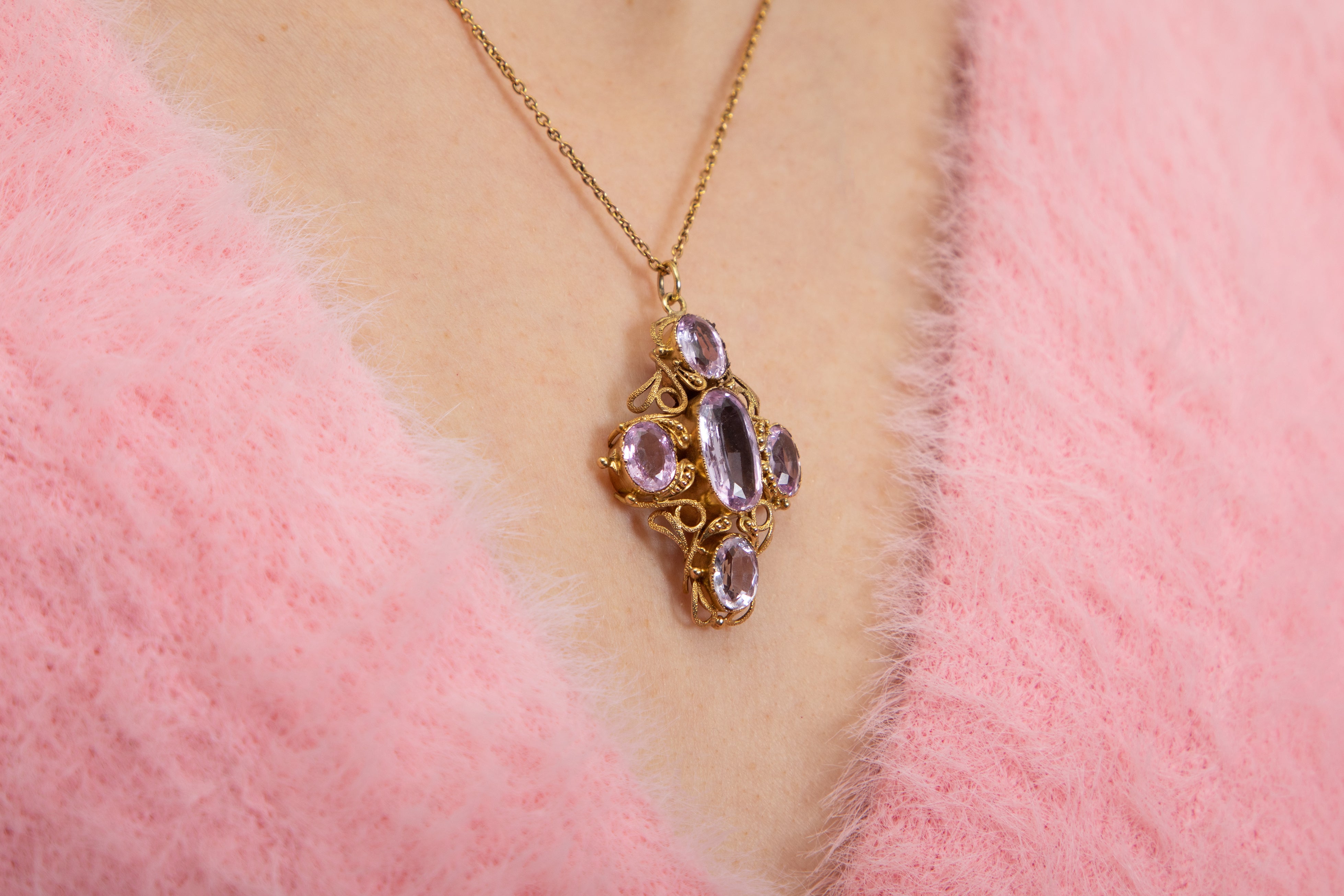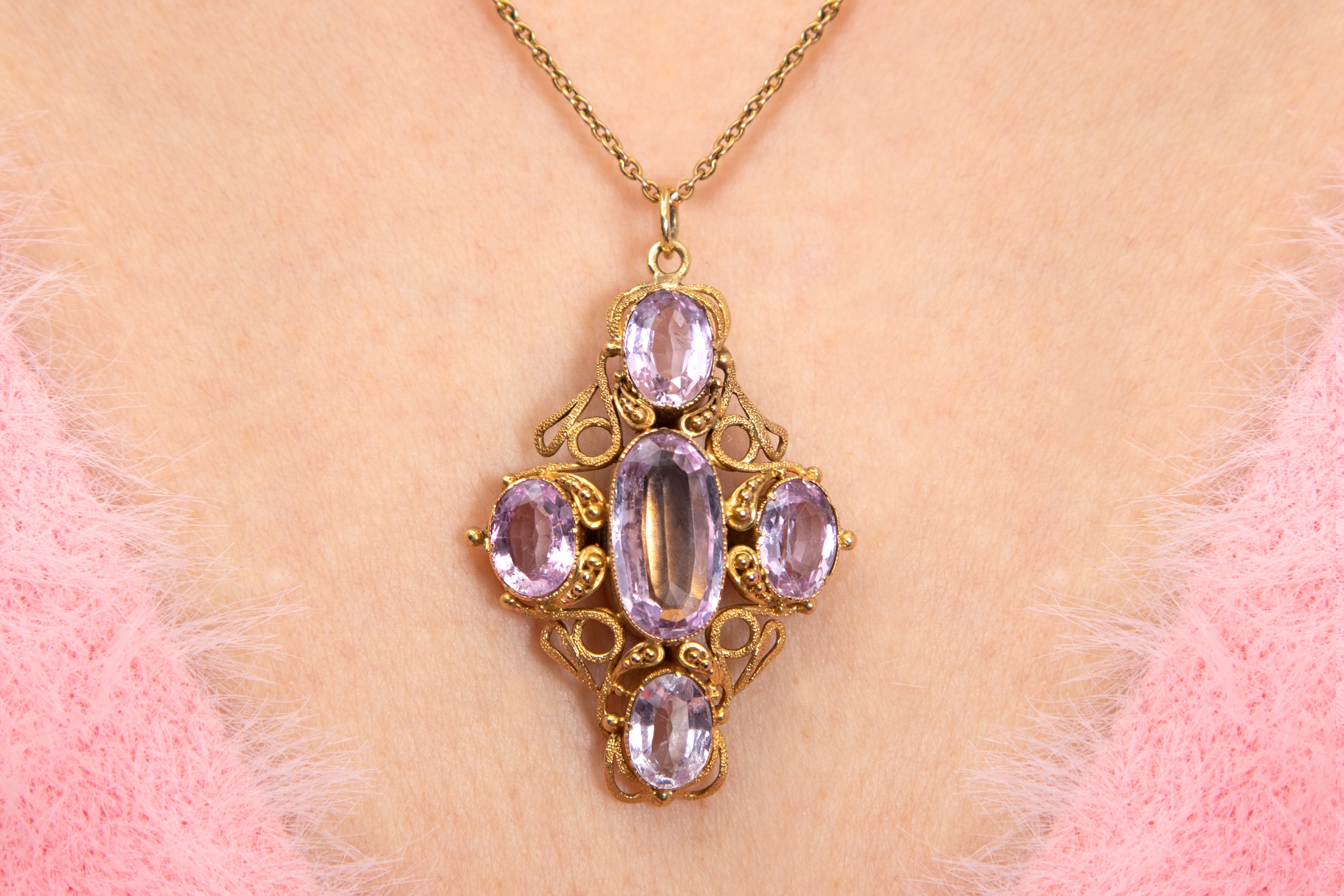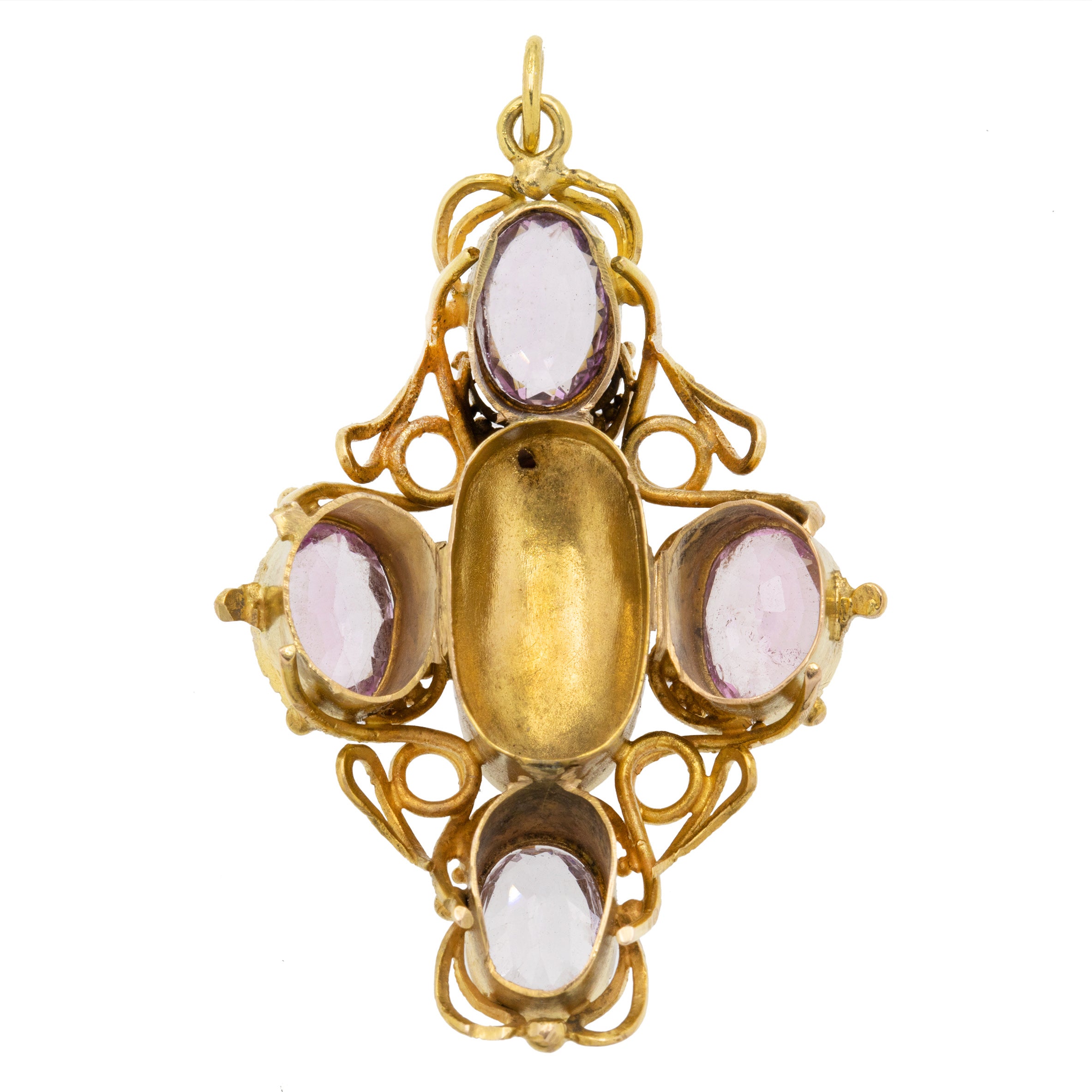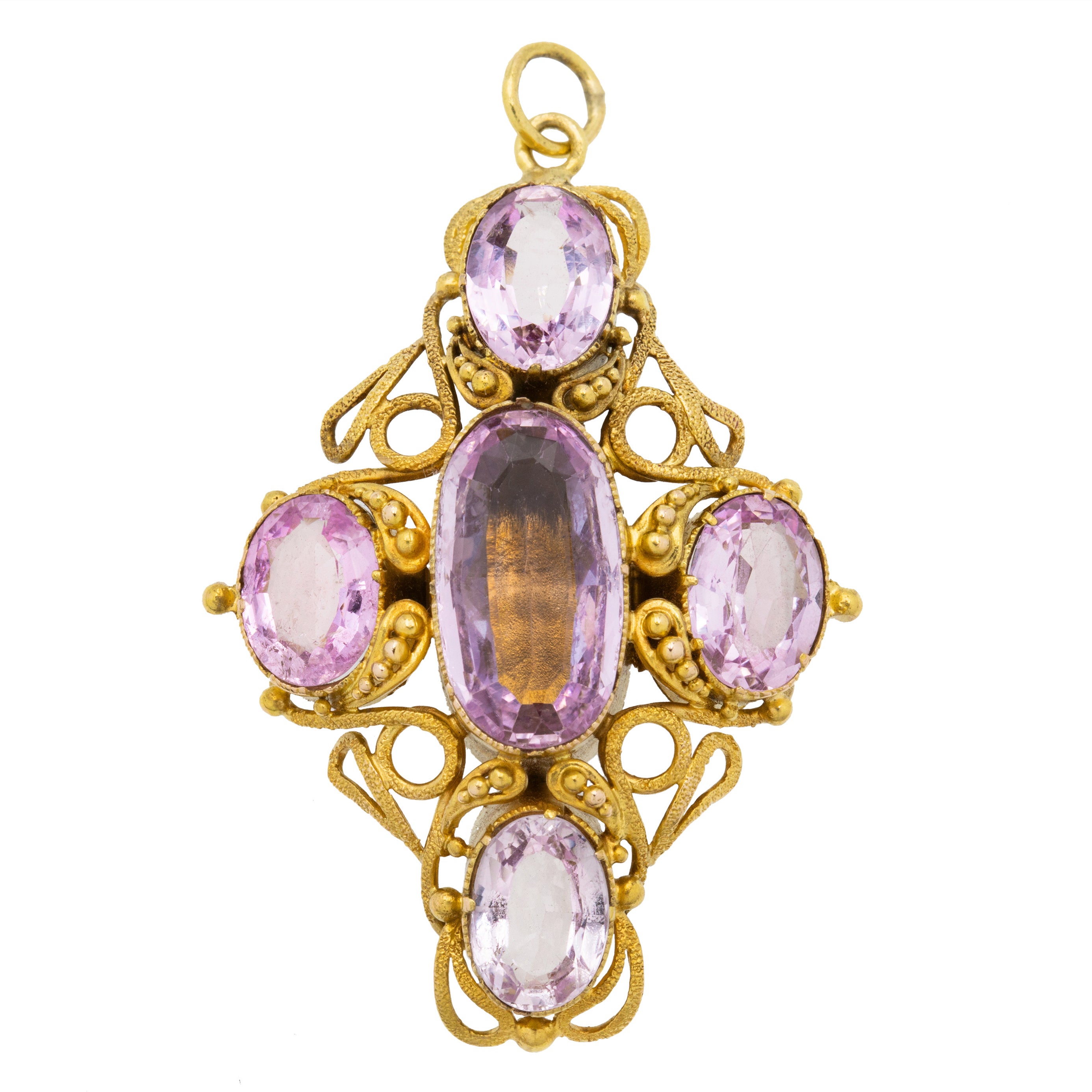 Plucked straight from a fairytale, this Georgian 18ct Gold pink Topaz pendant is heavenly! Homing five Pink Topaz, with a combined carat weight of 6.45ct, each one flaunts a spectrum of twinkling mauve hues poised perfectly in a cross formation.