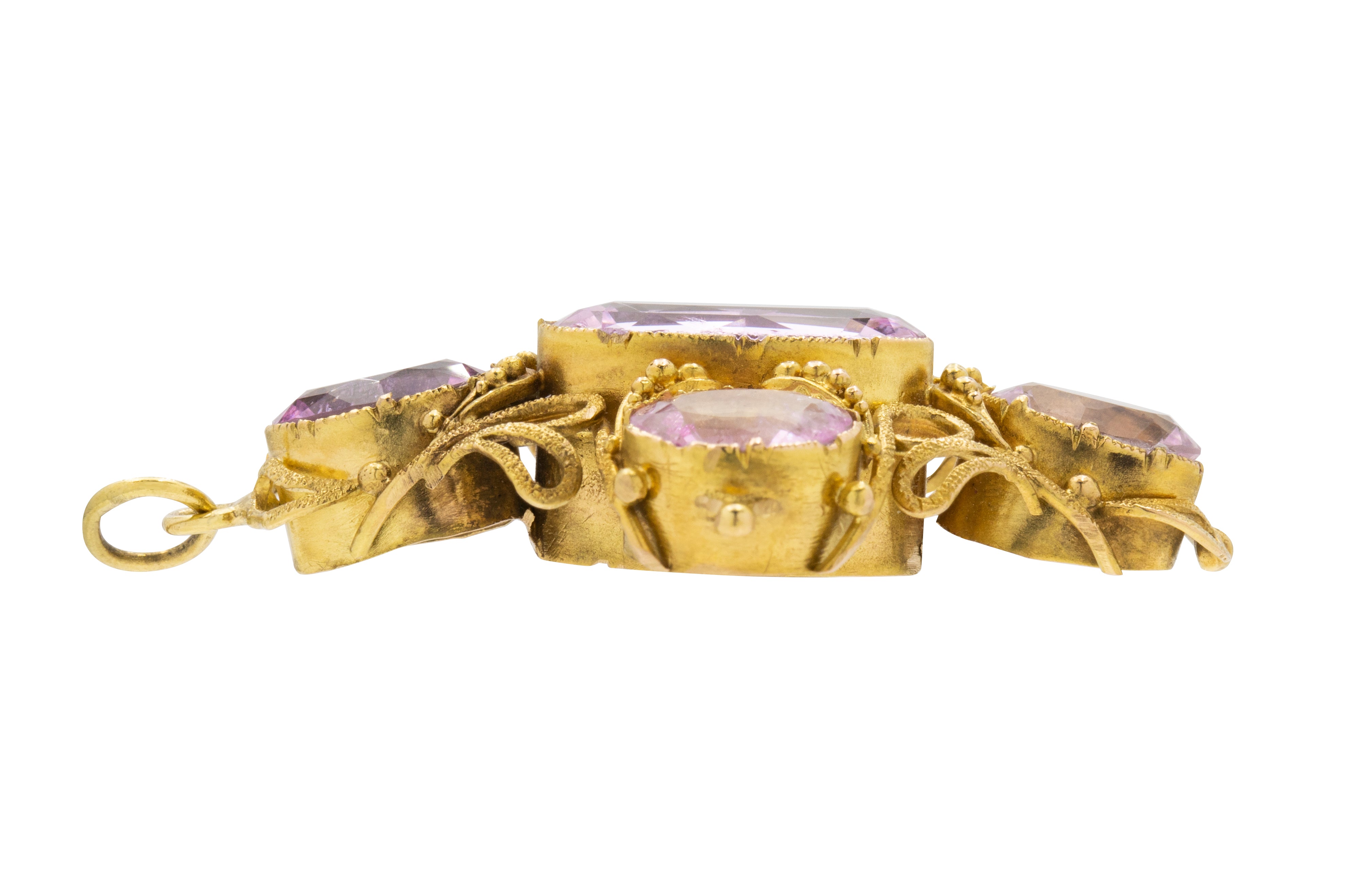 Whimsical Goldwork with dappled textures weavs between each Pink Topaz, crafted from sumptuous 18ct Gold, with beaded detailing at the centre. The soft colour palette combined with the fine Gold work gives this Georgian pendant a delicate and feminine aesthetic.