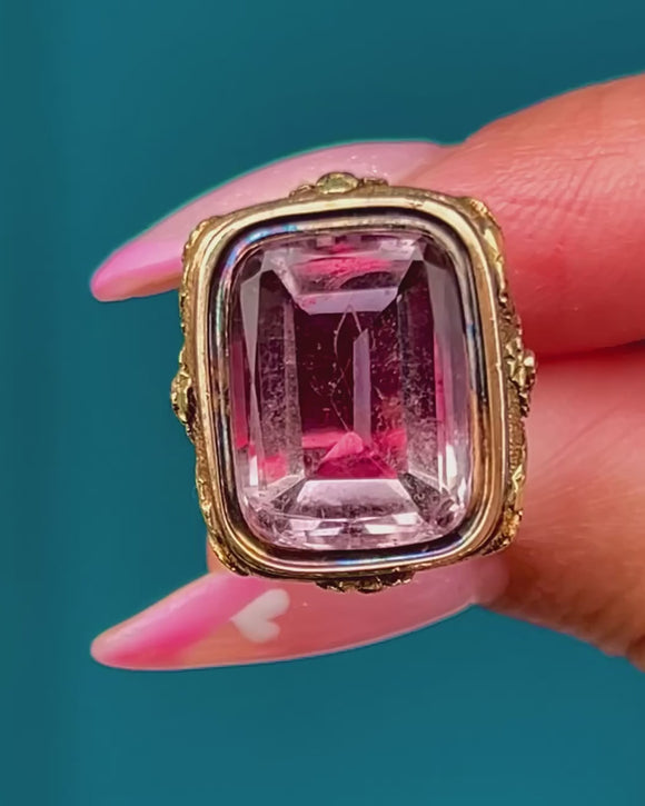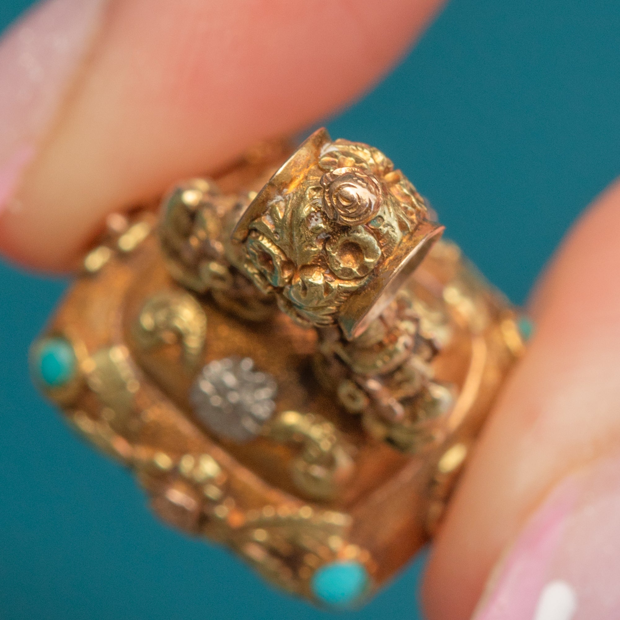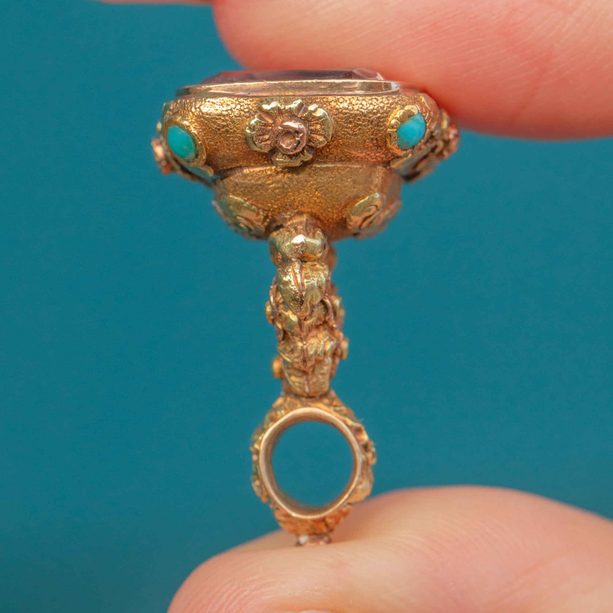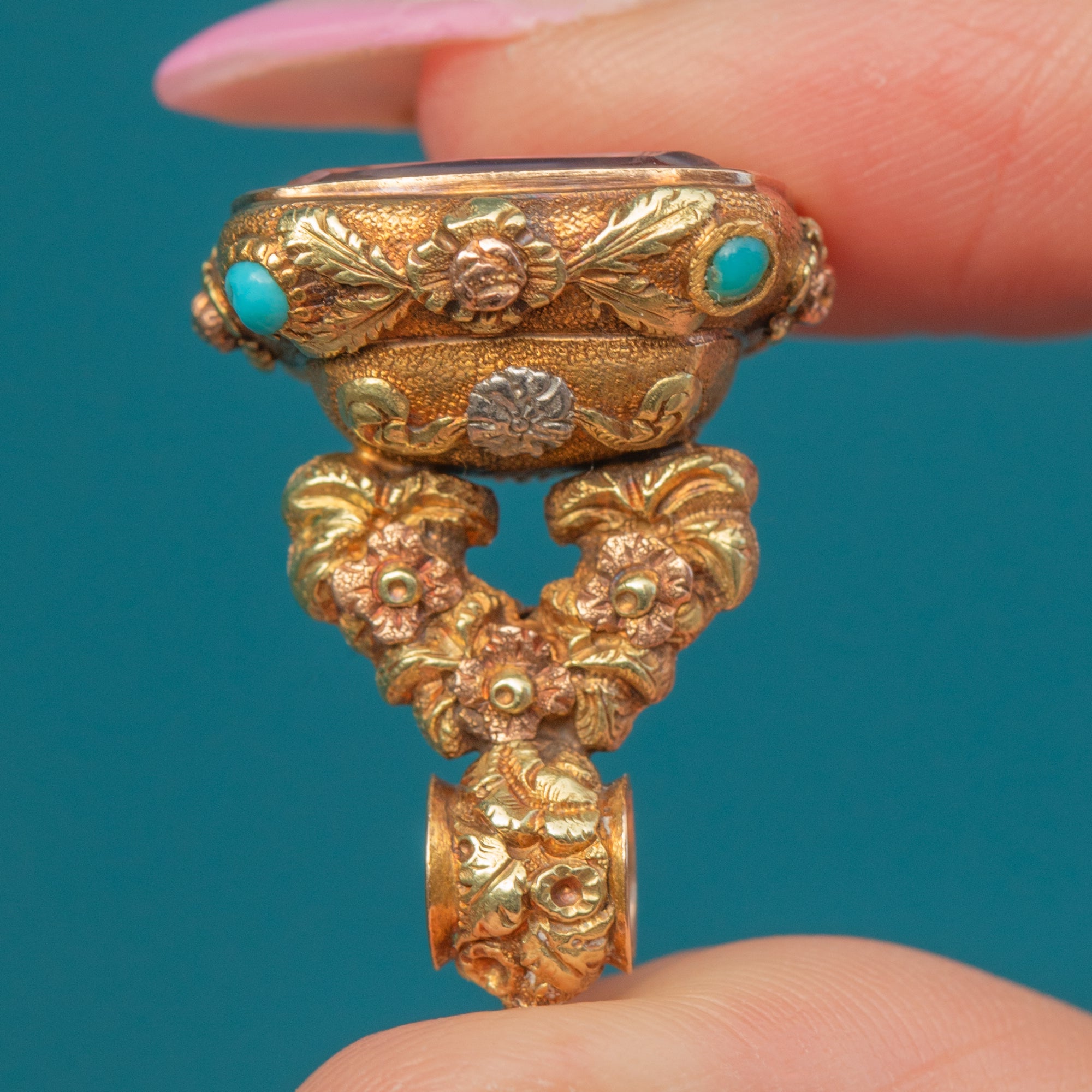 This exquisite Georgian fob, crafted circa 1800, displays a deep foiled Amethyst and delicate Turquoise cabochons set in rich 18ct Gold. The openwork frame and ornate detailing perfectly embody the opulent craftsmanship of the Georgian era.