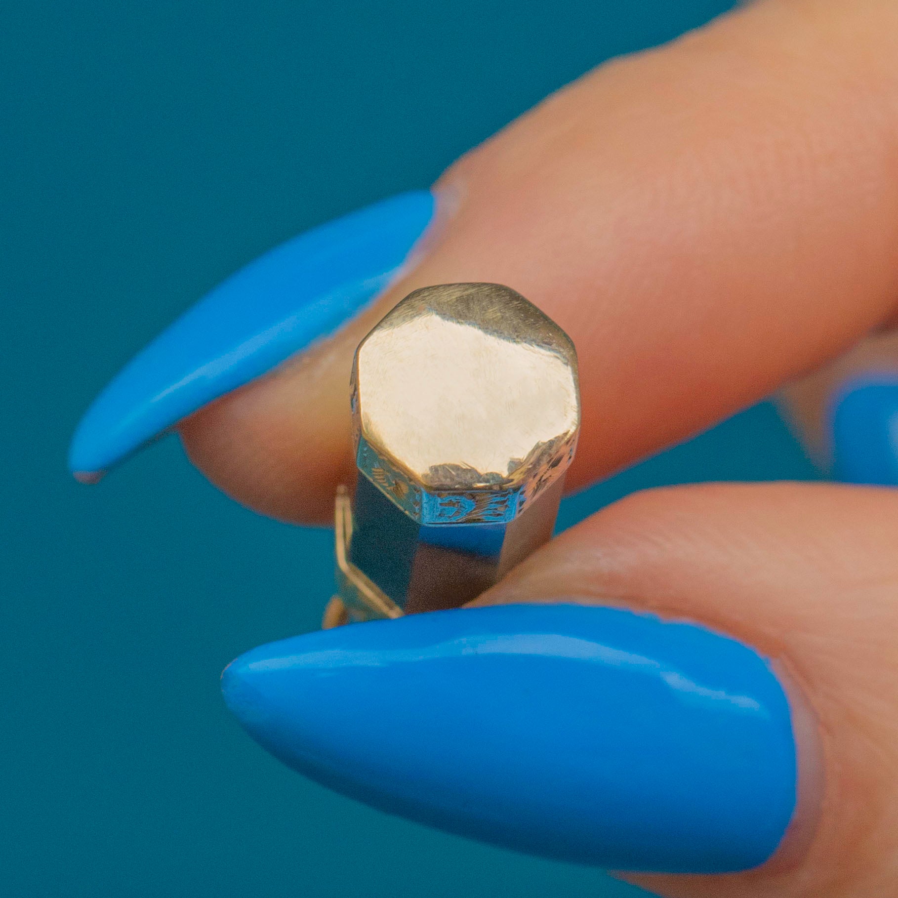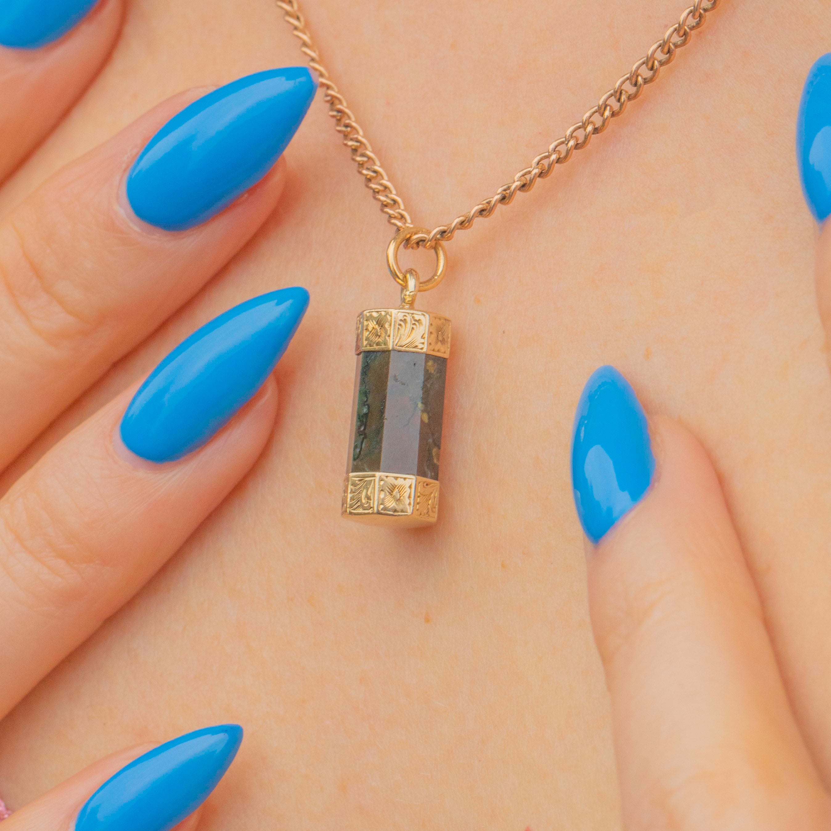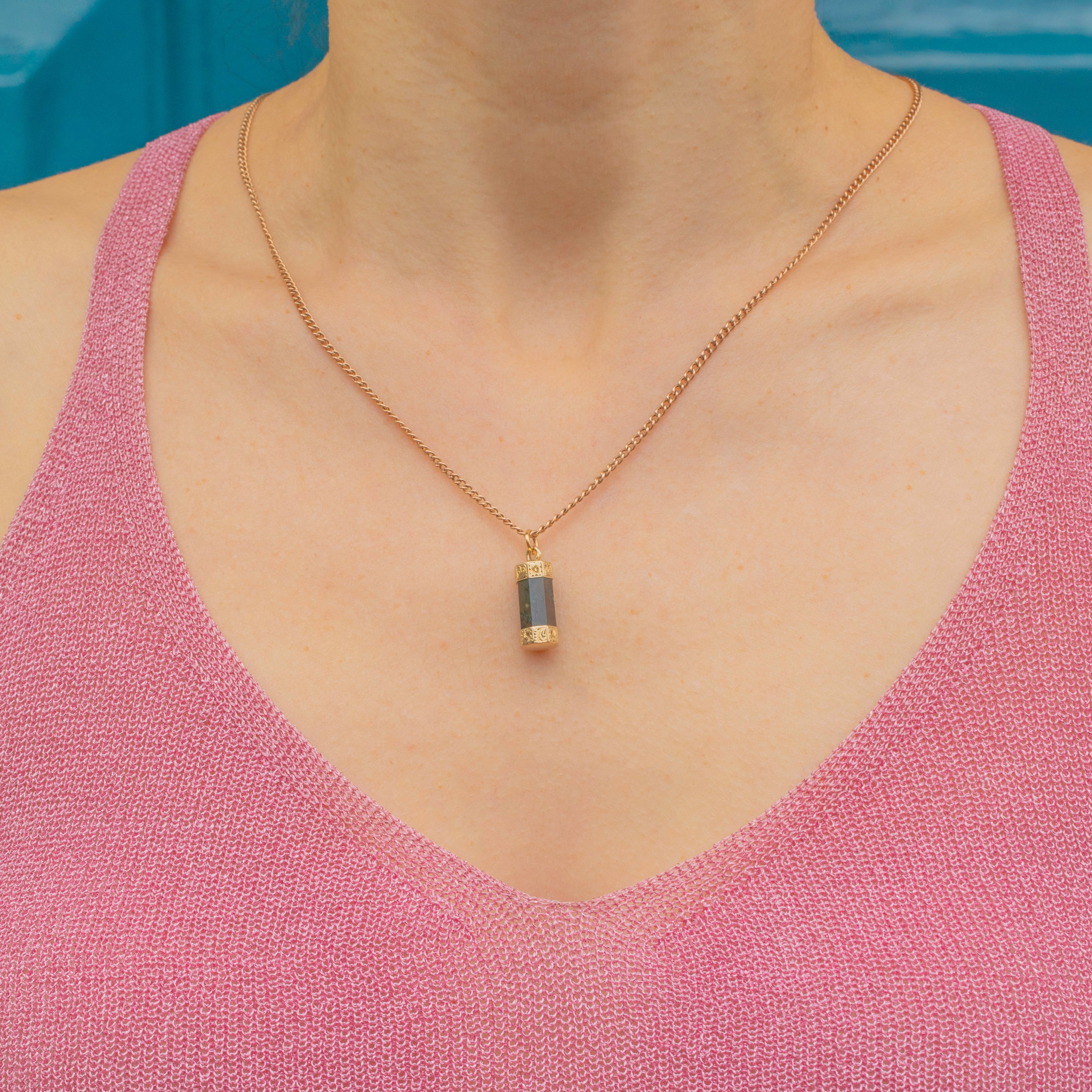 EXCELLENT. This Georgian 9ct Gold Agate Column pendant is in excellent condition. Her Agate is crisply cut into her octagon shape, free from chips or scratches - which is remarkable when considering she is over 200 years old! Her 9ct Gold engraved panels are crisp with no visible wear. All in all, she's a gothic dream and your new favourite pendant!