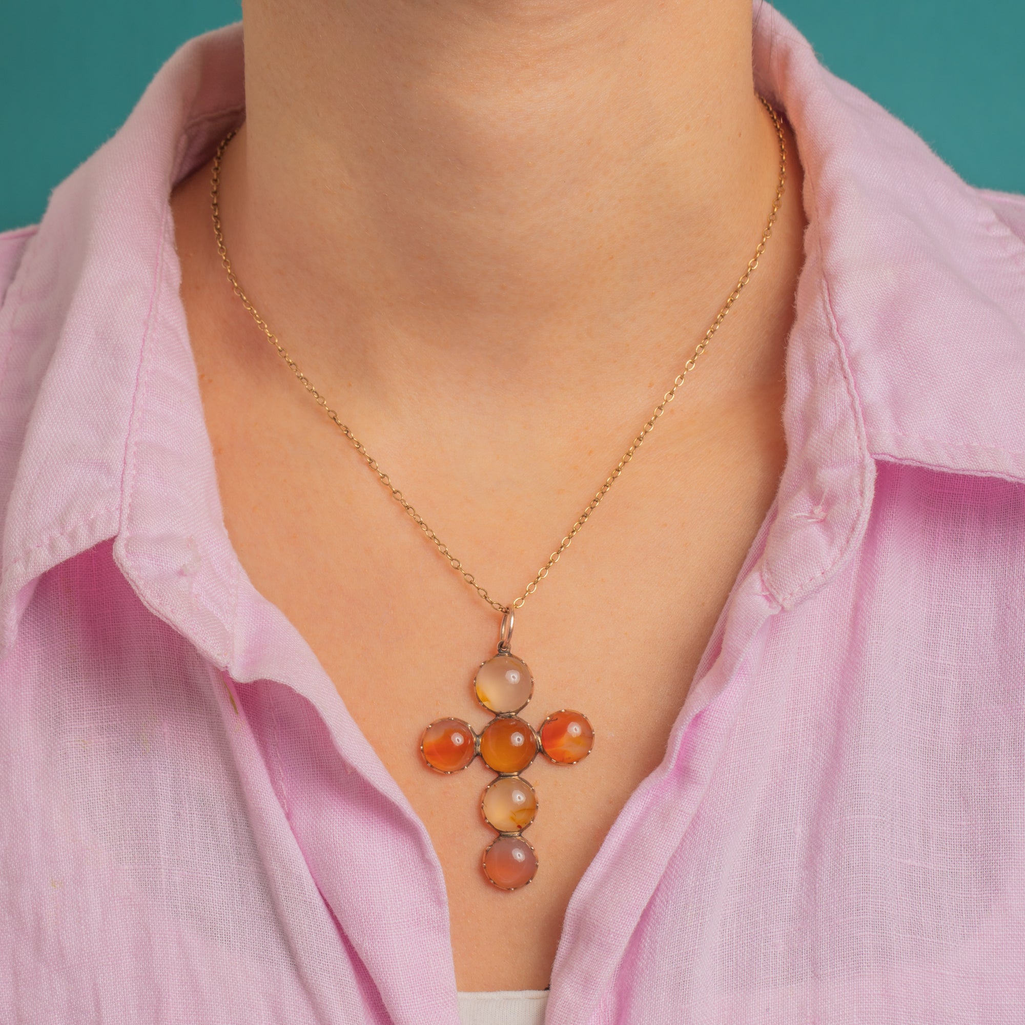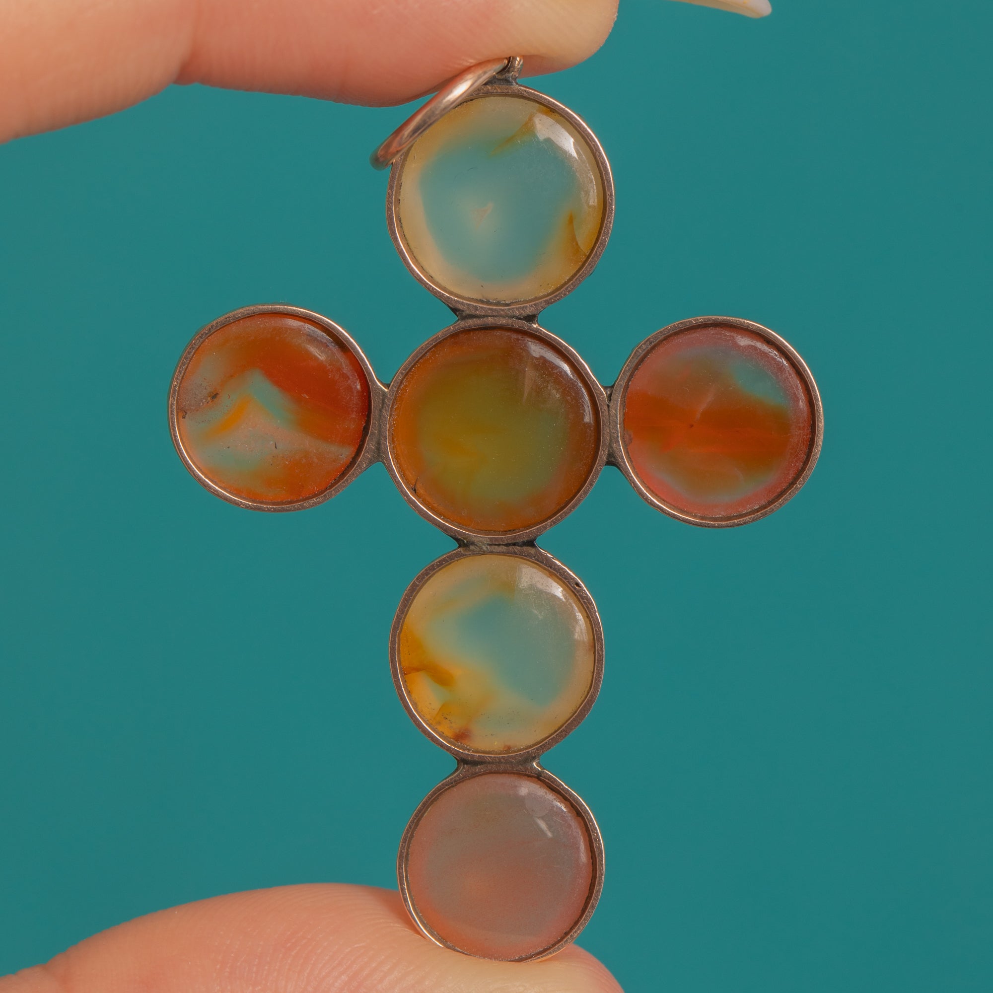 A soulful Georgian cross pendant composed of six round Agate cabochons, each high-domed and cradled in characterful cut-down “pie-crust” collet settings. The collets are hand-soldered edge-to-edge to form a classic Latin cross, crowned with a simple jump ring for easy wear.