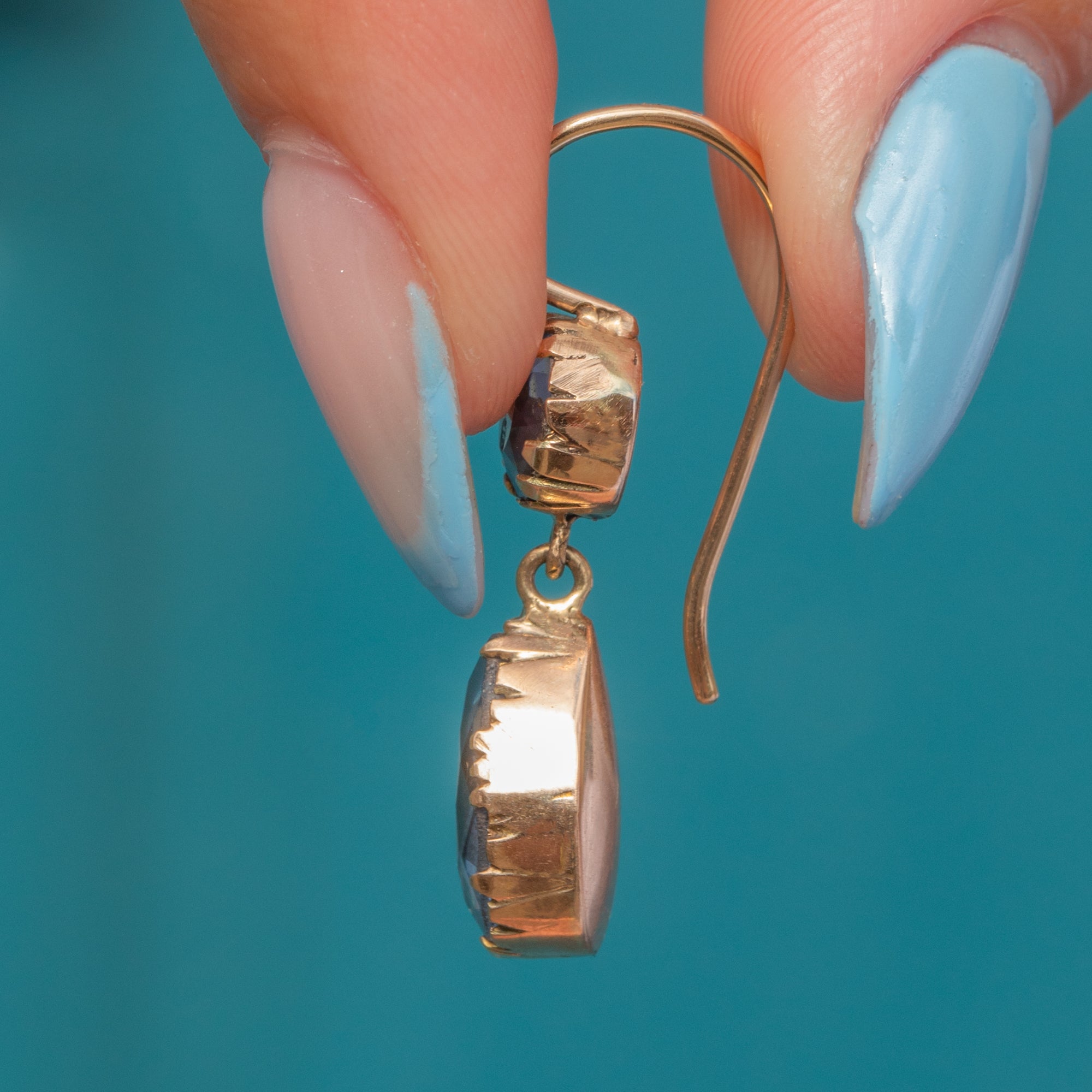 VERY GOOD-EXCELLENT: Each Paste is radiant and secure in its settings, and despite one round stone having a small nibble, this is only evident upon close inspection. The Gold is bright and glossy with only minimal wear consistent with age. With secure hooks, these Georgian drop earrings can be worn with confidence.