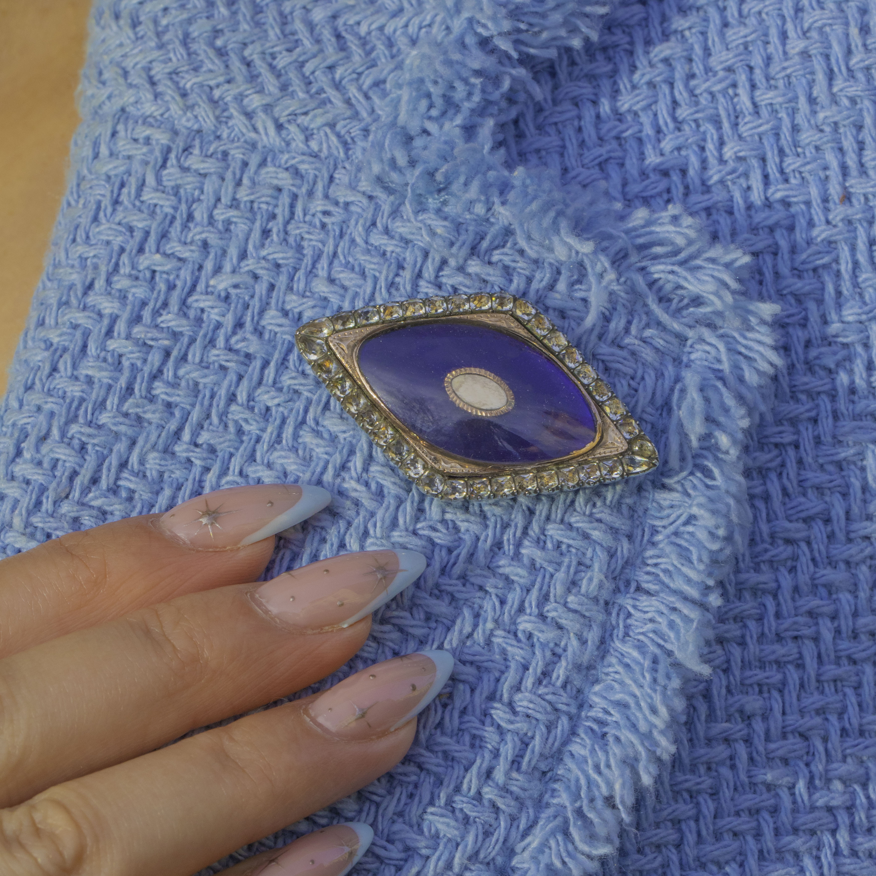 A beautifully romantic Georgian friendship brooch, centred with a rich Bristol Blue Glass panel framed by a glittering border of White Paste. The elongated marquise form is classic of the era, with delicate engraved details that give the whole piece a wonderful sense of depth and refinement.