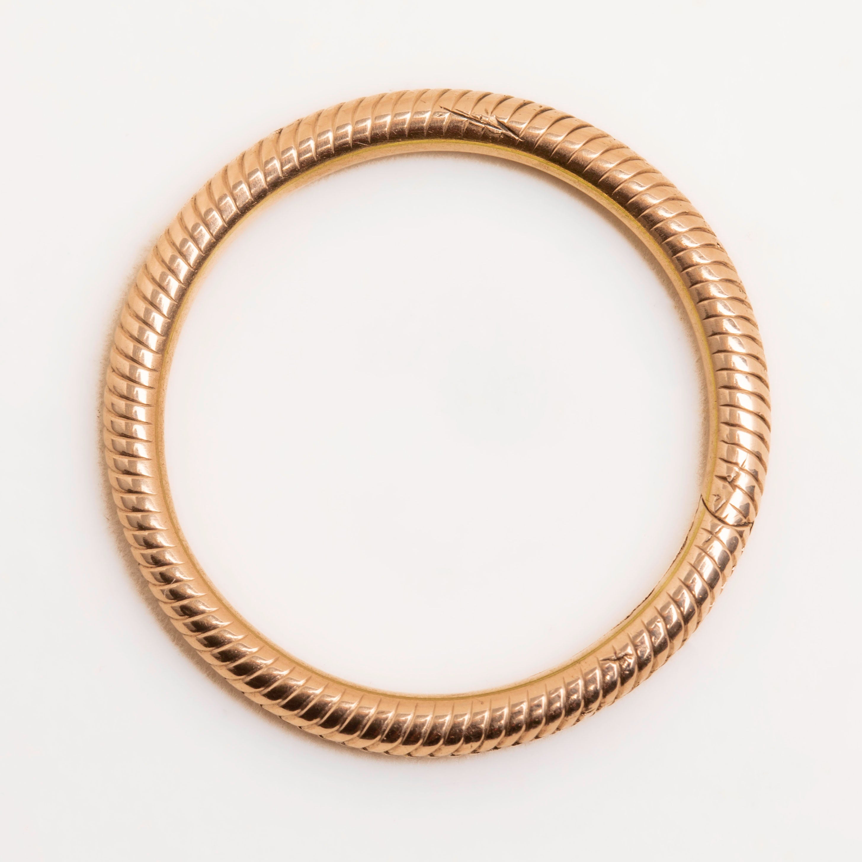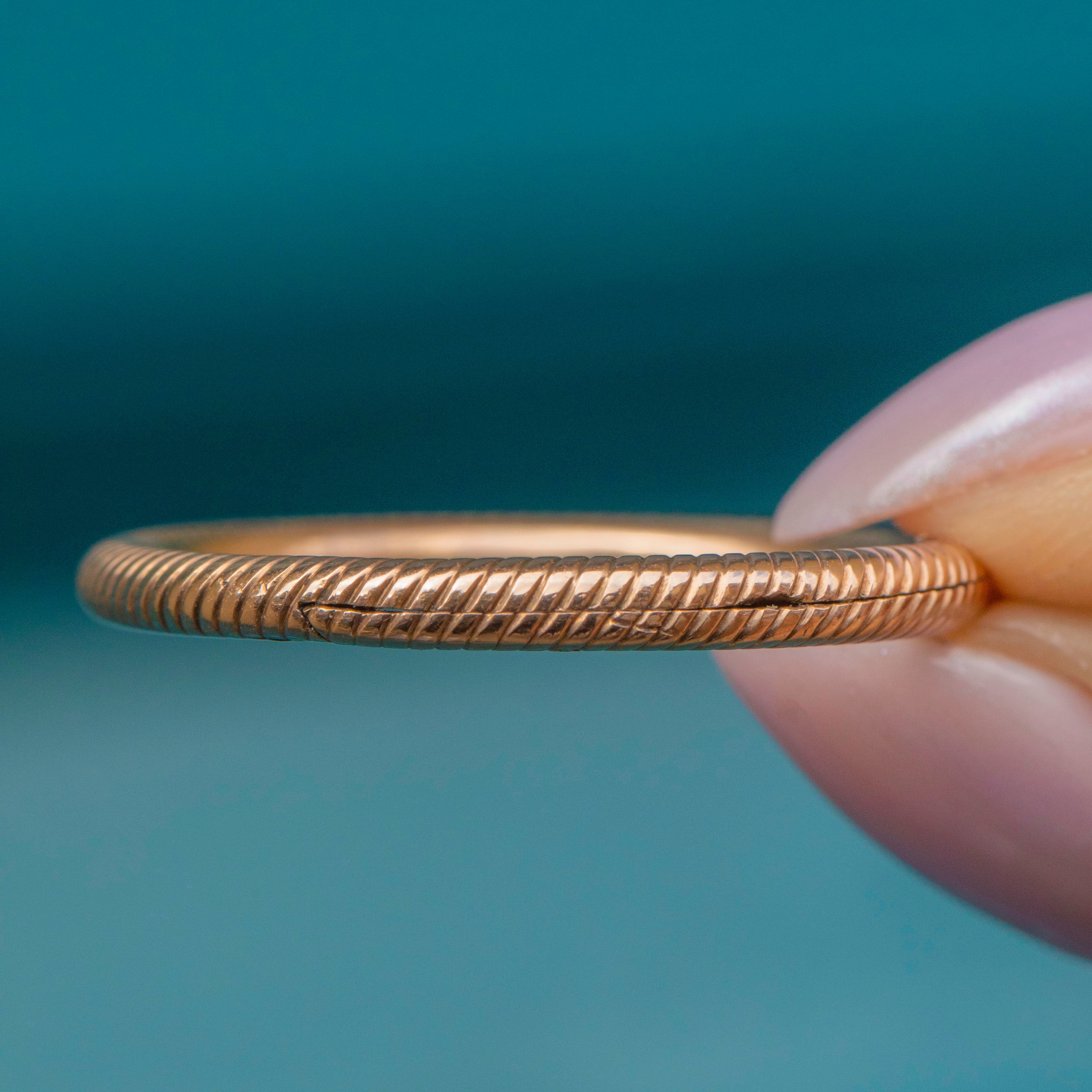 VERY GOOD. This Georgian 9ct Gold engraved split ring is in wonderful condition, especially when considering she is at least 200 years old! The engravings are all pristine, and the split ring can be easily opened and secured. While she does have a small scratch, this is only visible under close scrutiny and does not affect the impact of this wonderful piece!