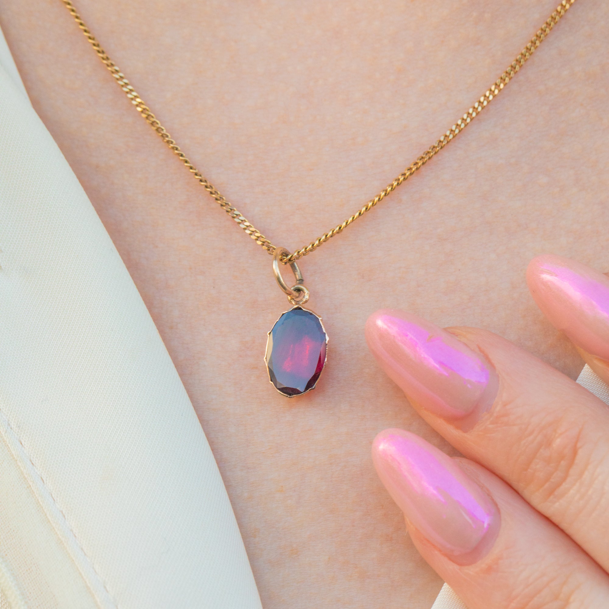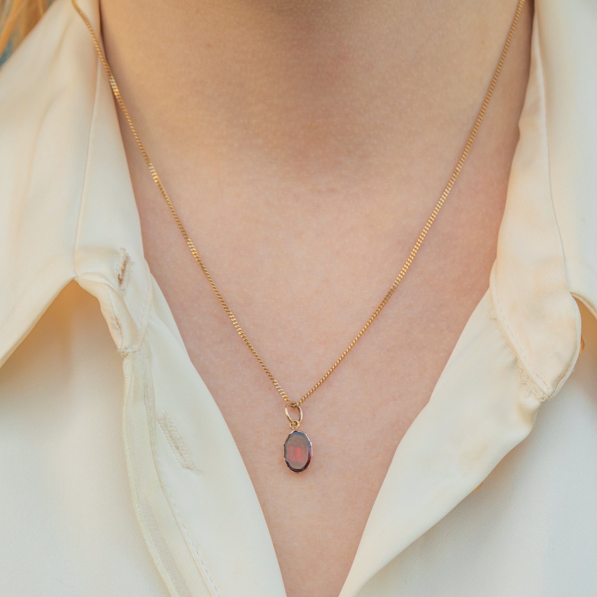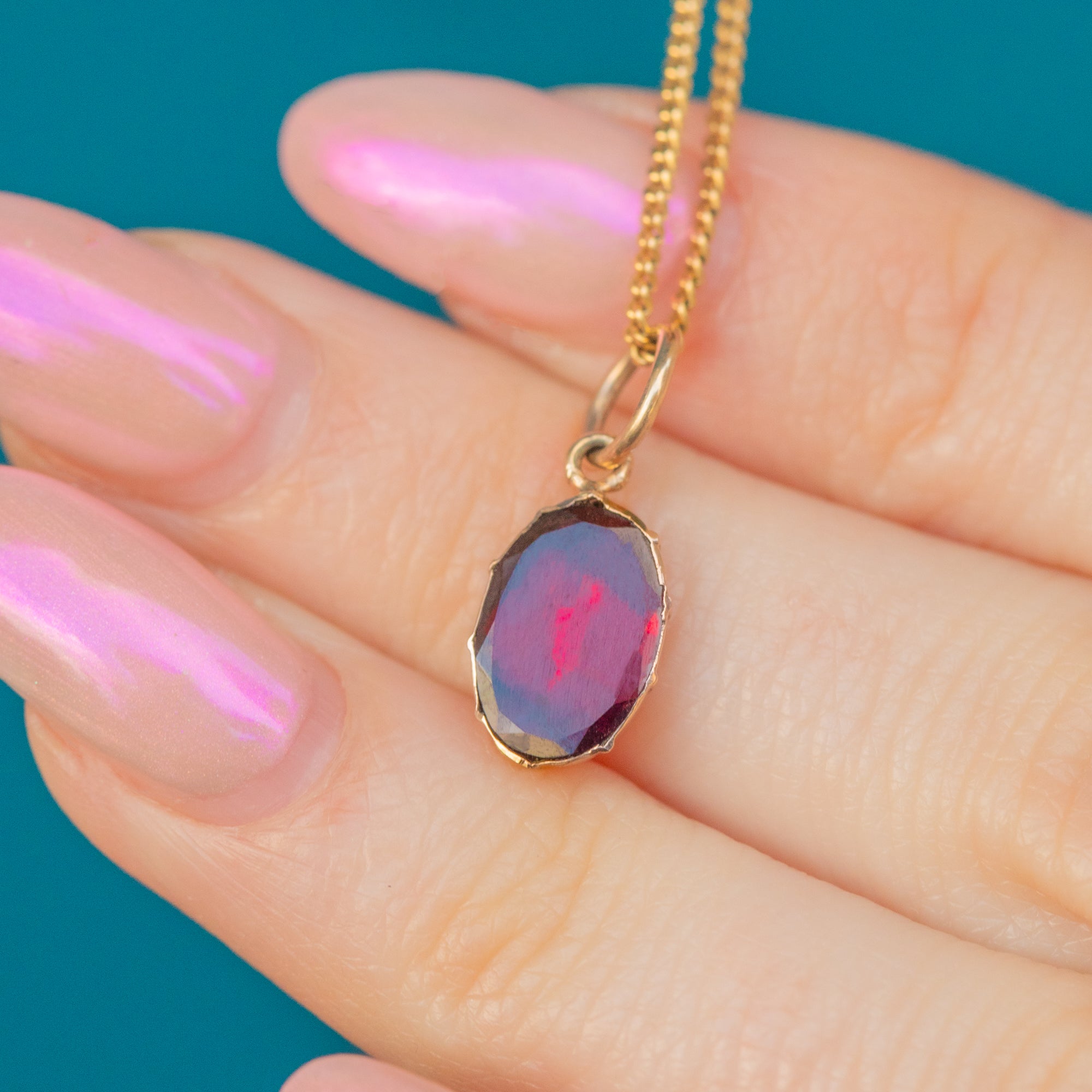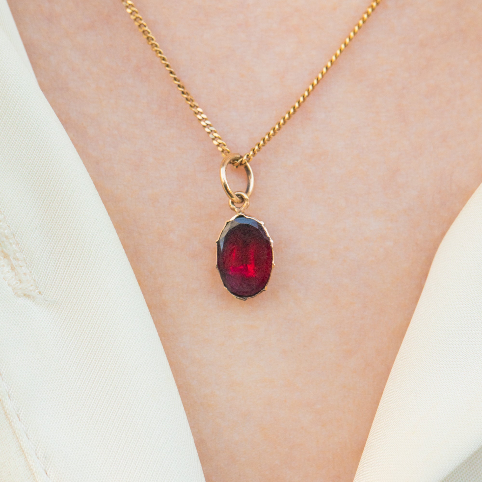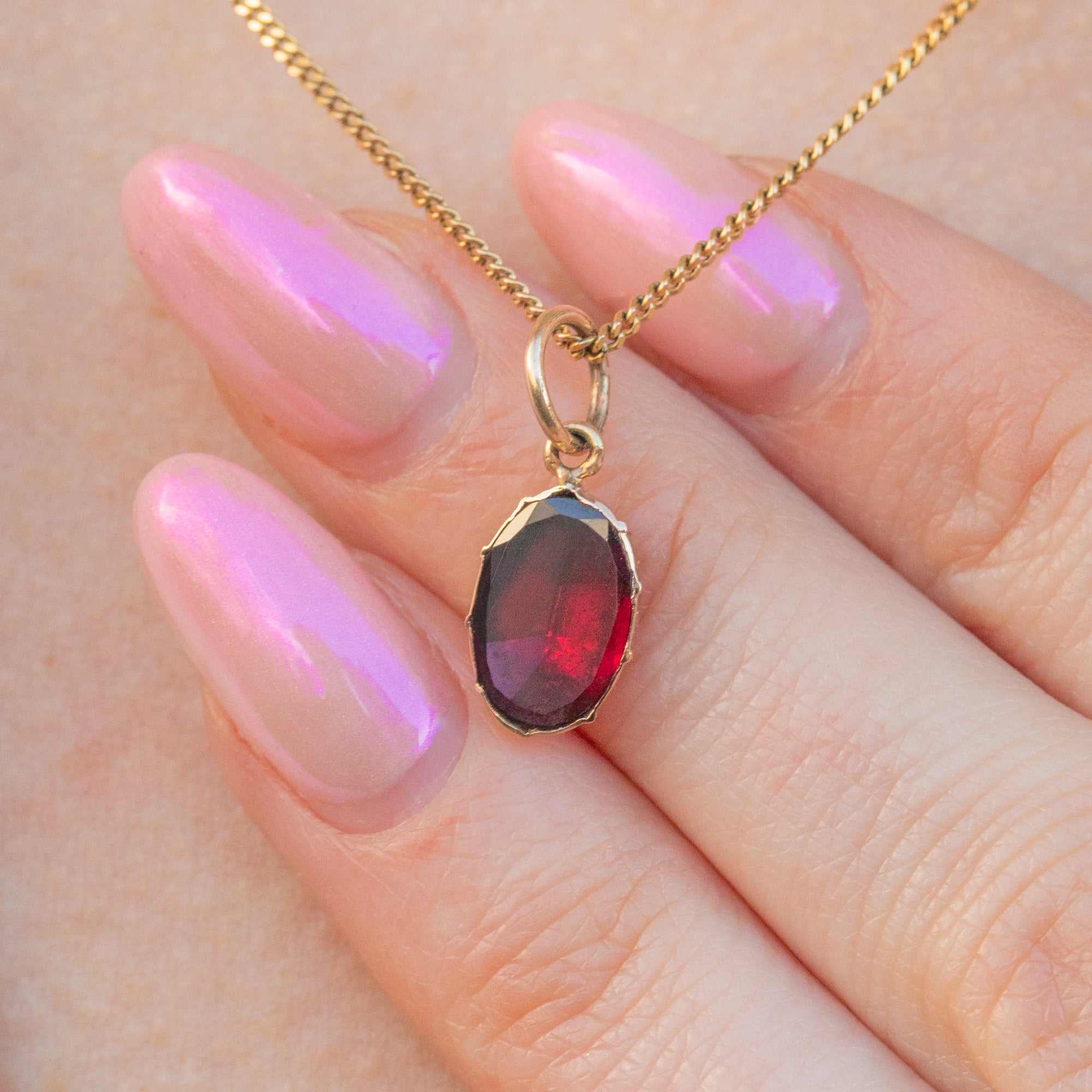 The Garnet's vibrant berry-red hue is enhanced by its foiled back, a signature feature of Georgian jewellery. She looks stunning when paired with a delicate Gold chain, making her a versatile piece that complements both casual and formal styles beautifully.