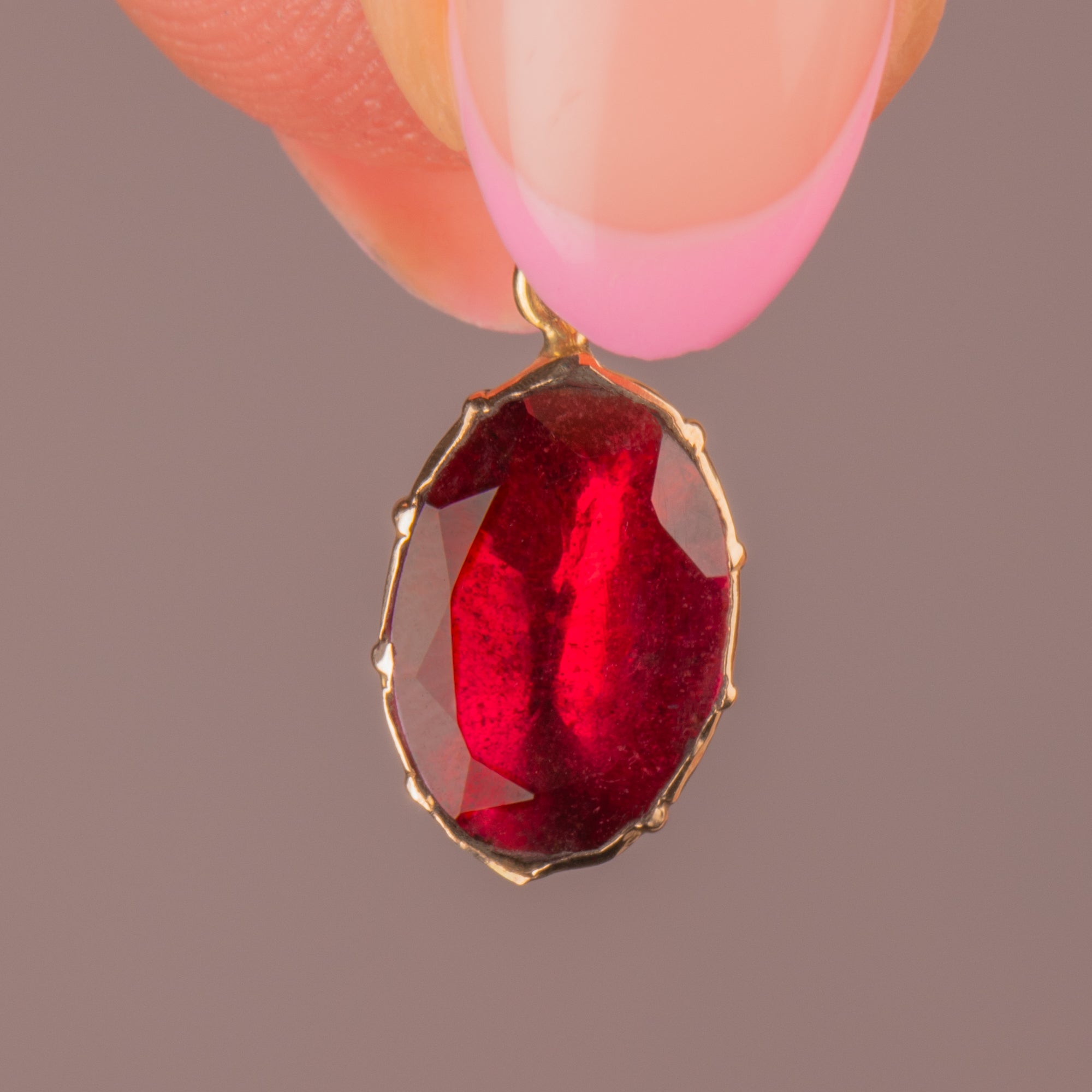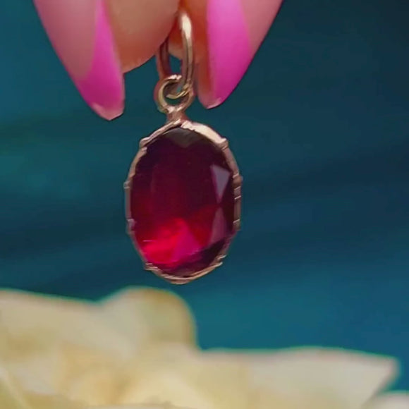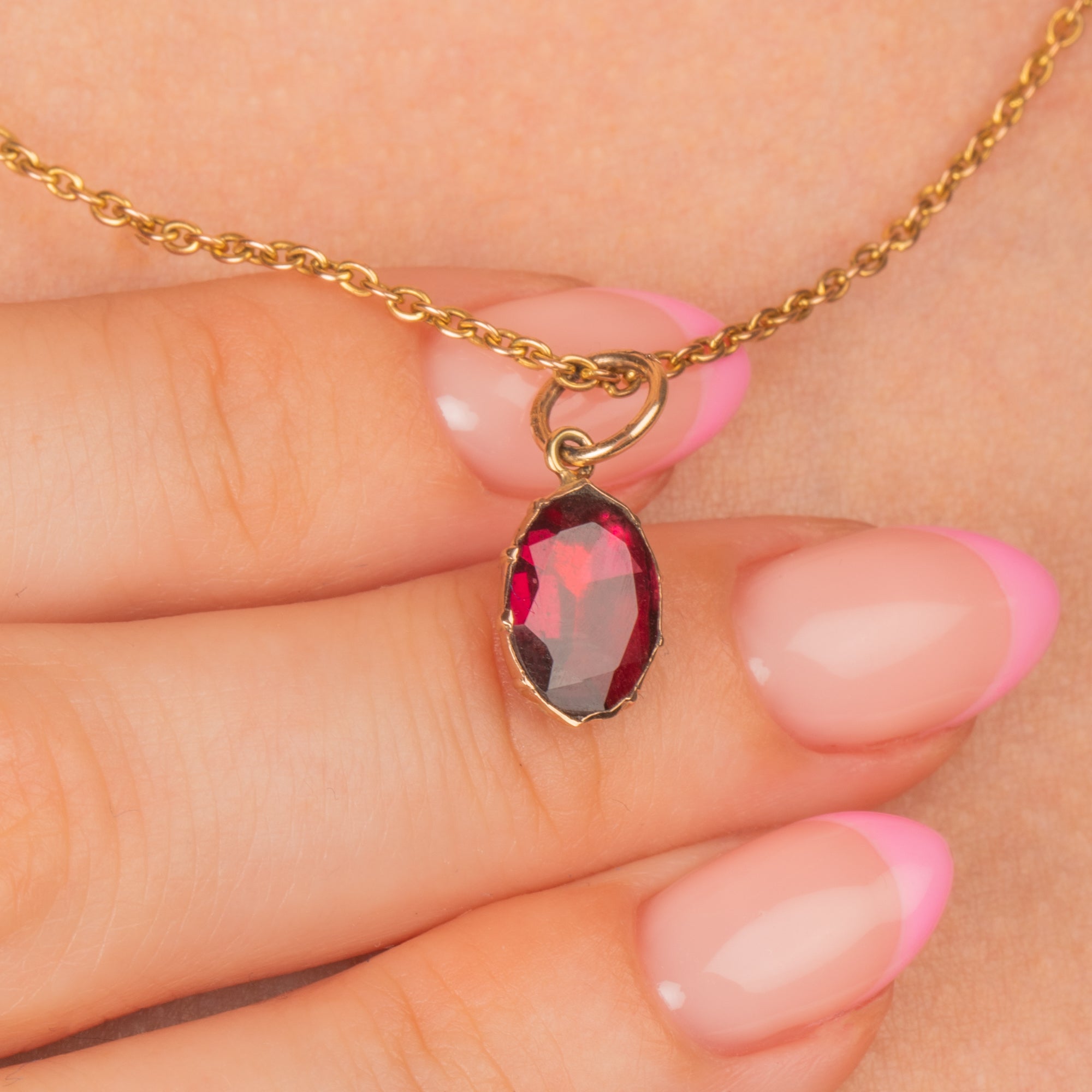 A deliciously juicy 9ct Gold Georgian flat-cut Garnet charm to liven up your necklace stacks. The Garnet has a gorgeous merlot hue, whilst her faceted, foiled form reveals fabulous flashes of purple under the light.