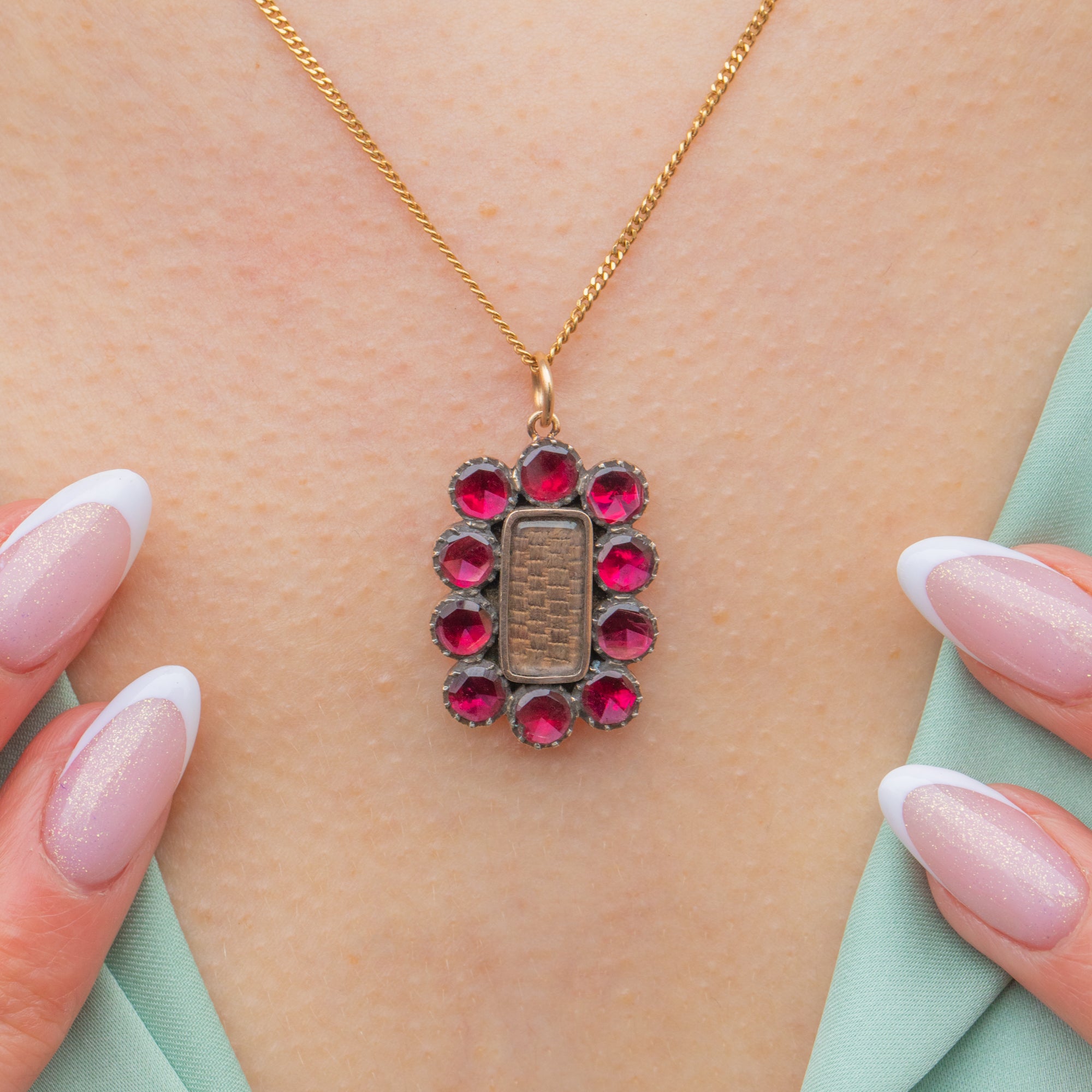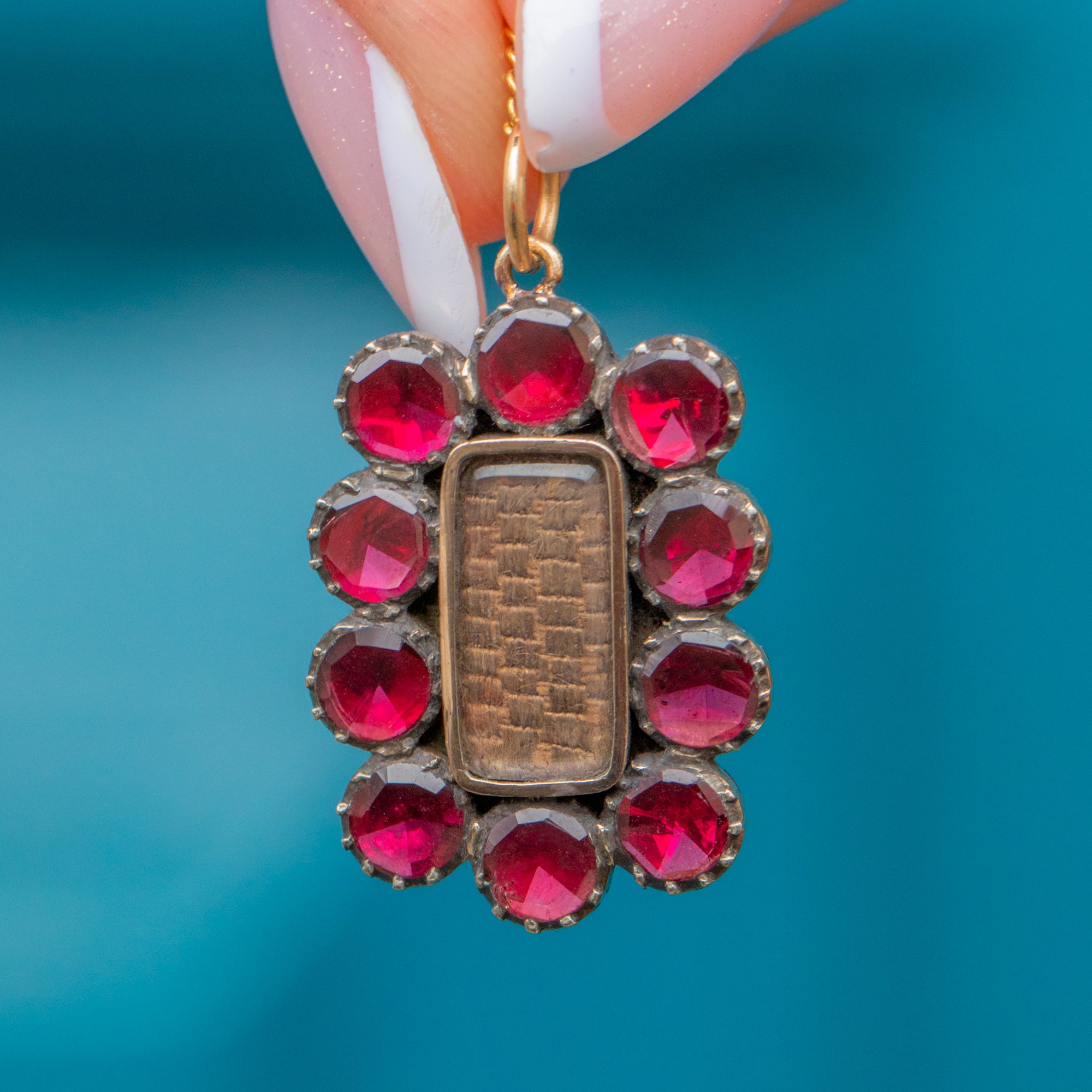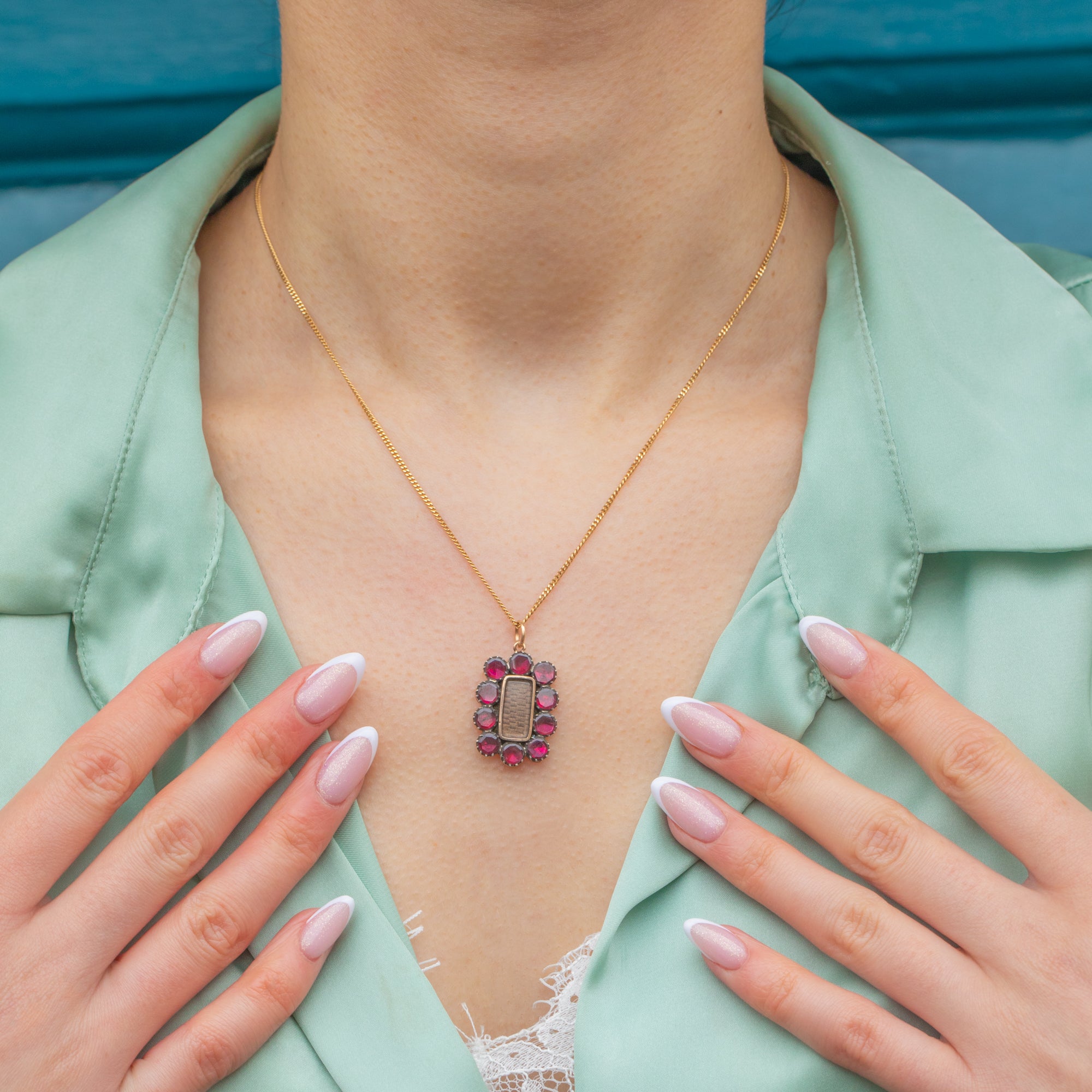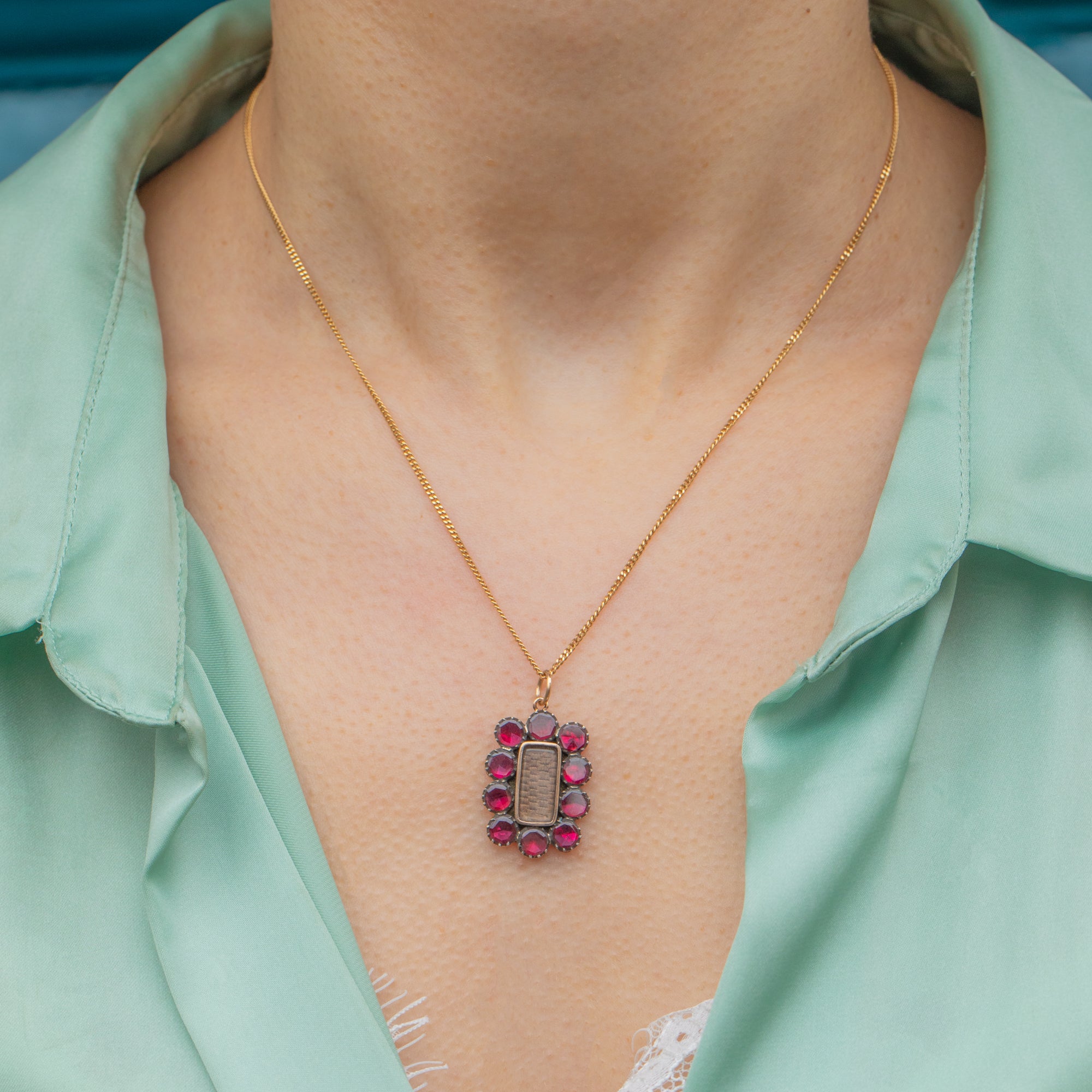 Mourning jewellery was a popular way to commemorate the passing of a loved one during the Georgian era, and this particular pendant displays a panel of neatly woven hair as its focal point. A row of vibrant flat-cut Garnets halo the centrepiece, flashing with scarlet hues as their foils catch the light, displayed within classically Georgian piecrust settings.