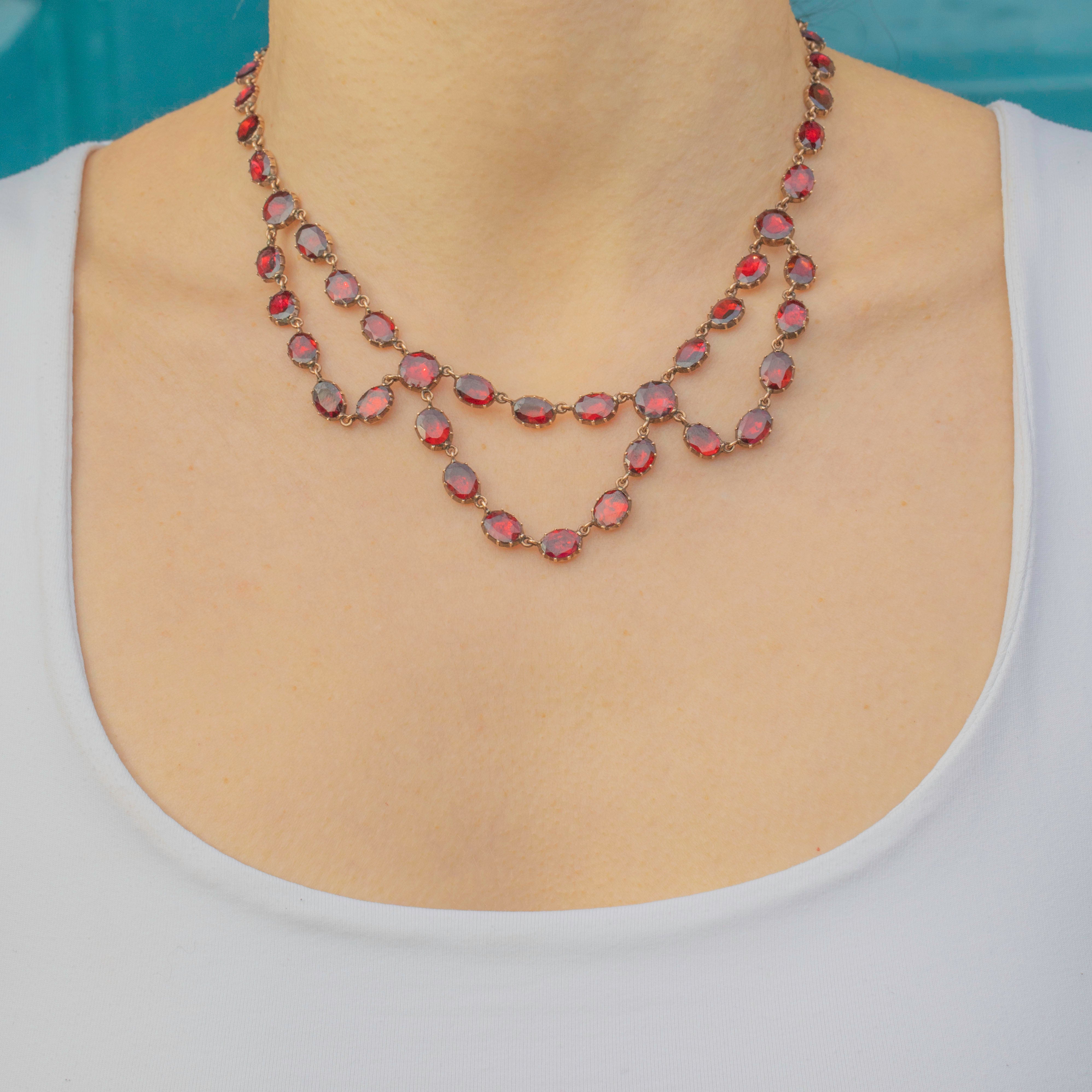 EXCELLENT: This Georgian 9ct Gold flat-cut Garnet swag necklace is in excellent condition! Each Garnet has been meticulously preserved and retains a gorgeous saturation. With a secure clasp, you can wear this antique necklace with the utmost confidence.