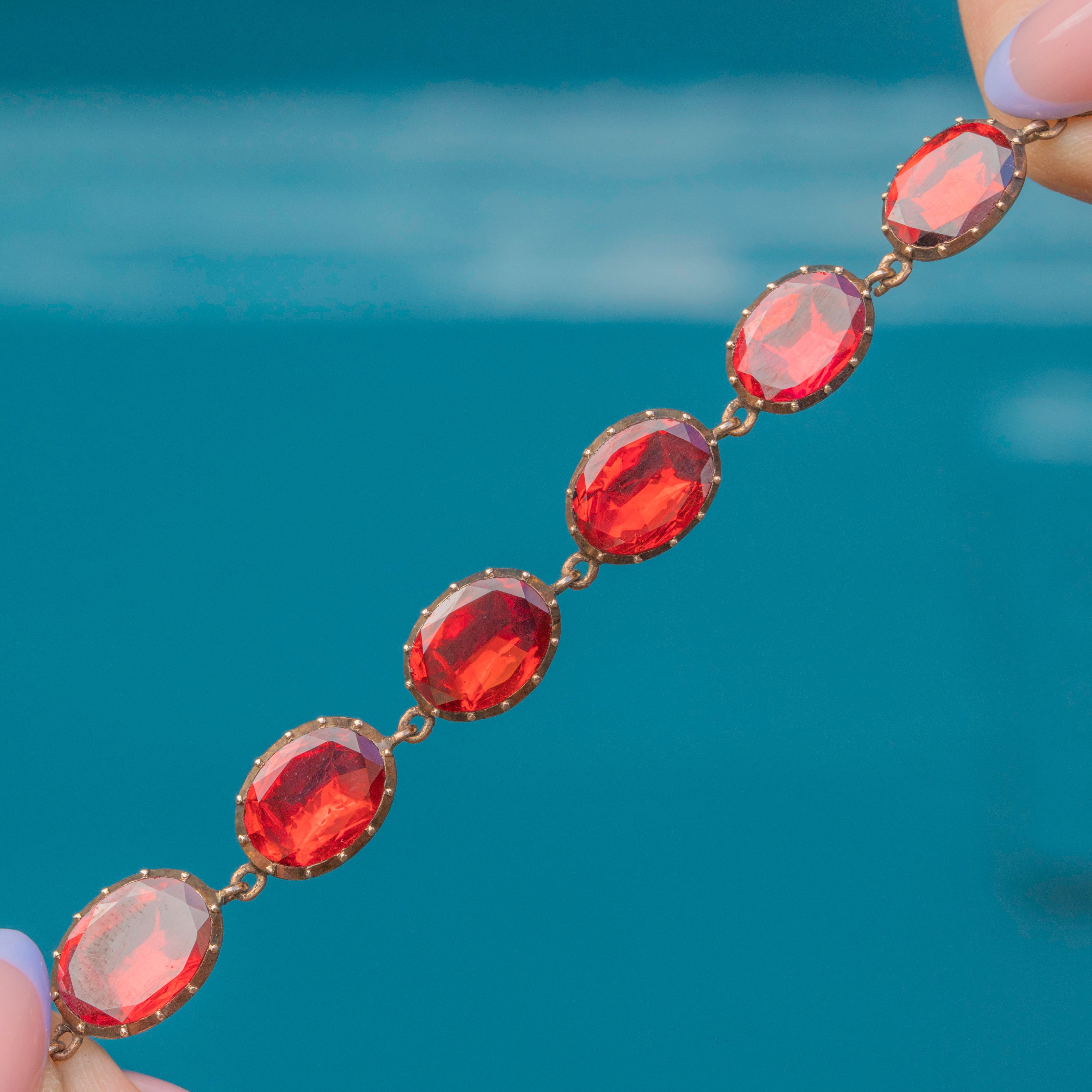 Radiating regency era glamour, this Georgian 9ct Gold flat-cut Garnet riviere necklace is a fabulous piece! Boasting 34 juicy foiled-flat cut Garnets, akin to glistening pools of sangria, this riviere necklace cascades across your décolletage with an undeniable elegance.