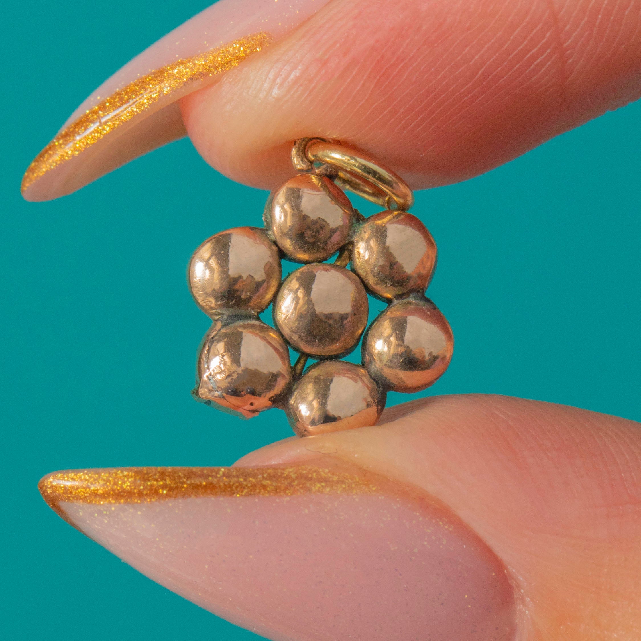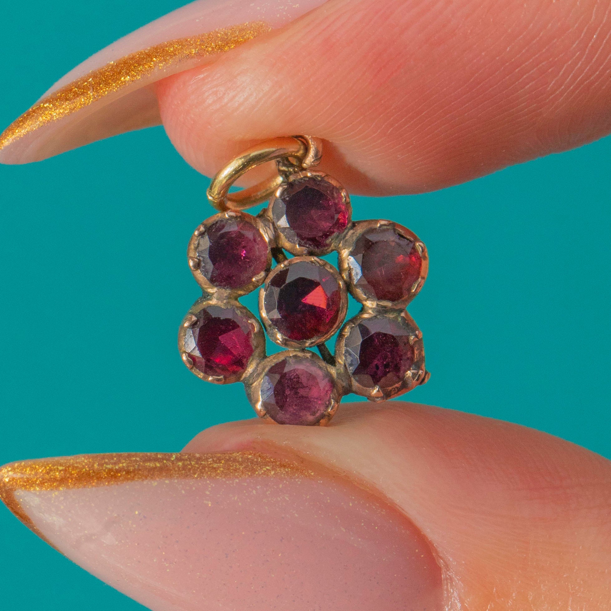 This beautiful Georgian flower cluster charm is set with glowing foiled Garnets in a warm 9ct Gold closed-back setting.