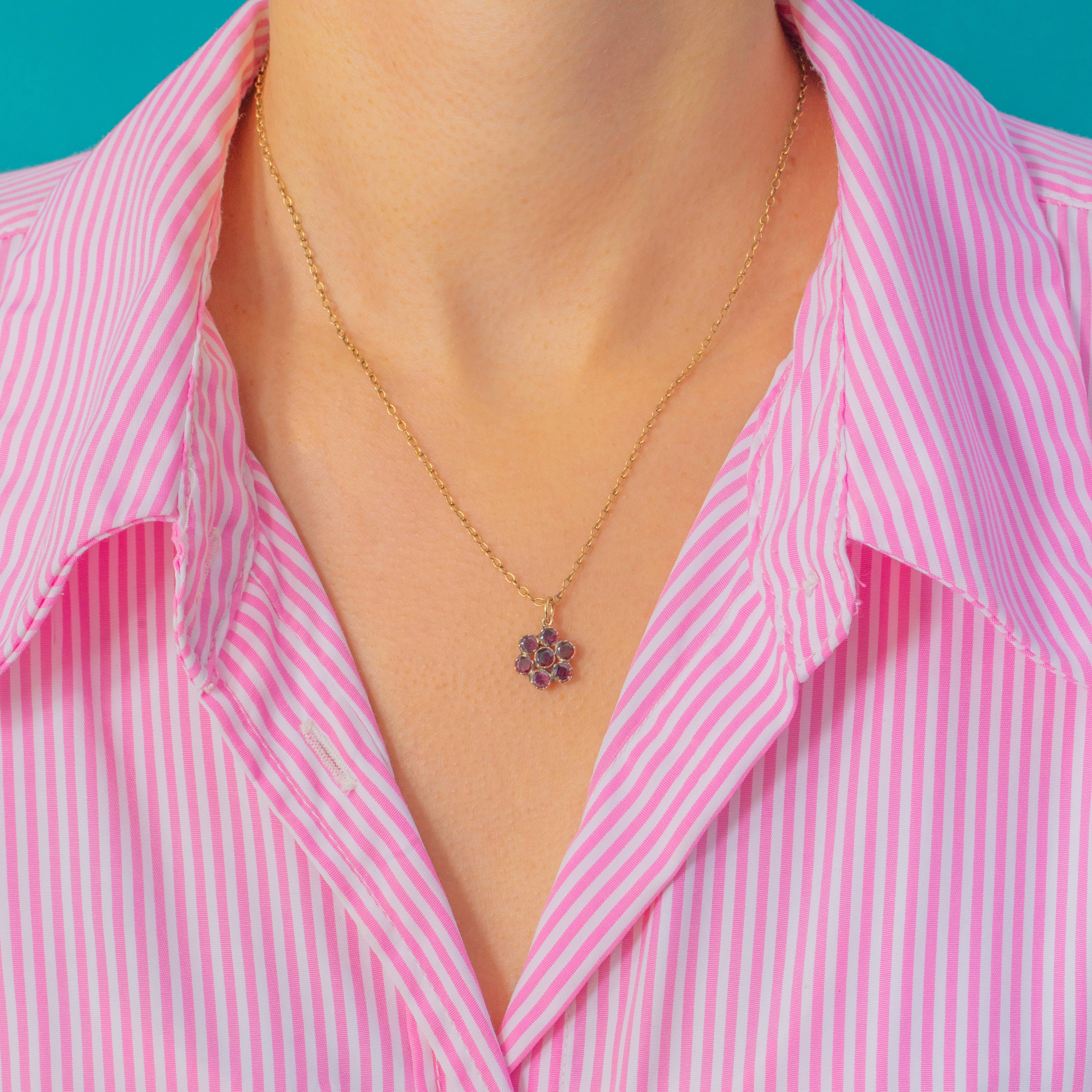 Each stone radiates a deep wine-red hue, arranged in a pretty floral design typical of the early 19th century. Petite yet full of character, it’s a wonderful survivor from the Georgian era, perfect to wear as a pendant or to add to a charm bracelet for a touch of antique romance.