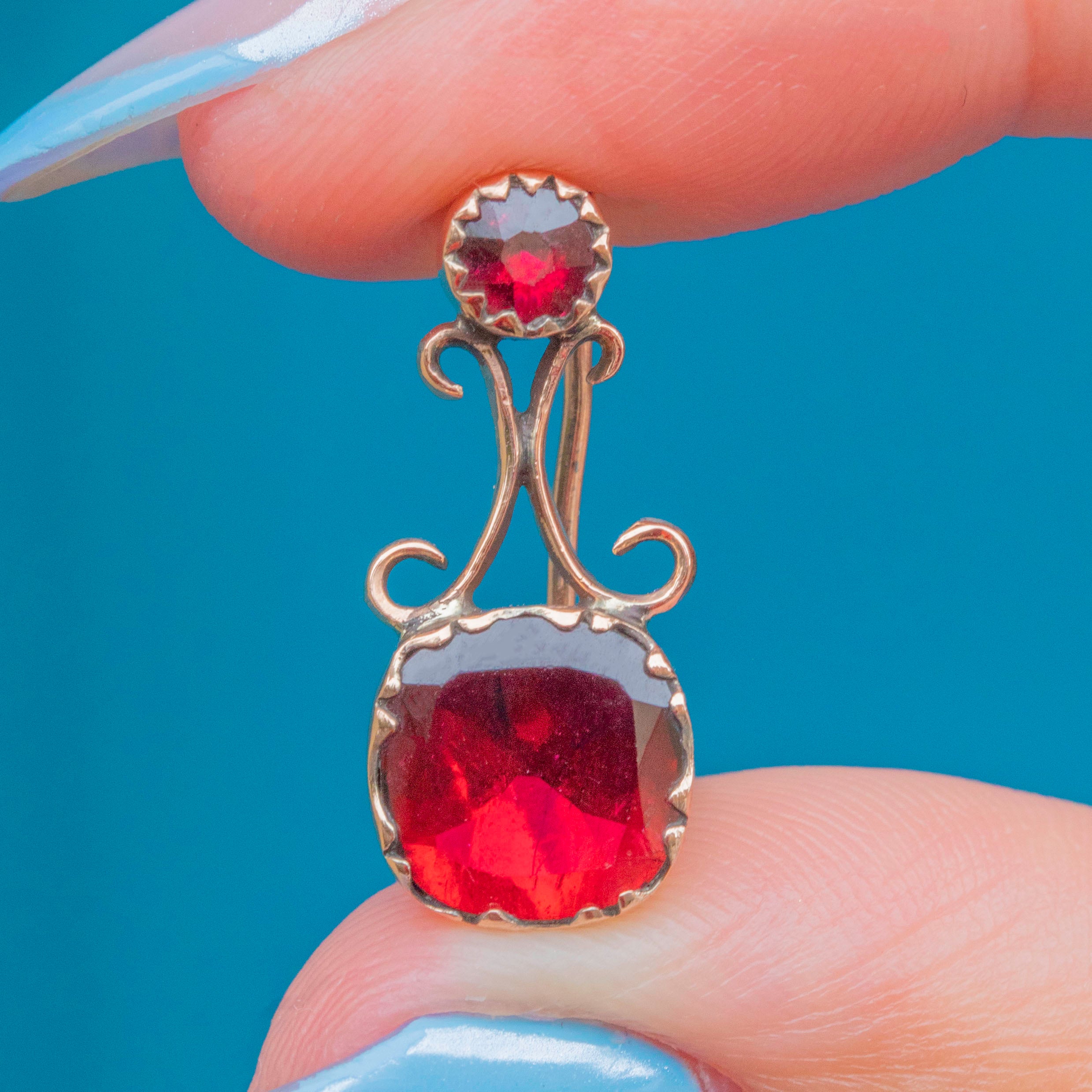 The Garnets are set within typically Georgian decorative settings, crafted from rosy 9ct Gold.