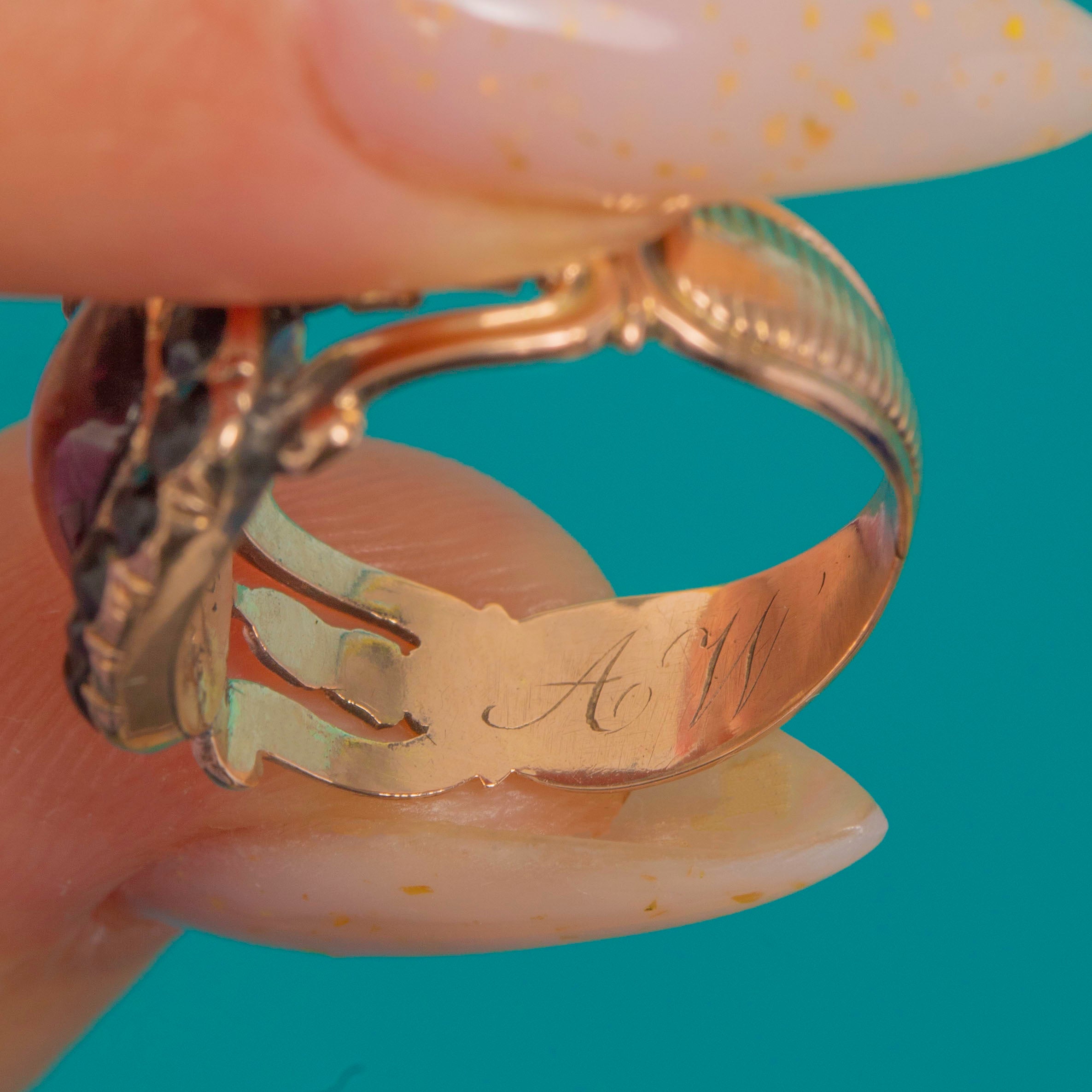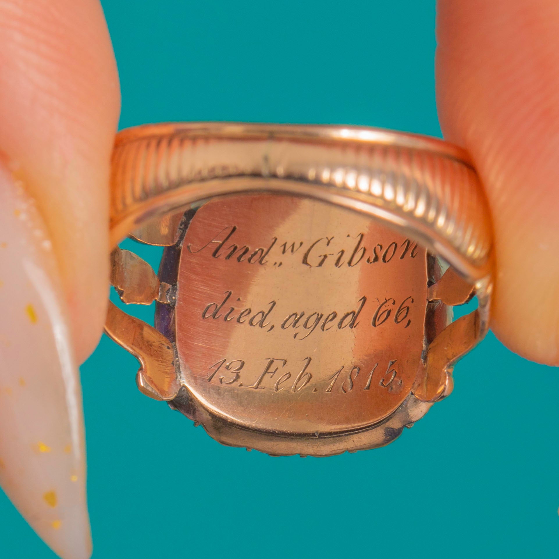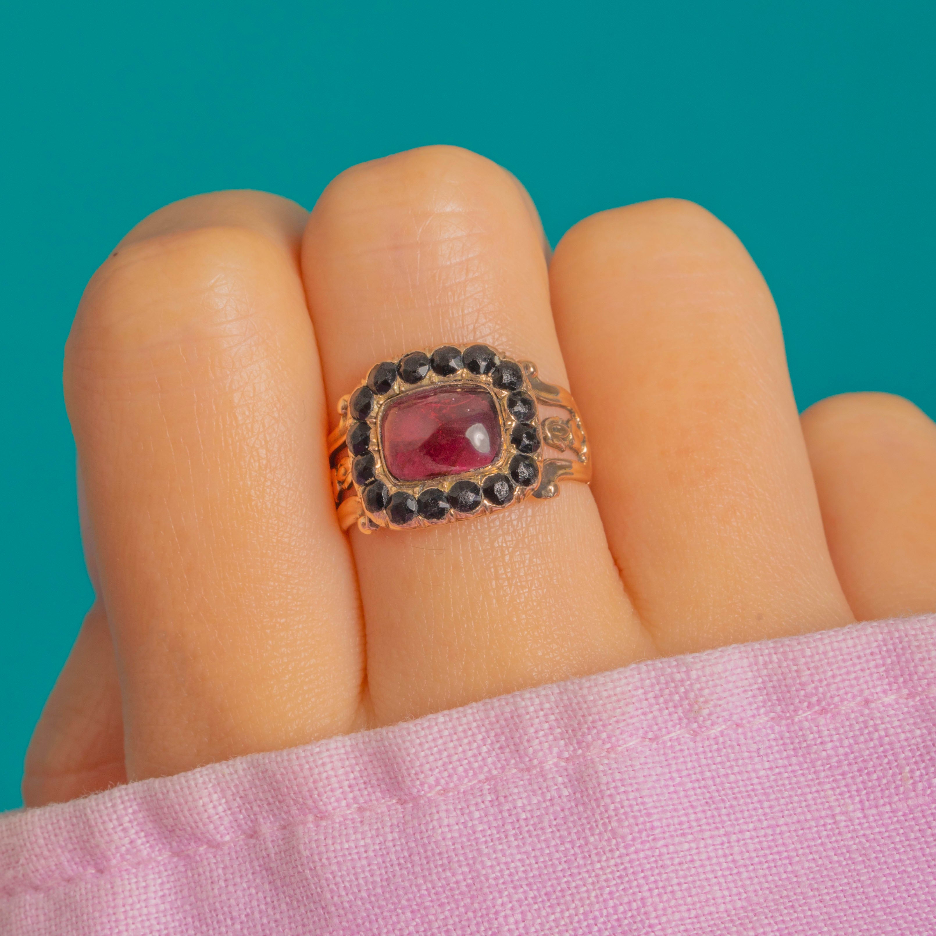 Individually piecrust-set round Jet stones encircle the rectangular Garnet, with an inscription on the back reading "And W Gibson died, age 66, 13.Feb.1815". Split scrolled shoulders with subtle pellet details flow into a multi-split shank, creating an ornate yet compact jewel with a low-to-mid profile—beautifully wearable and richly evocative of Georgian craftsmanship.