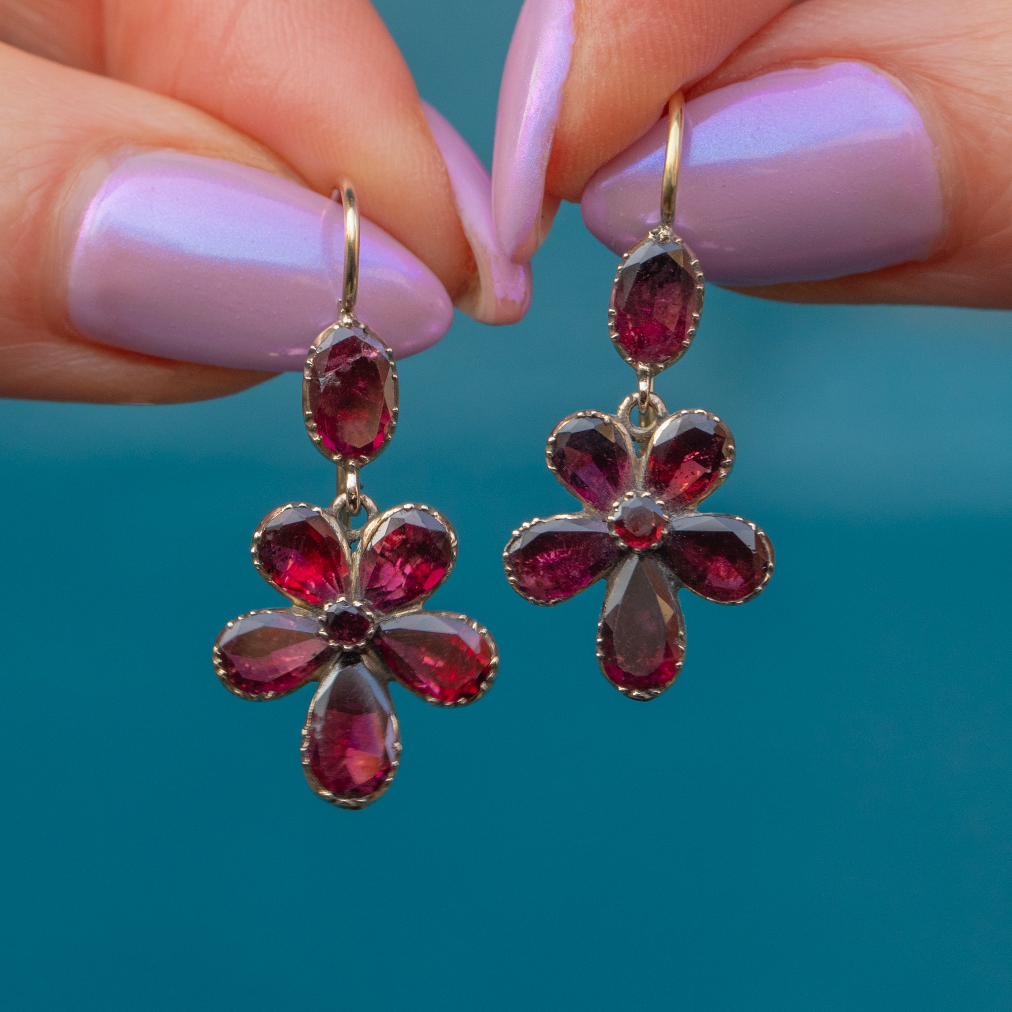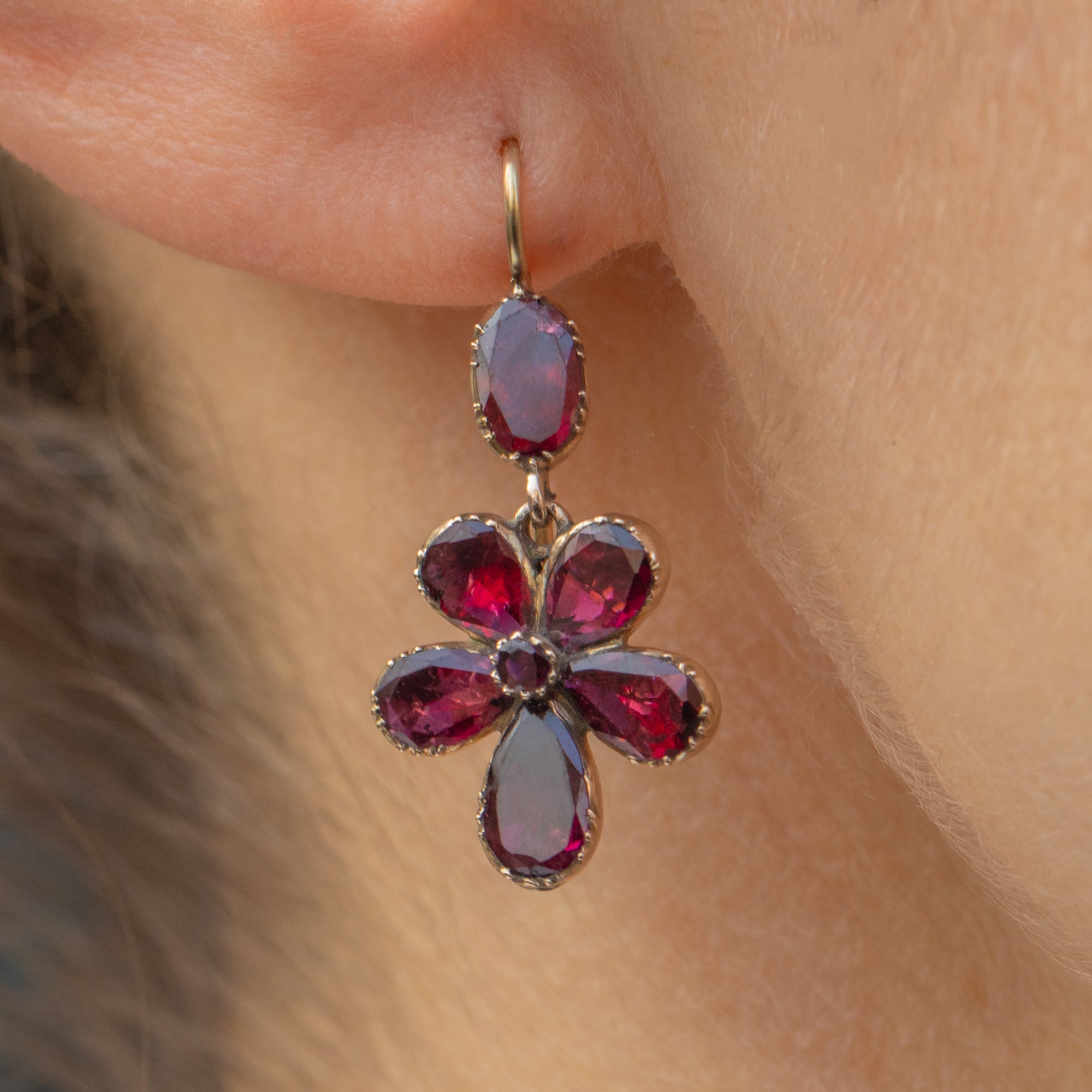 Each earring features seven rich, flat-cut Garnets arranged to create a gorgeous pansy motif, with radiant deep fuchsia hues wonderfully complemented by buttery 9ct Gold piecrust settings.