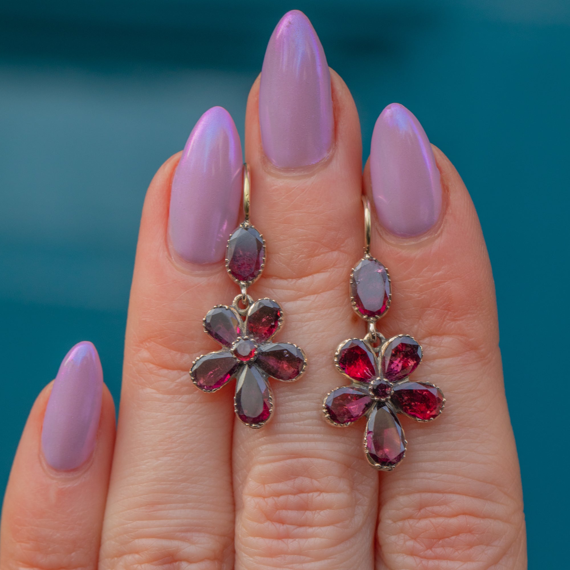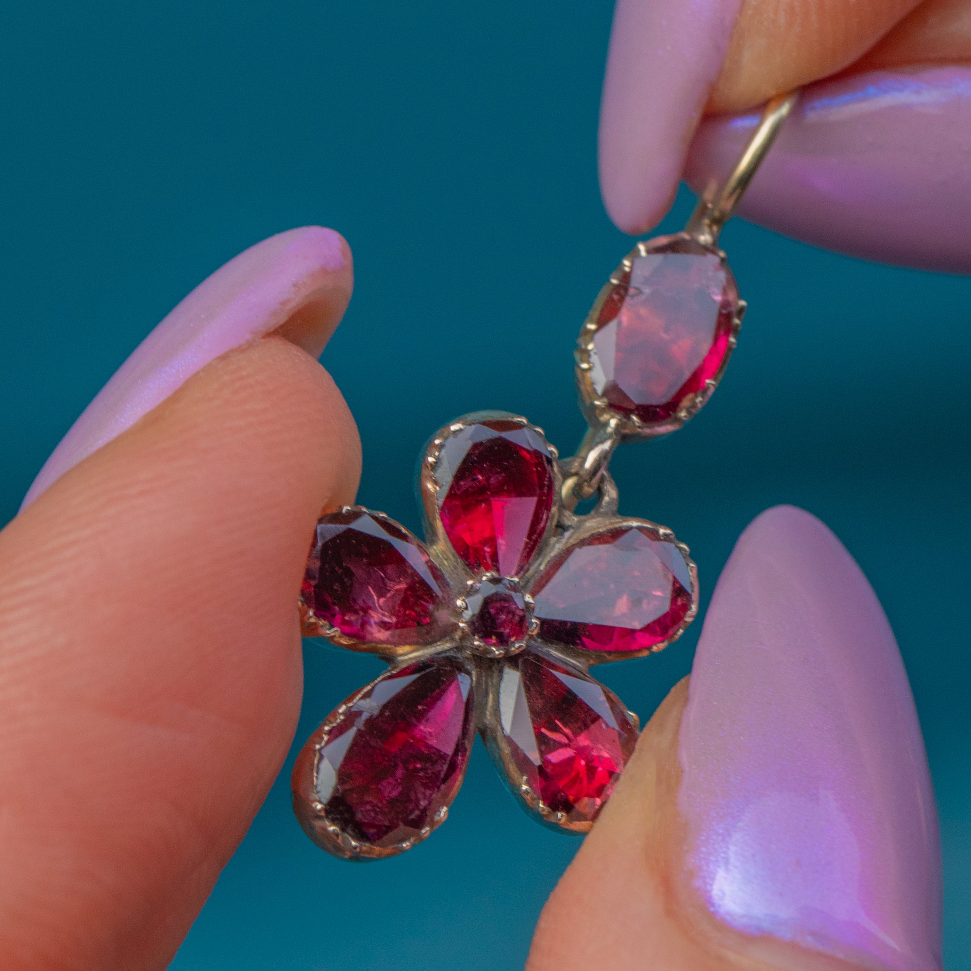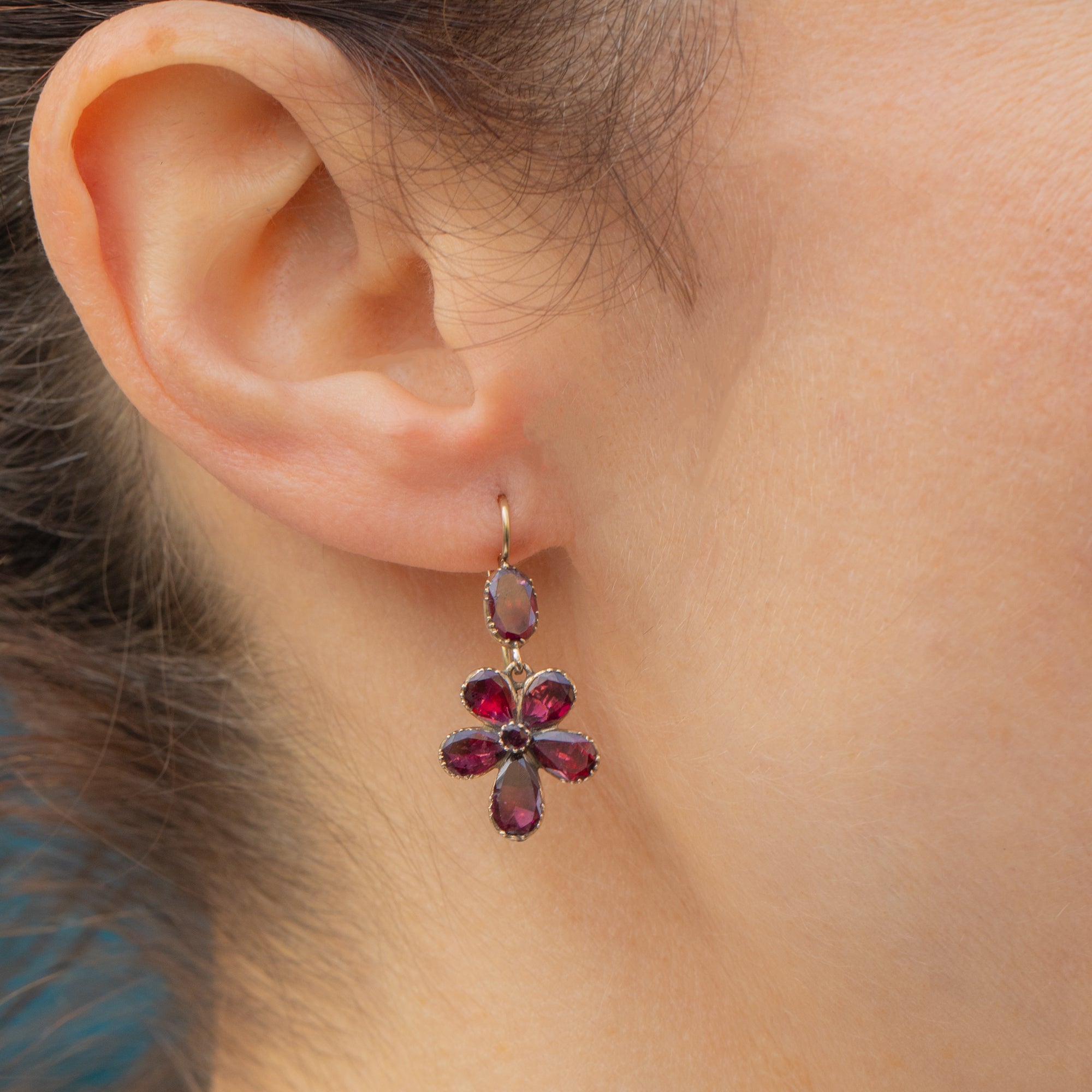 These pansy drop earrings have a lovely feminine antique charm, enhanced by the gentle movement they provide as they suspend from your lobes. Versatile and dainty, these Georgian Garnet earrings are a must-have!