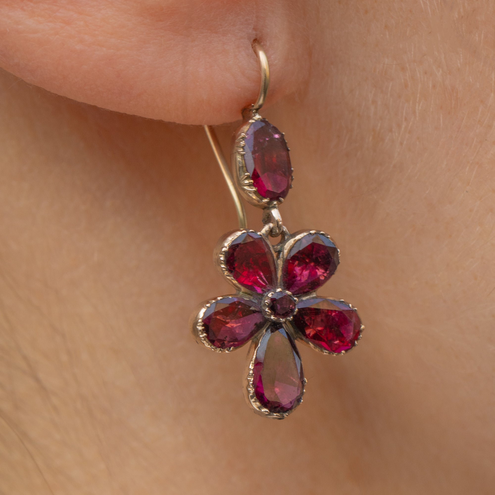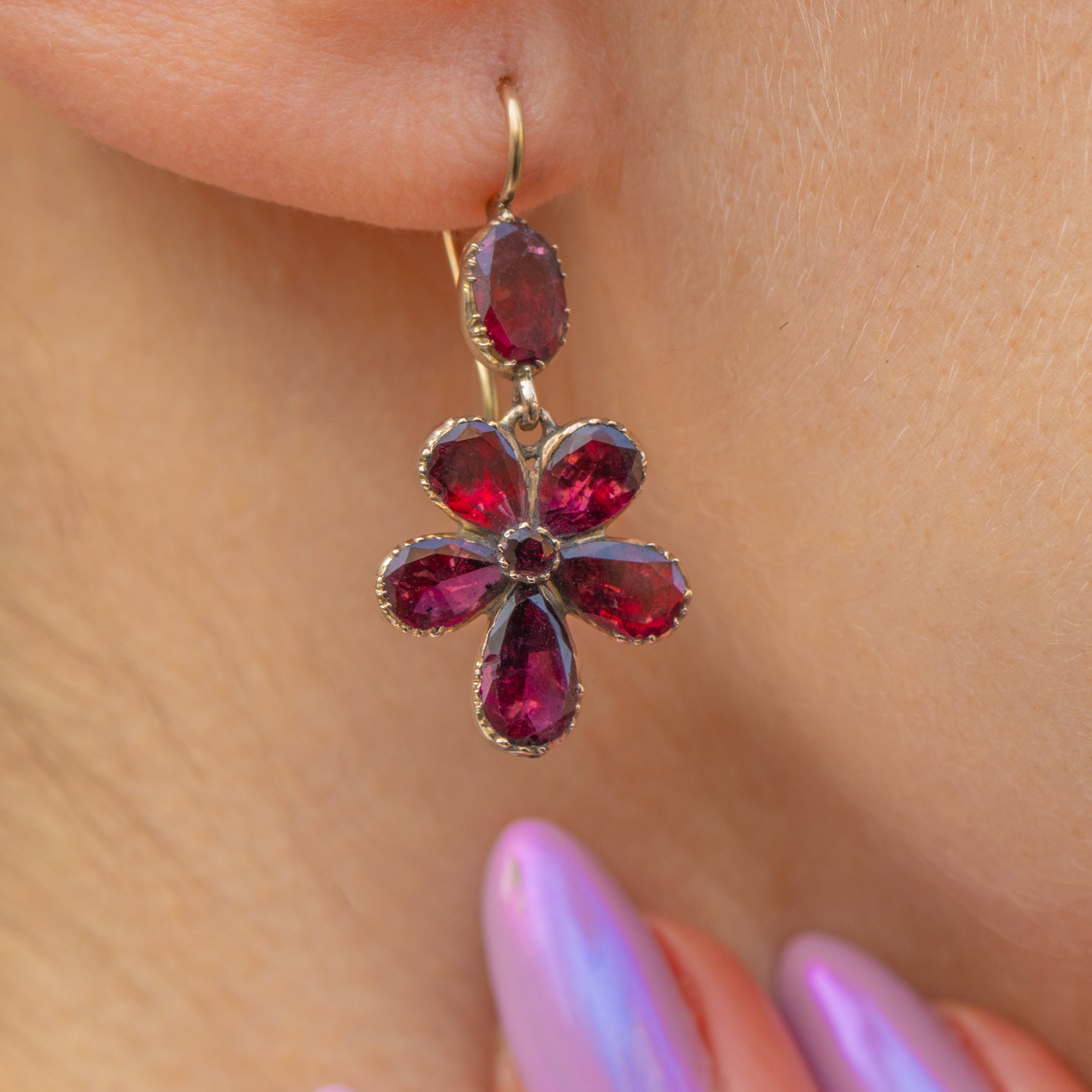These Georgian 9ct Gold Garnet pansy drop earrings are adorable!