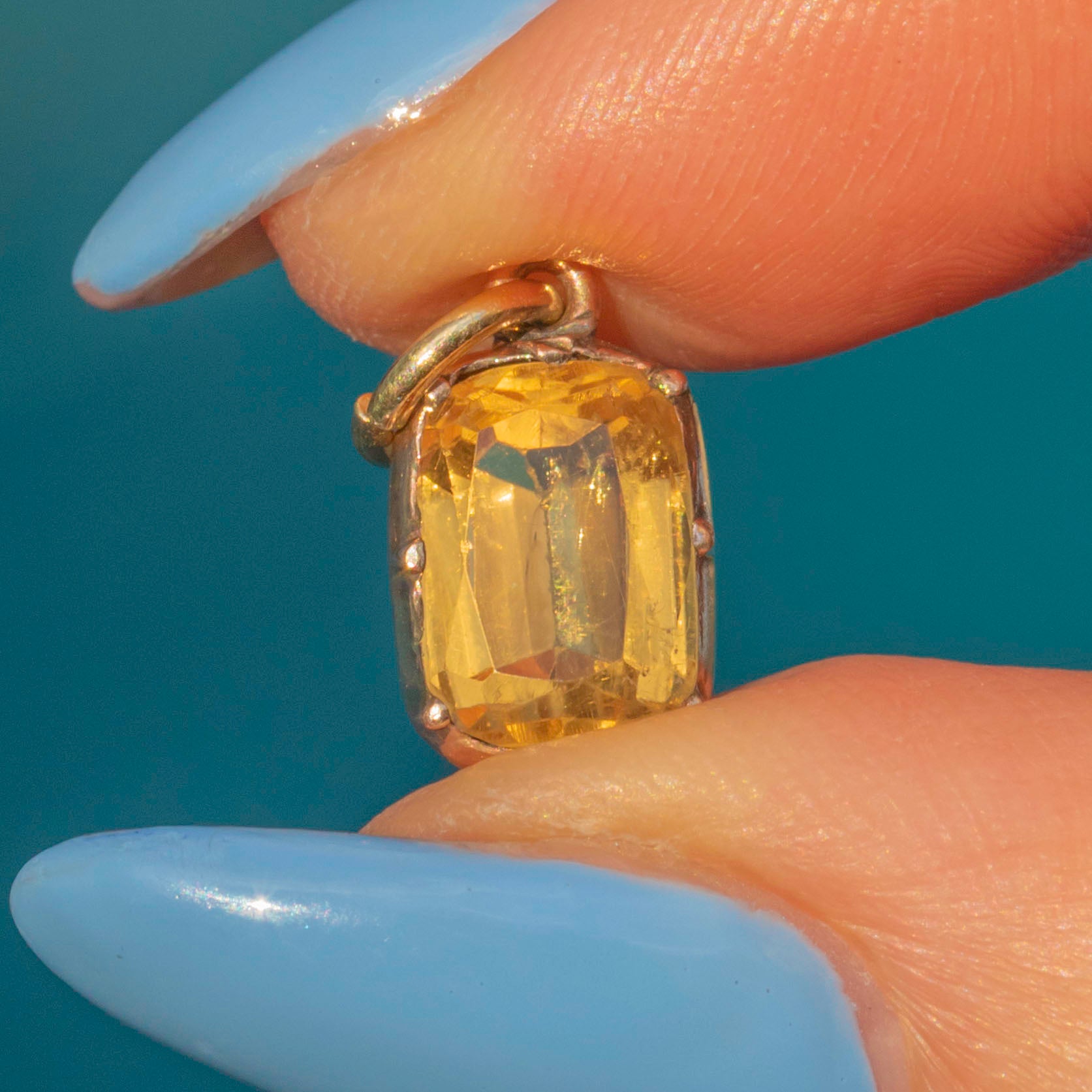 VERY GOOD: With not a whole lot to report, this Georgian 9ct Gold golden Topaz charm is looking remarkably good for her age. There are a few minor dings on her Gold setting, to be expected with a piece of her age, but they do not impair her wear or appearance in the slightest! The Topaz has a crisp set of facets with no chips or abrasions and is securely held within its setting.