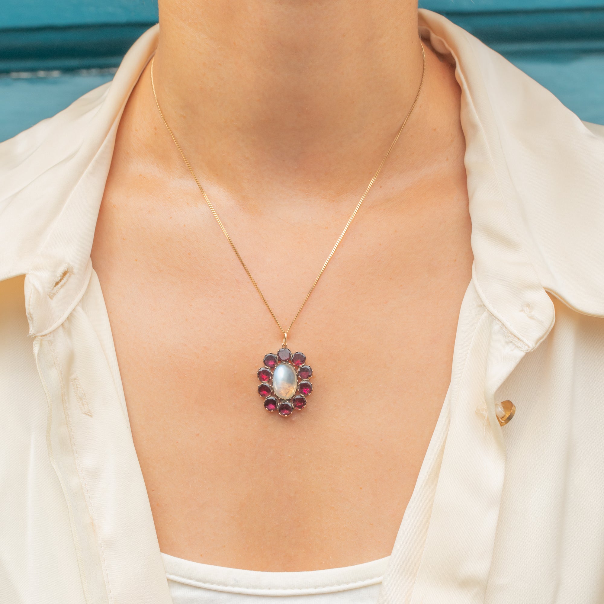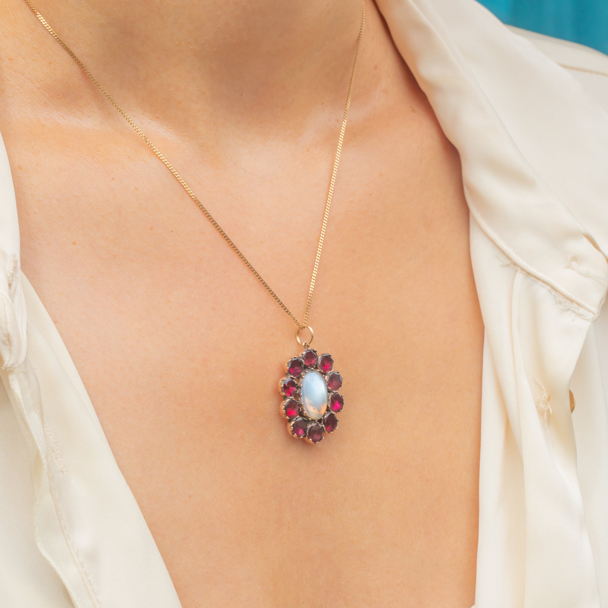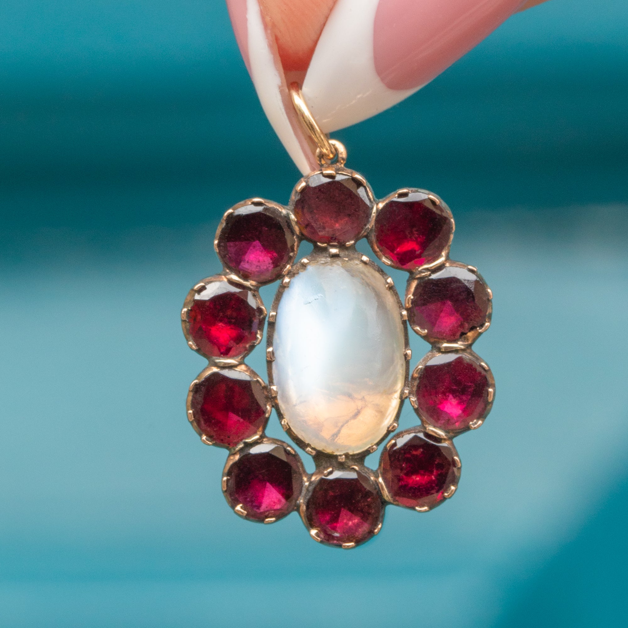 A Georgian pendant crafted in 9ct Gold, featuring a luminous Moonstone cabochon framed by a cluster of flat-cut Garnets.