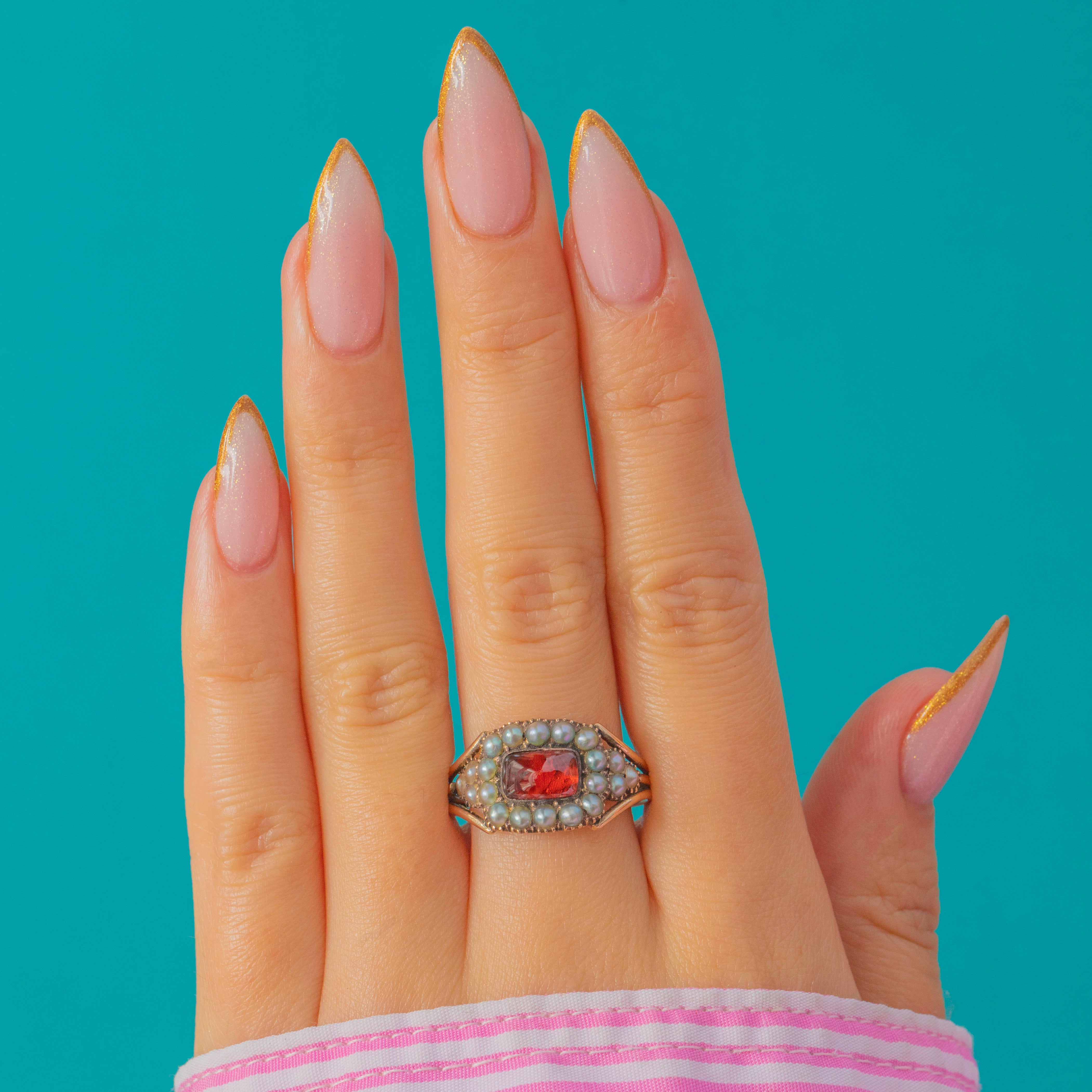 EXCELLENT: Circa 1820, this authentic antique Georgian ring is in outstanding condition for its age. The Garnet is free from chips or scratches and displays a rich, even colour. The Pearls retain their natural lustre with no damage or wear visible. A beautifully preserved antique ring of exceptional quality and charm.