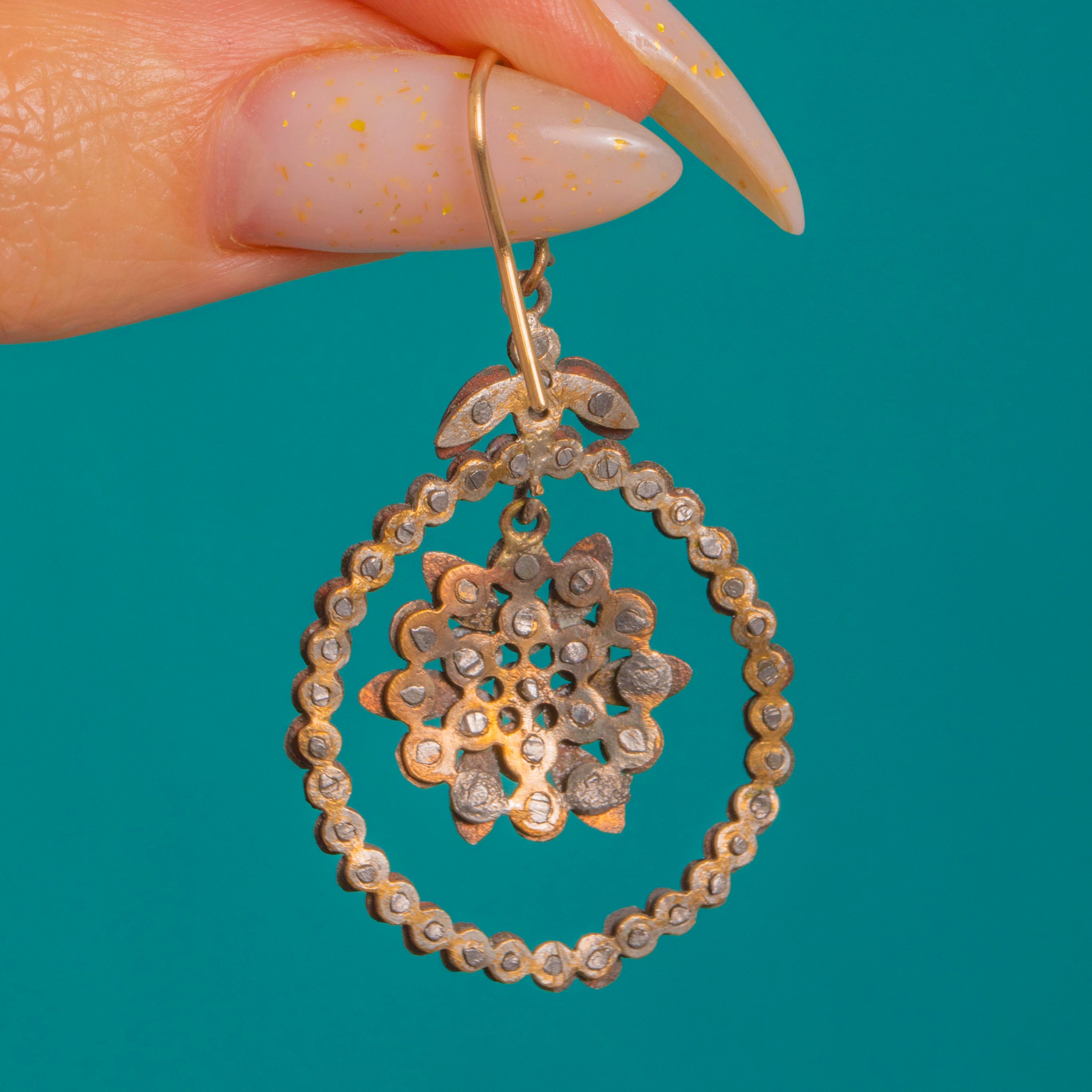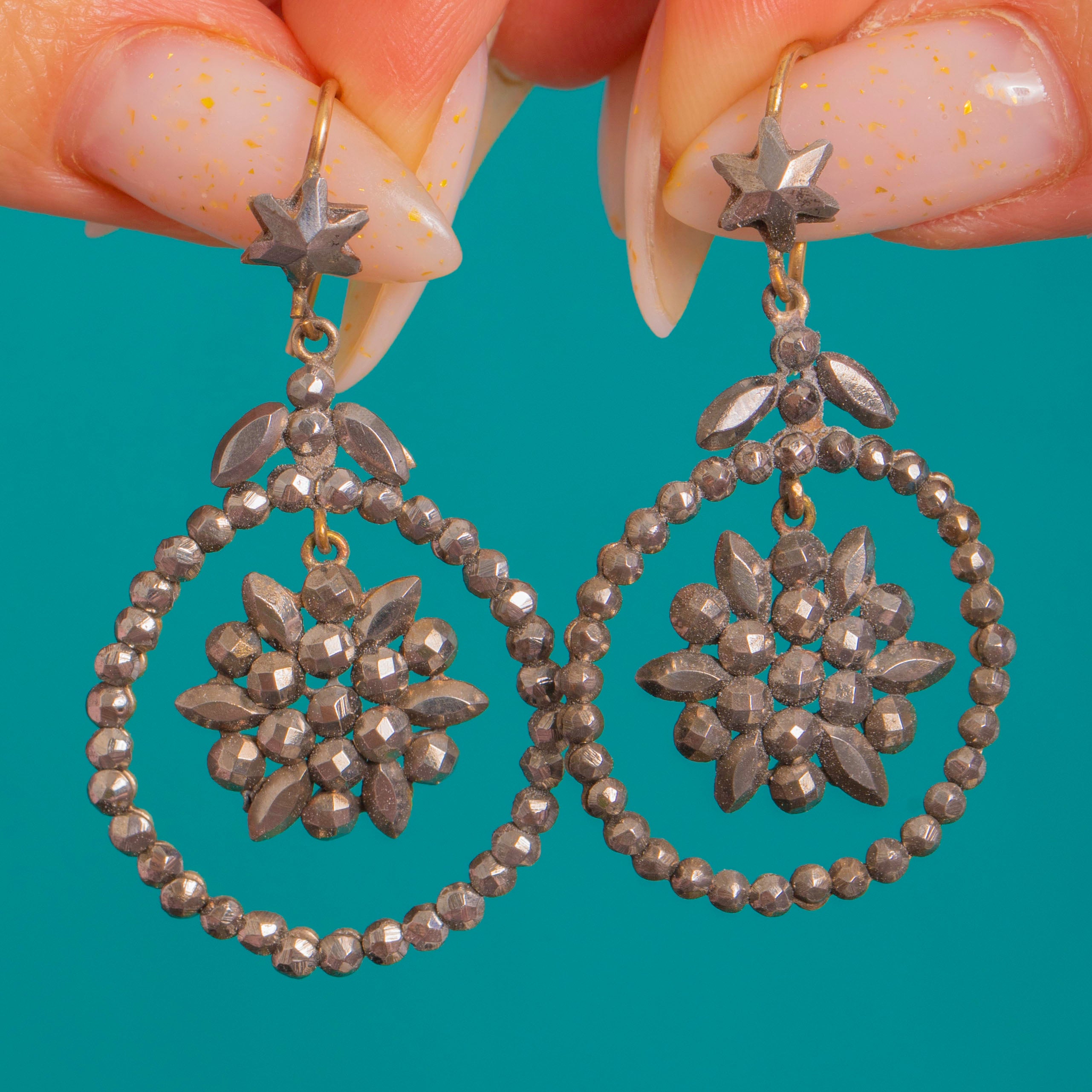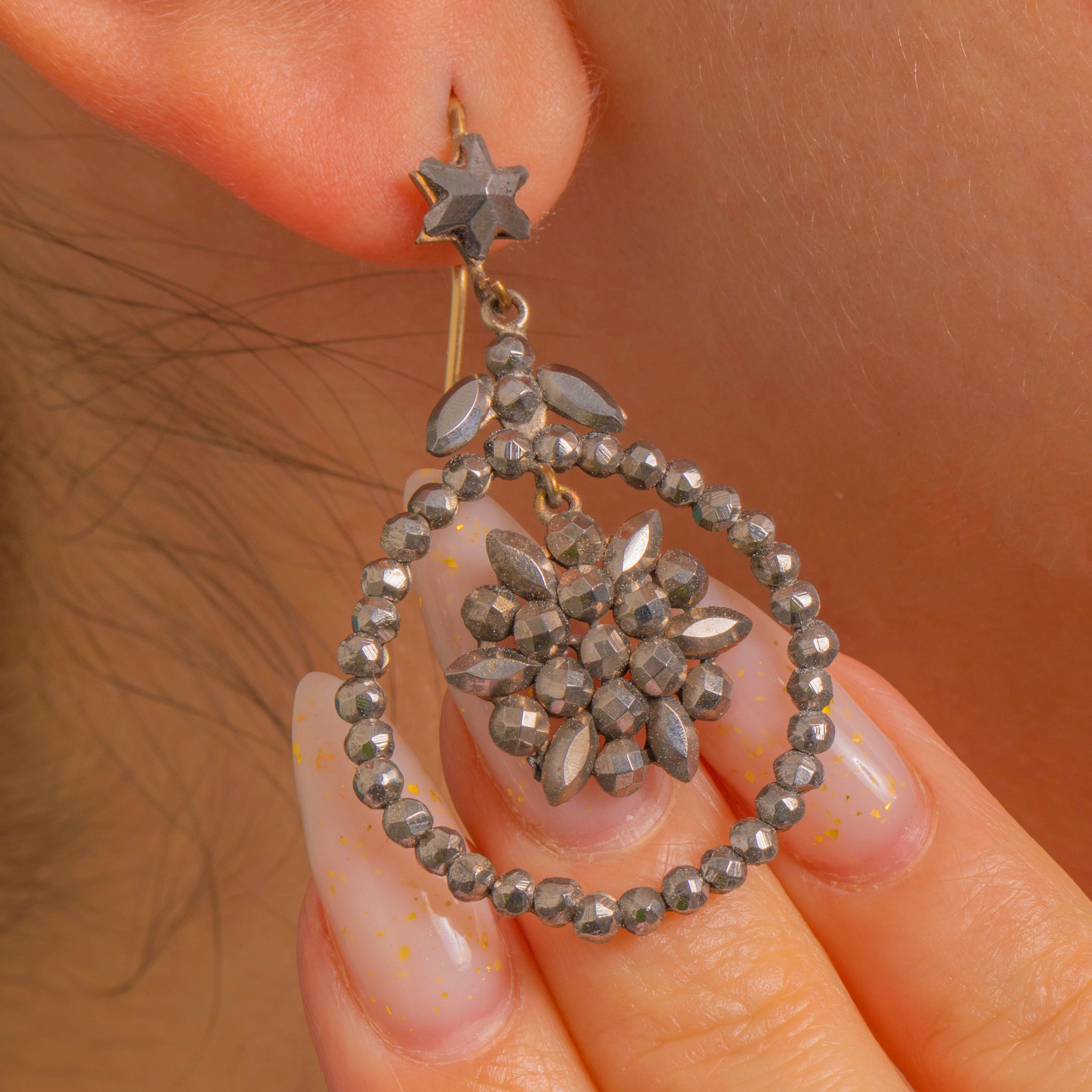 Georgian Cut Steel Star-Topped Drop Earrings, 15ct Gold hooks