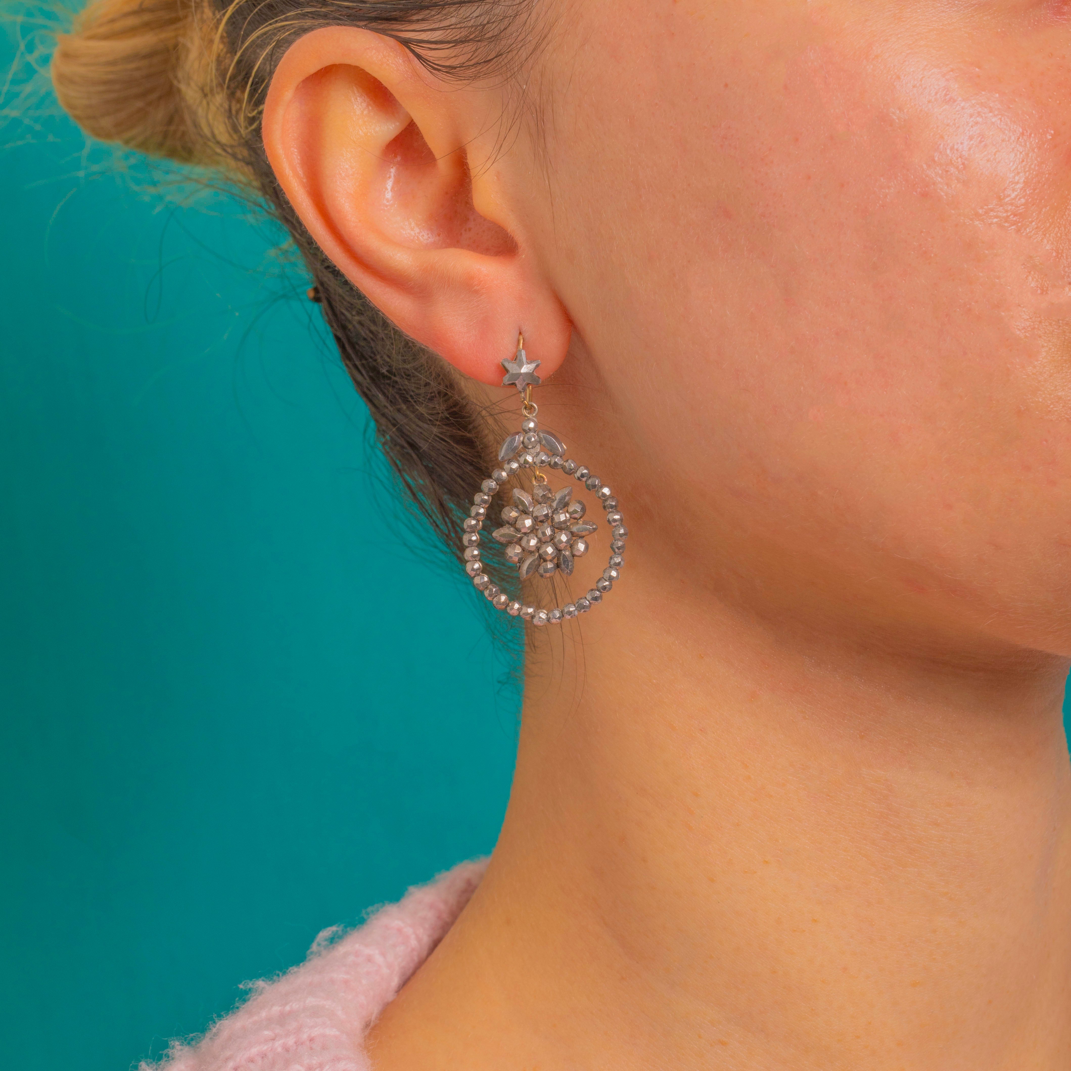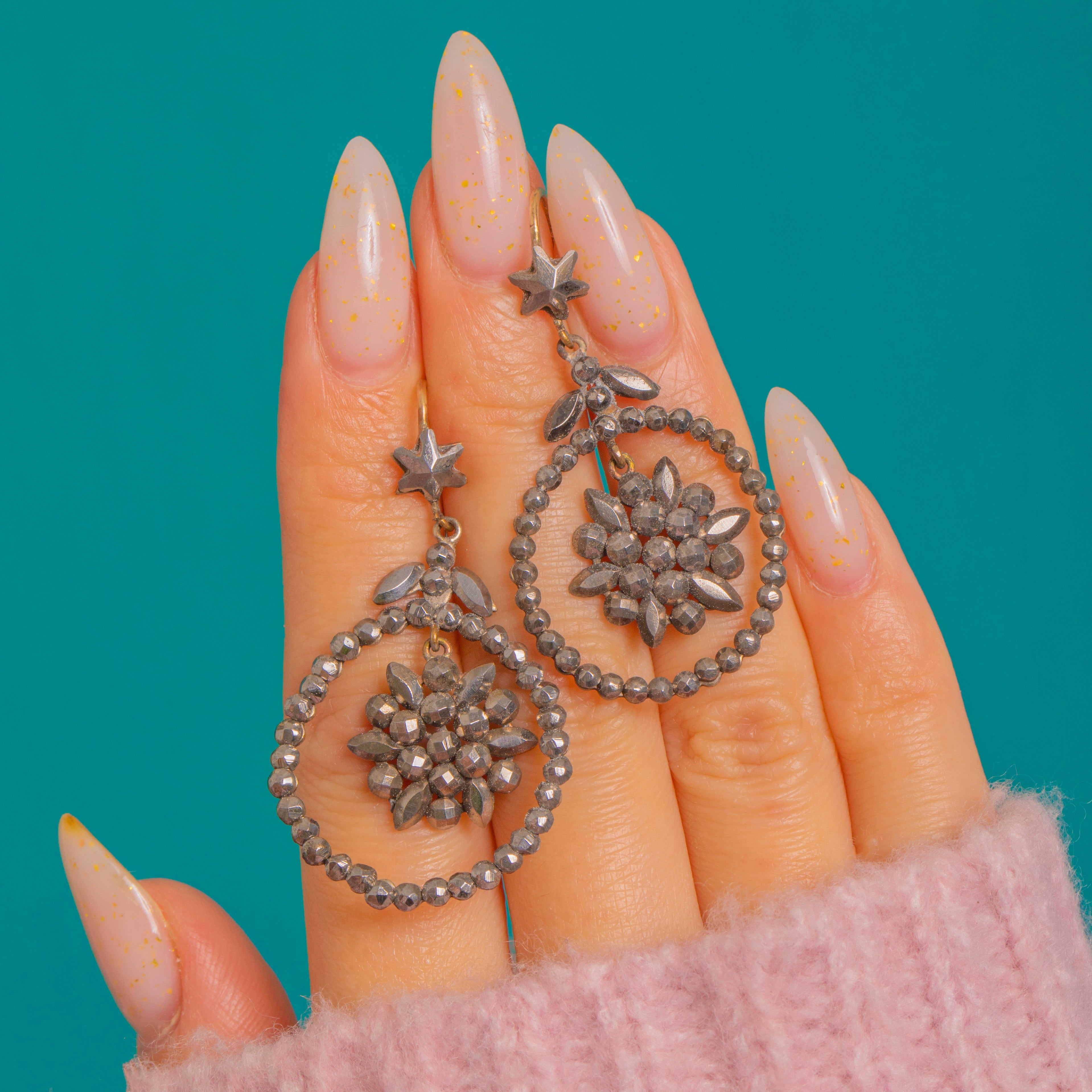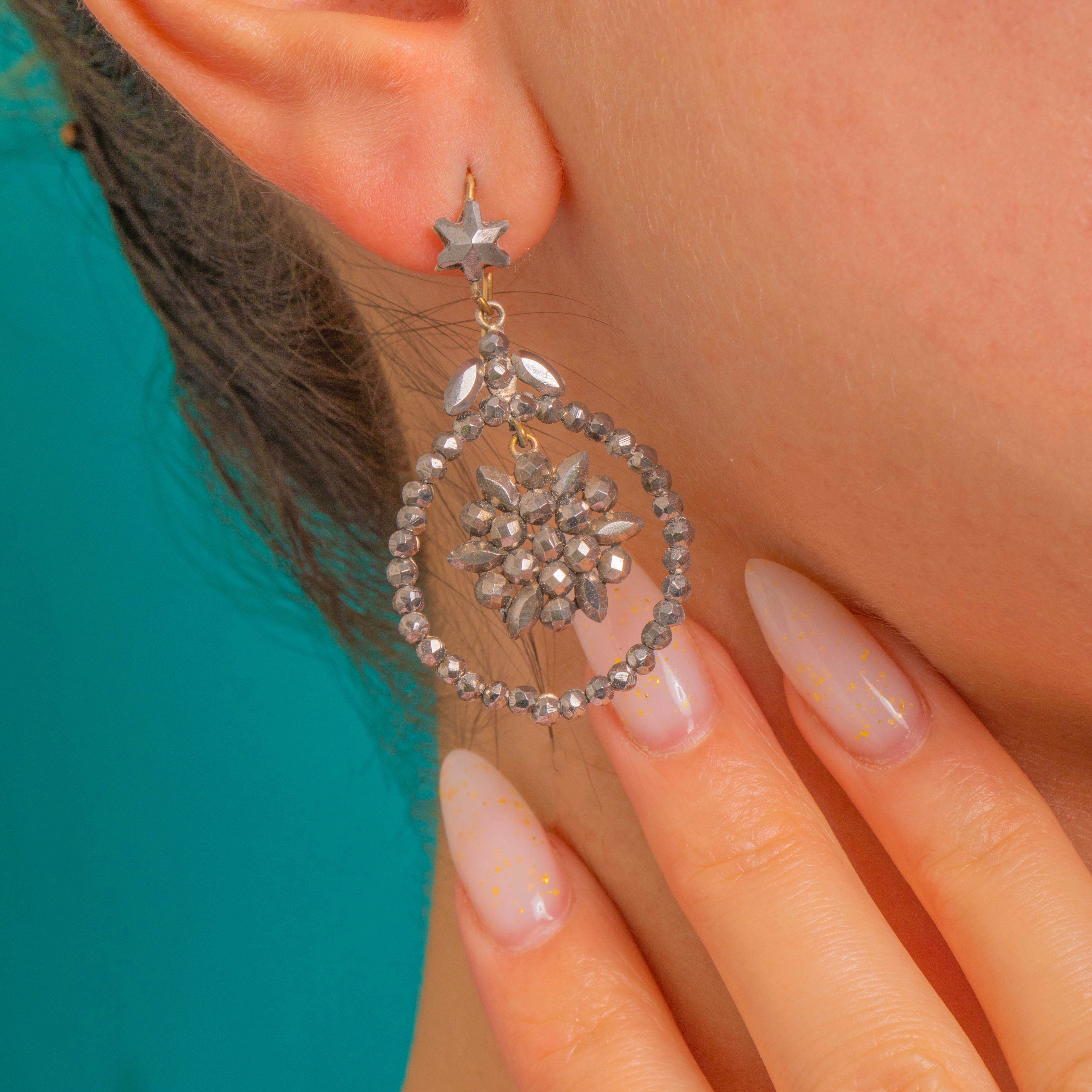 A matched pair of Georgian star‑topped drop earrings, c.1800, composed of articulated cut steel elements hung from 15ct Gold hooks. A small star motif crowns a foliate connector, leading to a beaded cut‑steel open hoop with a suspended central rosette of marquise and round cut steel petals.
