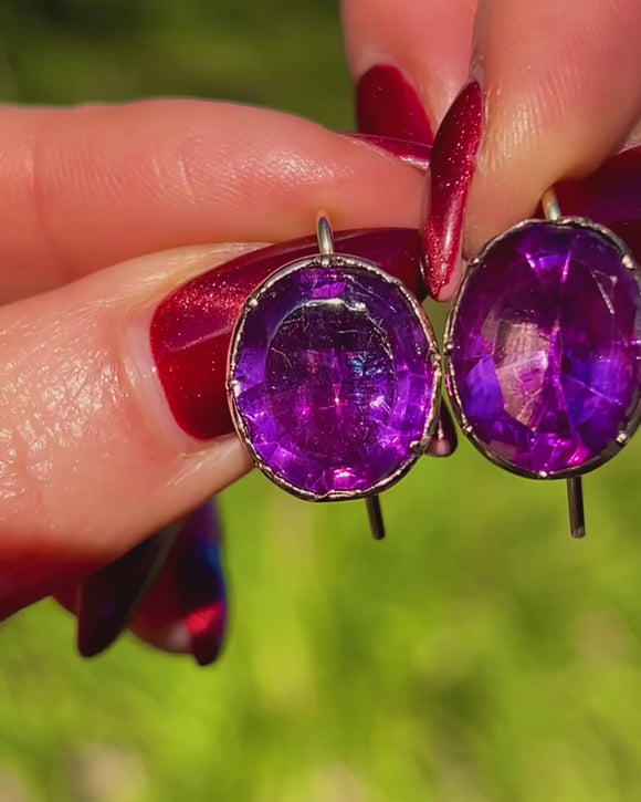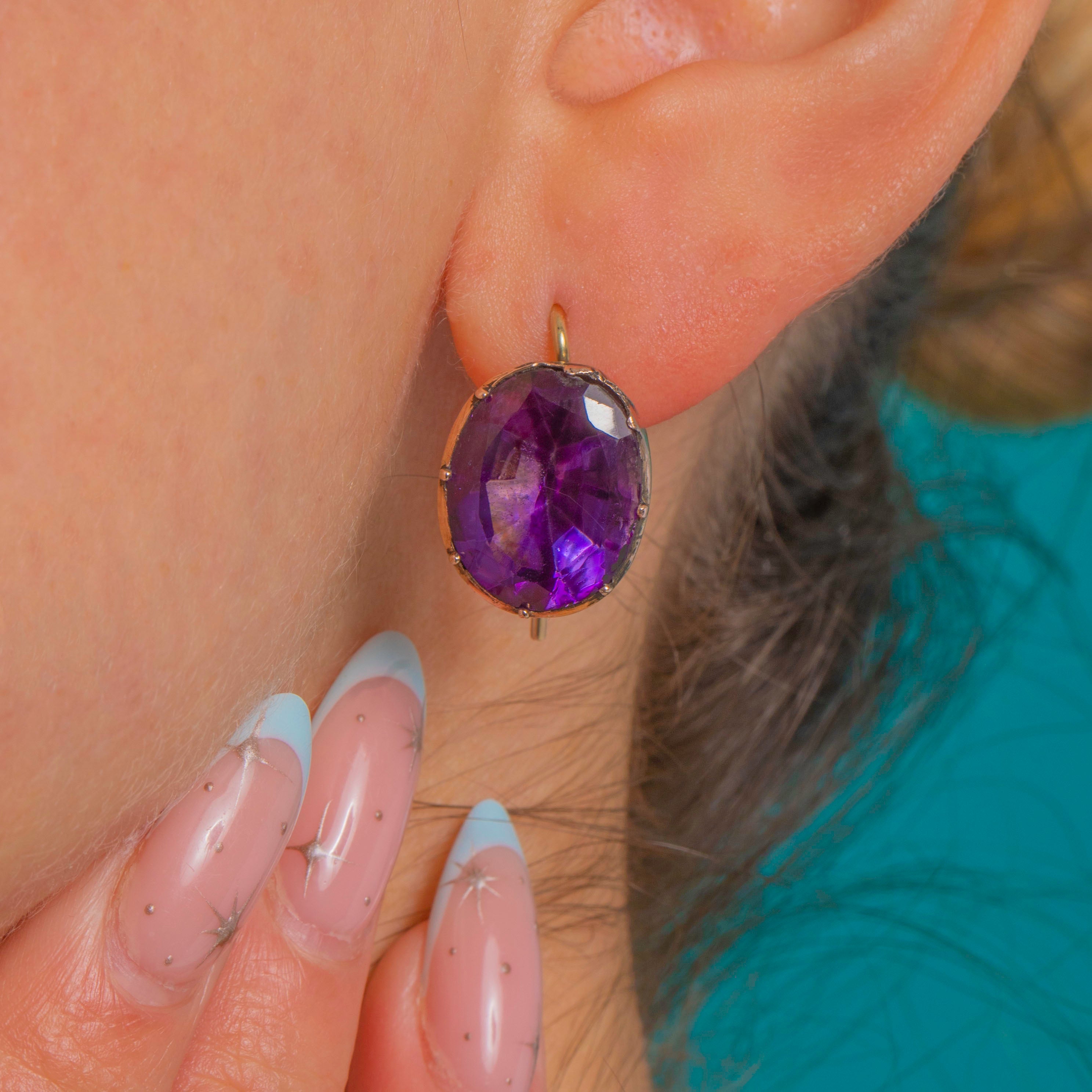 Saturated royal-purple glow meets early 19th-century craft in these Georgian foiled Purple Paste drop earrings. Each richly coloured oval is hand-faceted and secured in deep cut-down, piecrust collets for a bold, gem-forward silhouette that feels elegant and timeless.