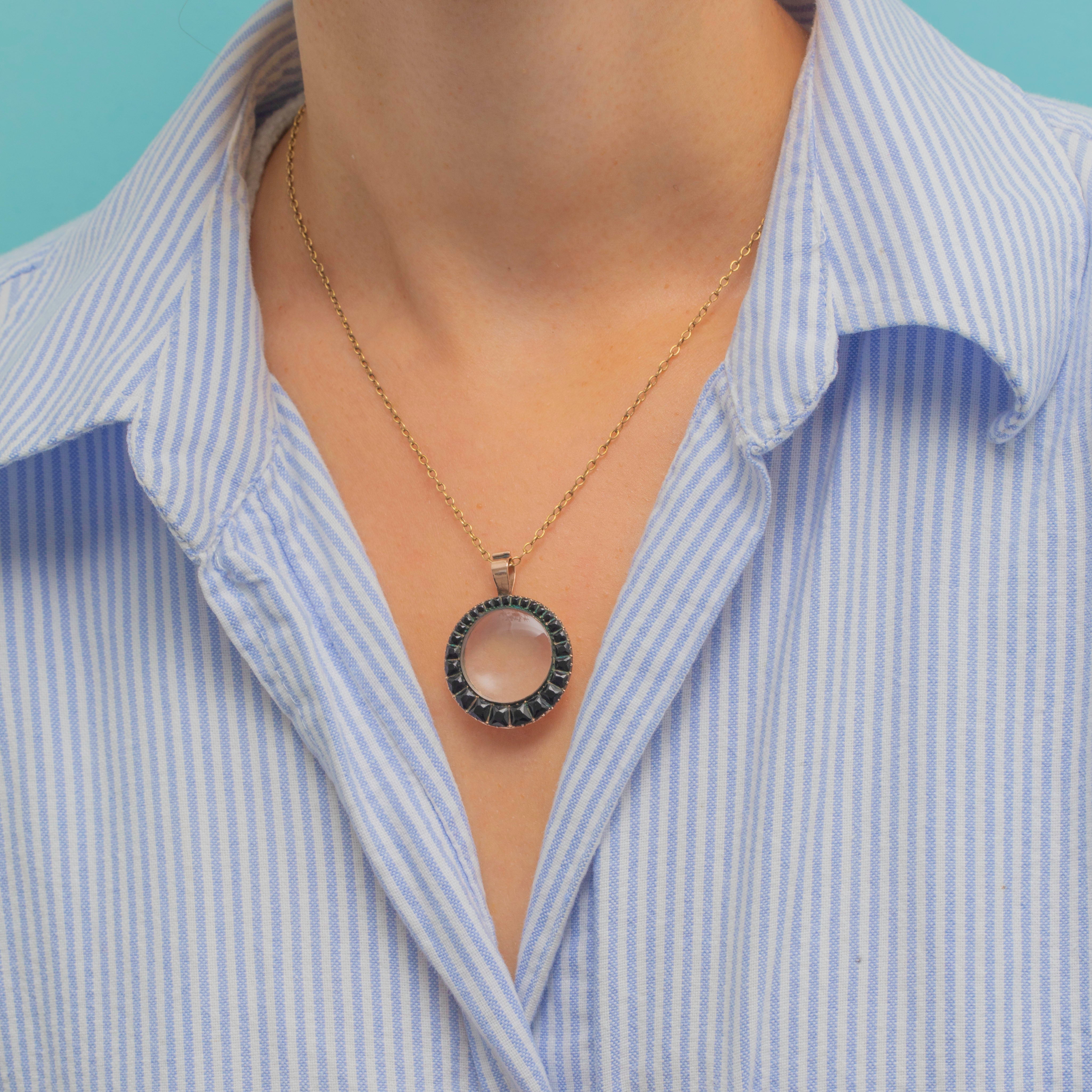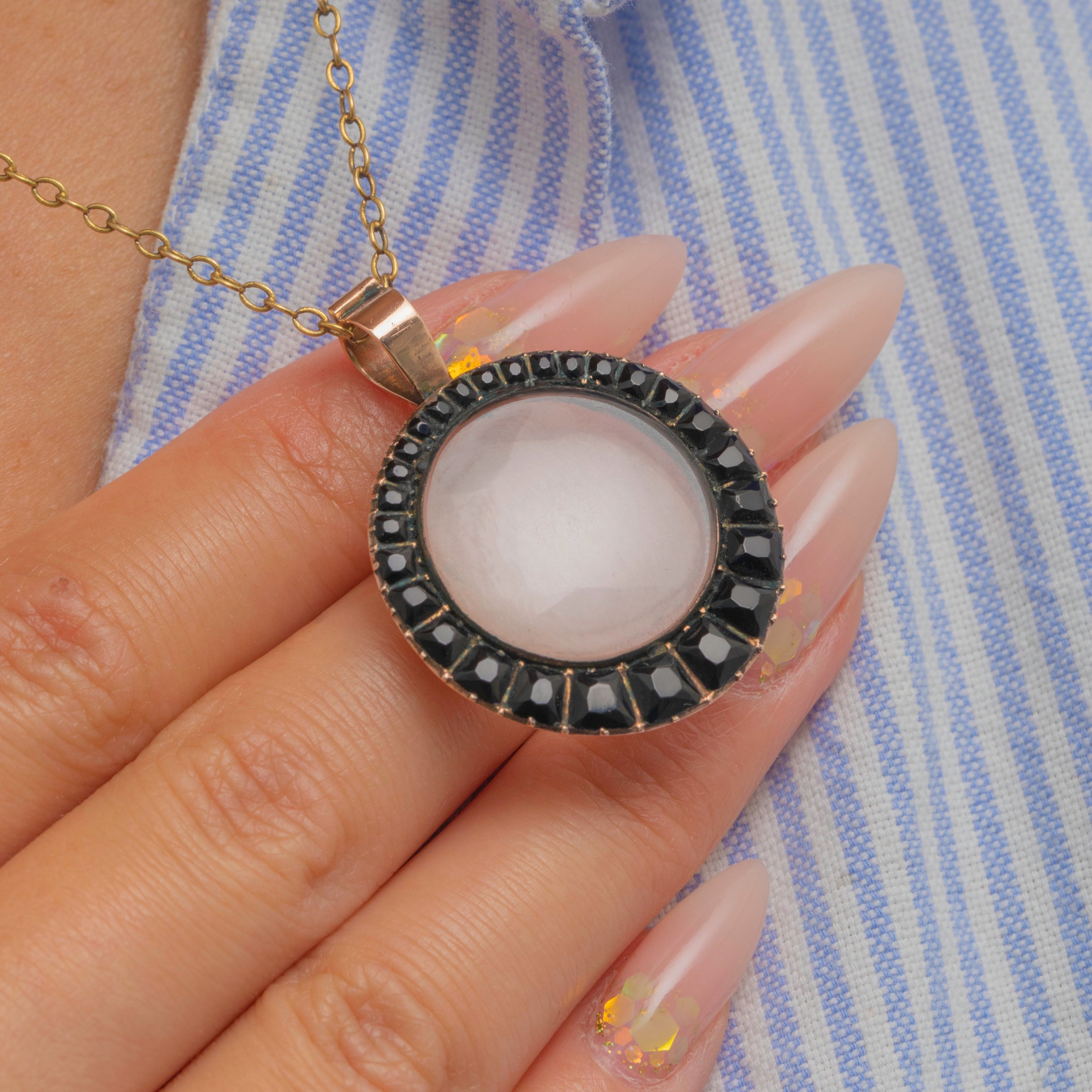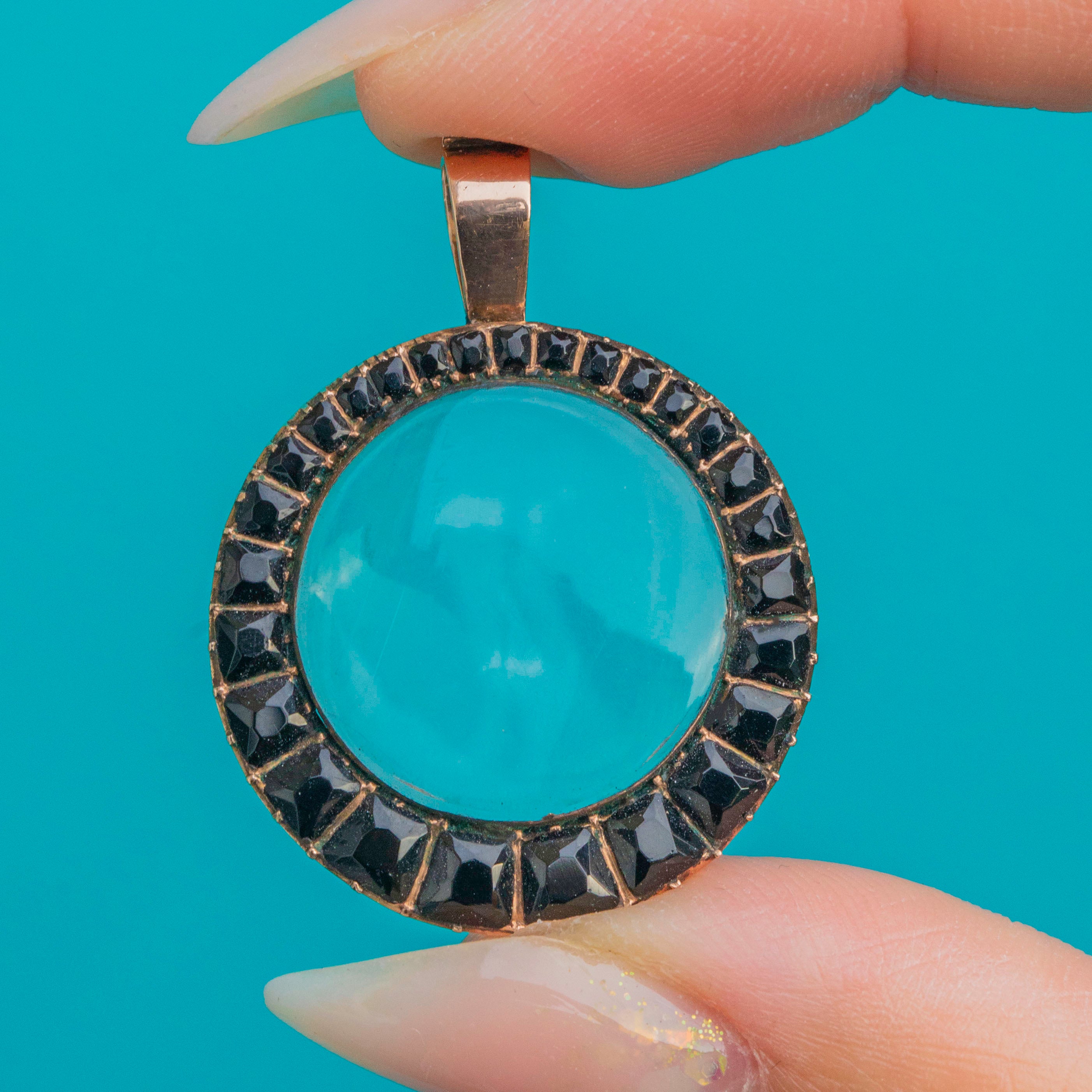 This remarkable Victorian mourning locket is crafted from solid 9ct Gold and inlaid with inky French Jet, a form of polished black glass much prized in the 19th century. The bold circular form is edged with graduated beads, creating a striking silhouette that reflects the light beautifully.