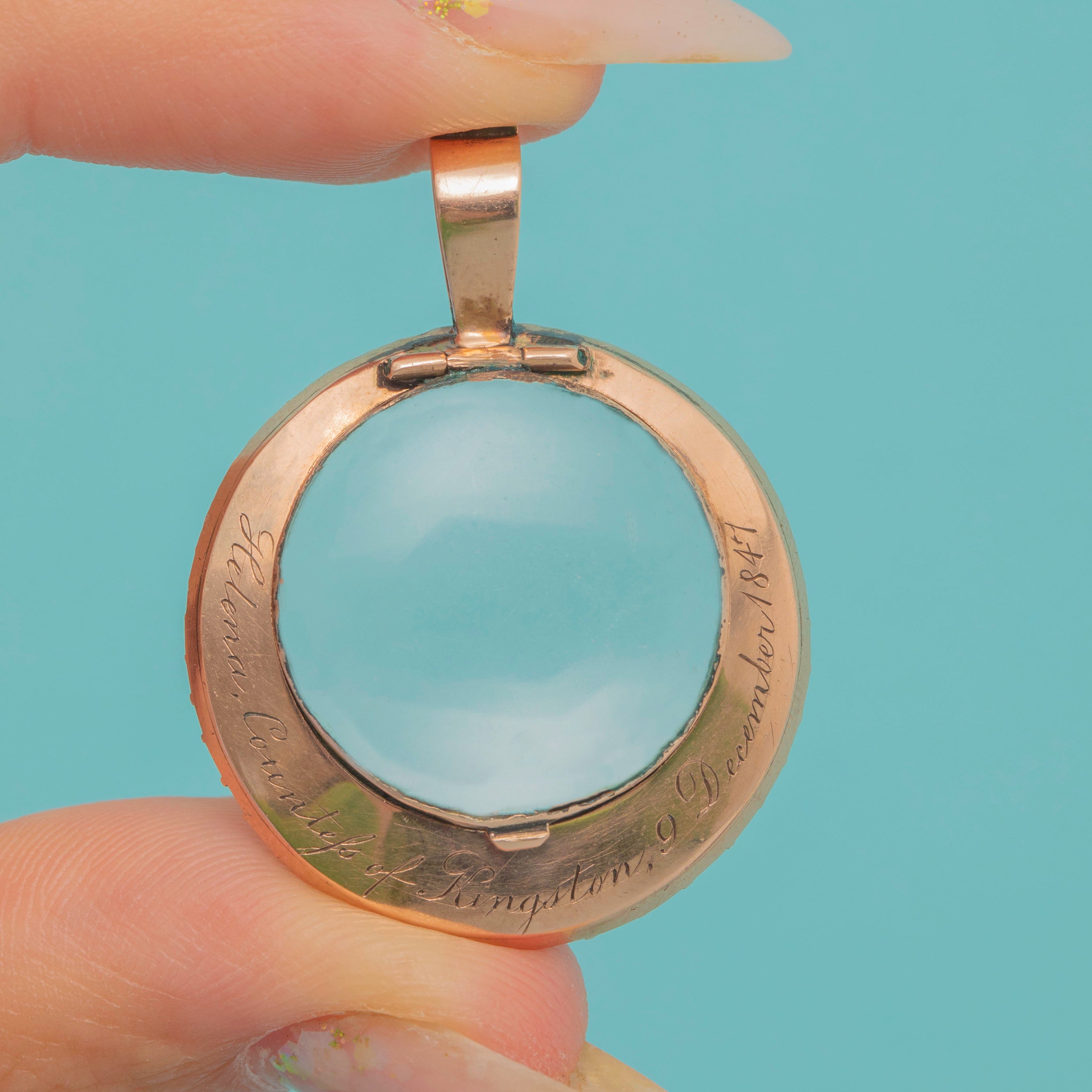 Inscribed to the reverse with “Helena Countess of Kingston, 9 December 1847”, this locket has both historical and sentimental significance. A superb example of Victorian mourning jewellery, it carries a touching personal story and remains in exceptional condition today.