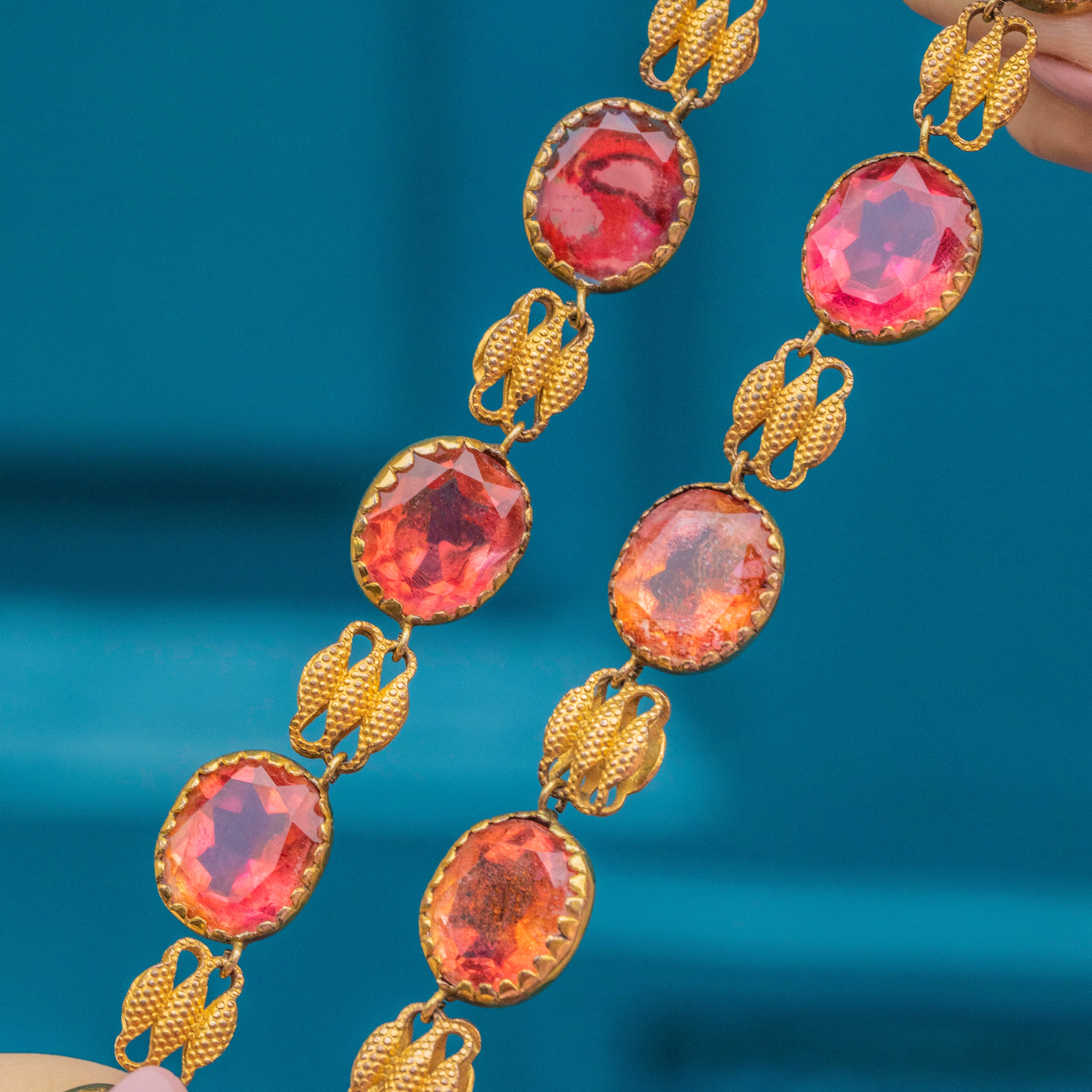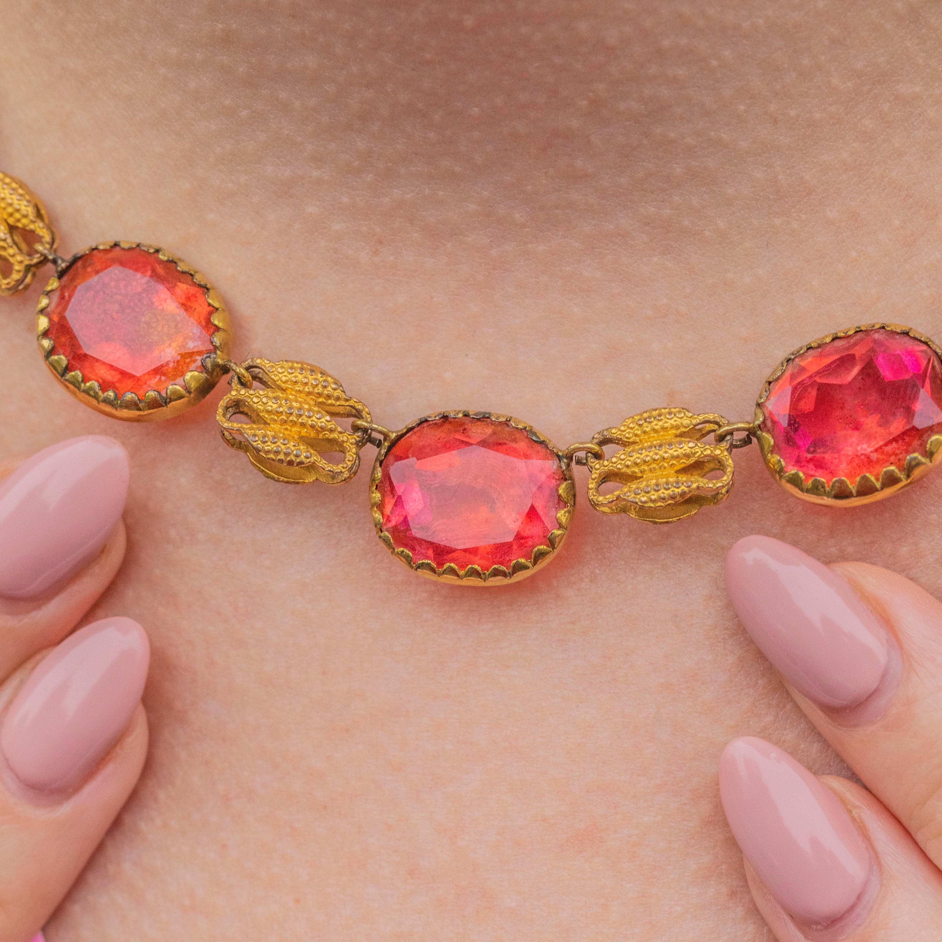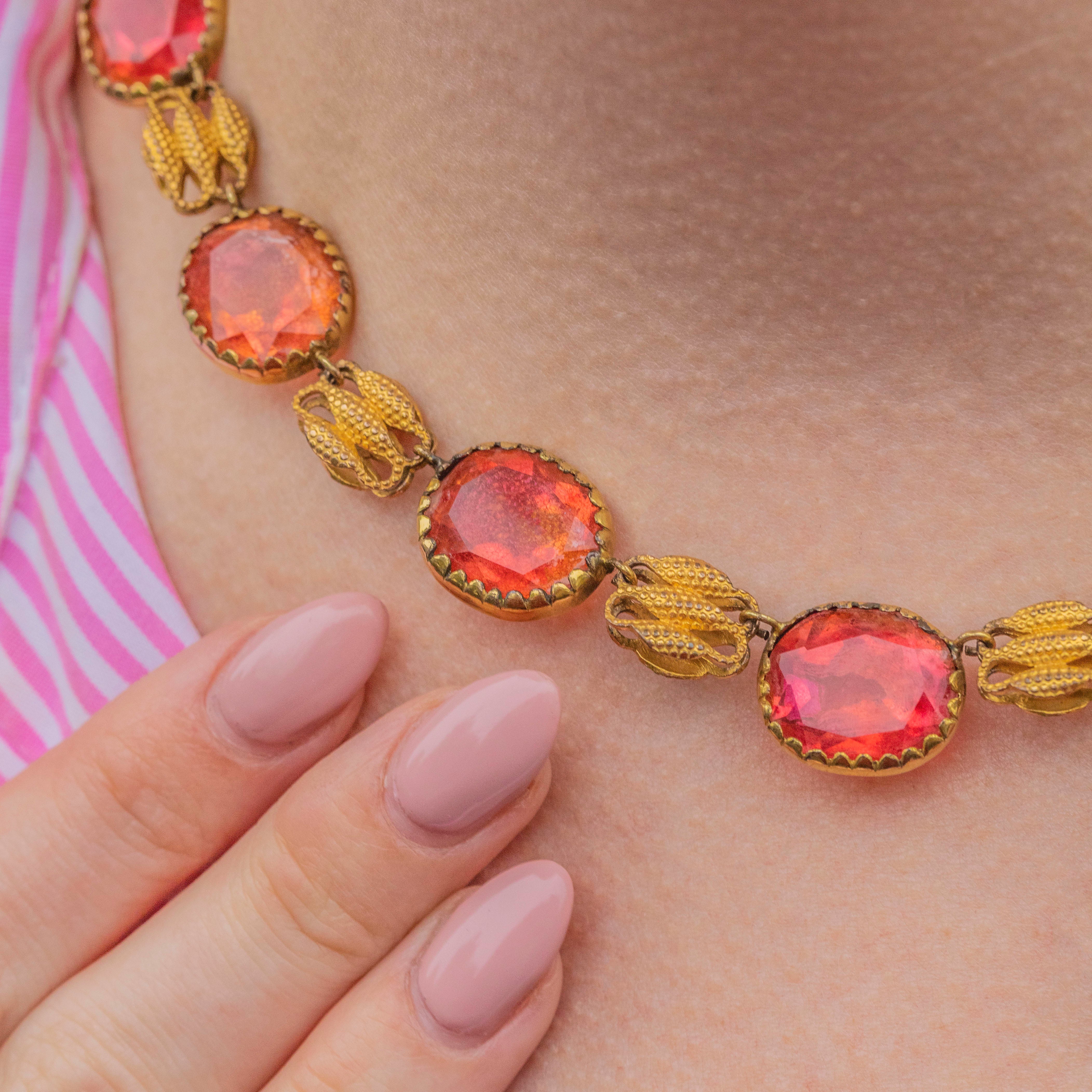This show-stopping antique necklace displays an array of gorgeous fiery orange-pink Paste gemstones, reminiscent of a warm summer sunset. The way her Paste gemstones have been formed is reminiscent of the much coveted 'Oil and Vinegar' technique - we love the way her vibrant stones flicker under the light, like glowing embers.