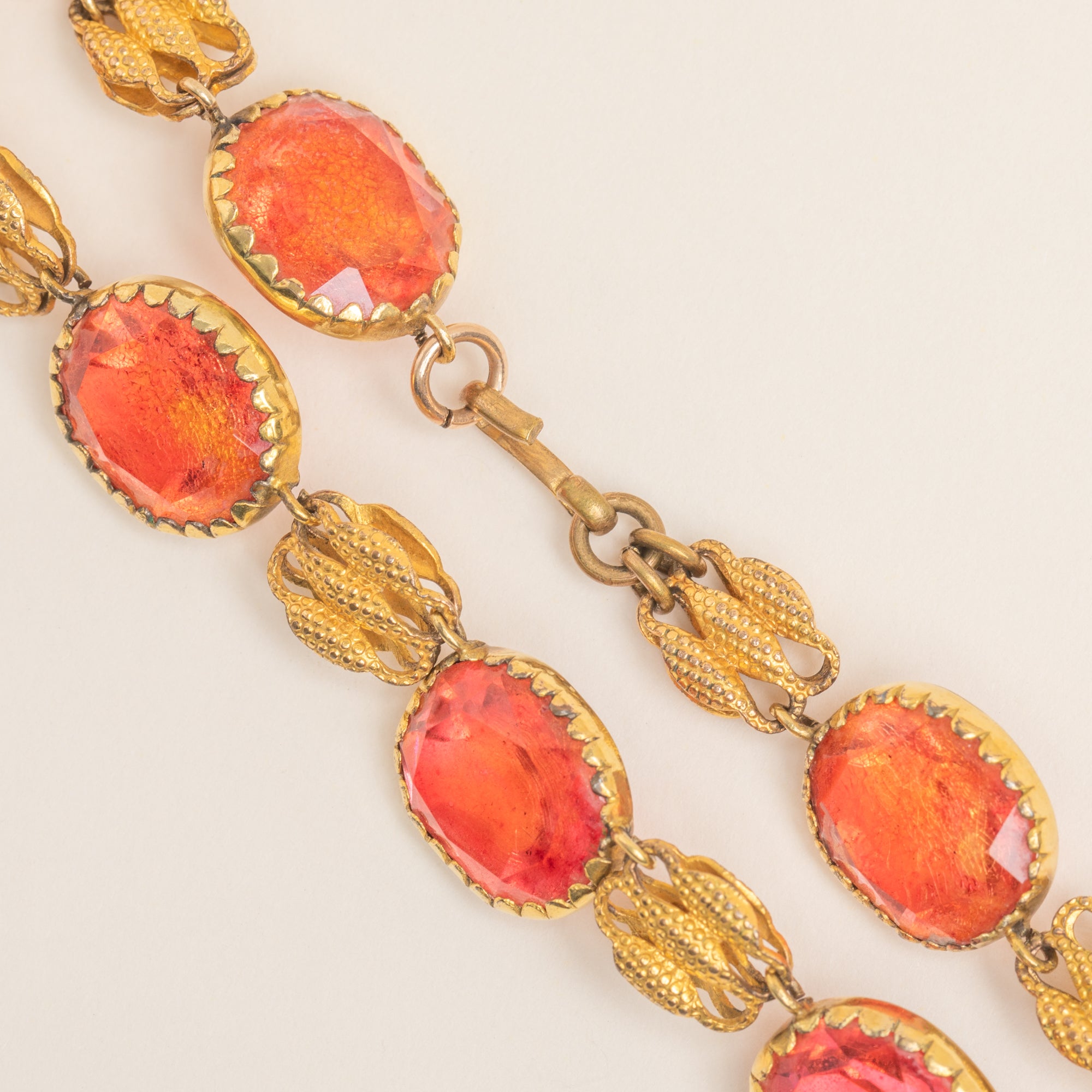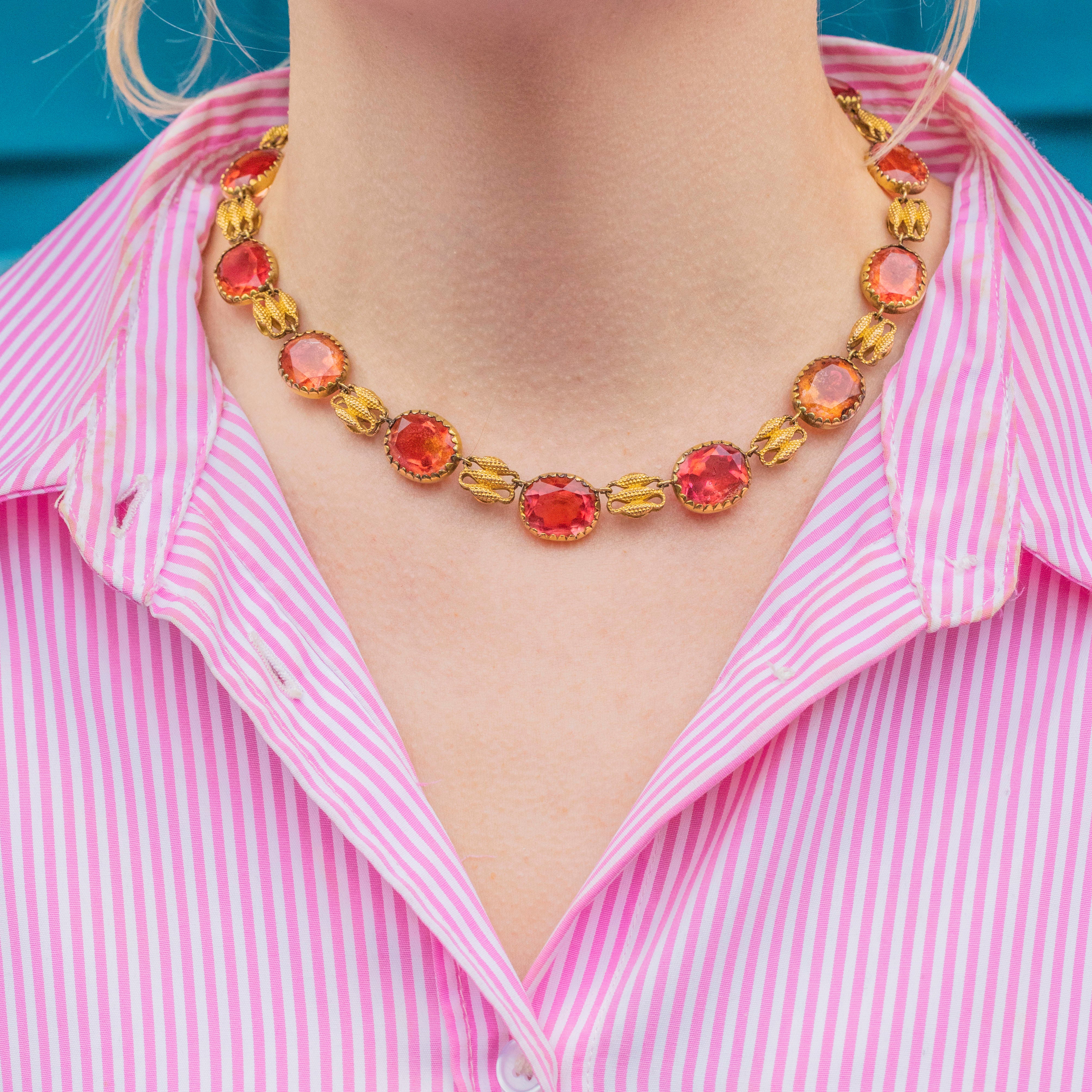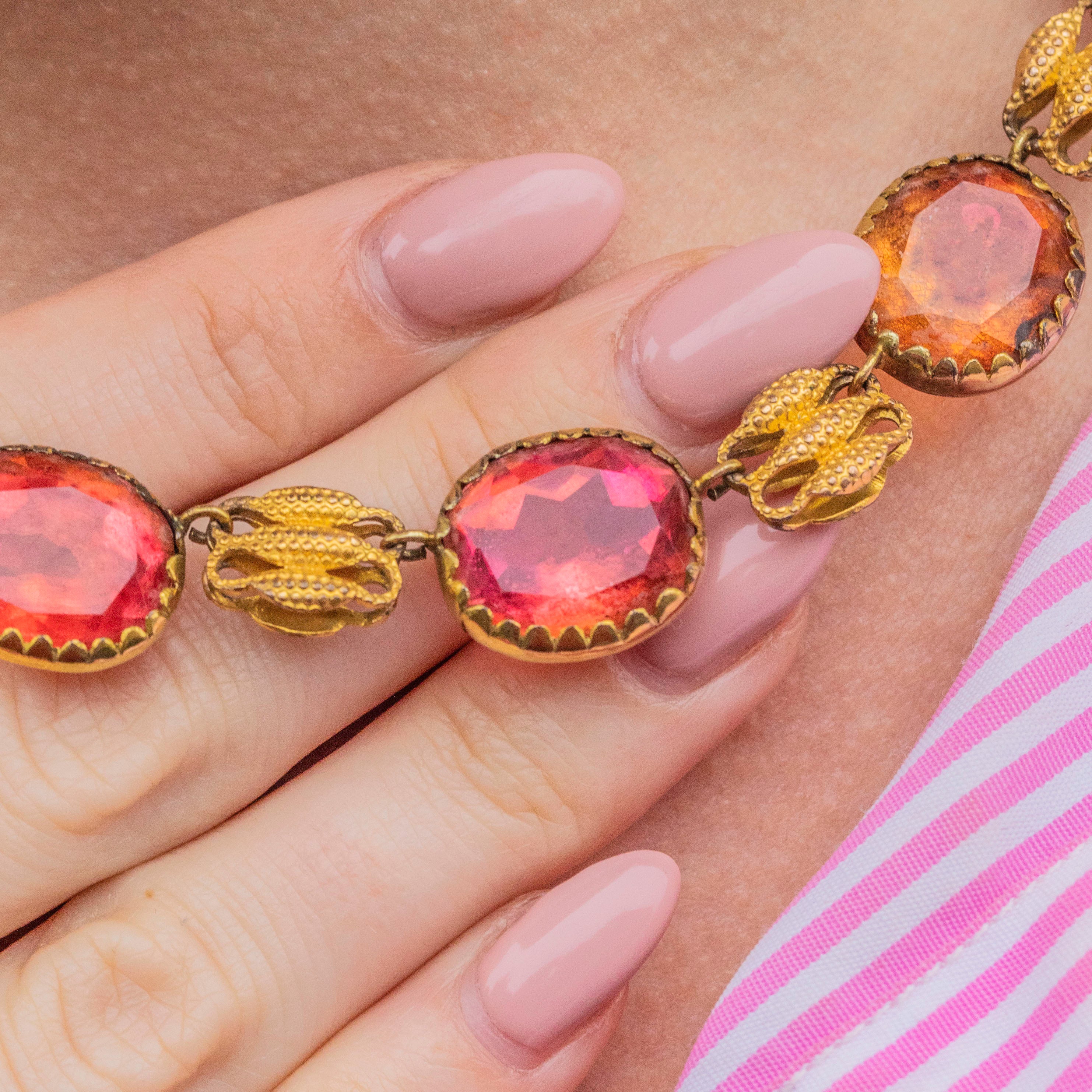 This show-stopping antique necklace displays an array of gorgeous fiery orange-pink Paste gemstones, reminiscent of a warm summer sunset. The way her Paste gemstones have been formed is reminiscent of the much coveted 'Oil and Vinegar' technique - we love the way her vibrant stones flicker under the light, like glowing embers.